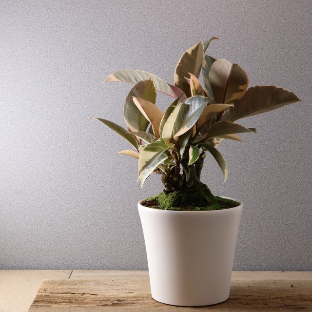 『フィカス ティネケ』【送料無料】 ゴムの木の中でも、ひときわ目を引く美しい葉模様が魅力のフィカス・ティネケ。 クリームホワイトと淡いグリーンが織りなすマーブル模様は、まるで絵画のような品のある美しさで、空間に洗練されたアクセントを与えてくれます。日々の成長とともに、葉色や模様の出方が少しずつ変化していくのも楽しみのひとつ。 こちらは土を覆う苔とコンパクトなサイズがまるで盆栽のような雰囲気のひと鉢。 和にも洋にもあうので、インテリアのひとつに。 植物サイズ H 40.cm W 26cm 鉢サイズ H 15㎝ 外径 15cm ⚫︎管理方法 置き場所 • 明るい室内で管理。直射日光は葉焼けの原因になるため避けます。 • 日陰にも強いですが、光が不足すると葉の斑が薄くなることがあります。 水やり • 春〜秋(生育期):土の表面が乾いたらたっぷりと与えます。 • 冬(休眠期):控えめに。水やりを減らし乾燥気味に管理。 温度 • 生育適温:15〜28℃ • 10℃以下の寒さには弱いため、冬は室内で保護してください。 【送料無料】北海道、沖縄へ発送の場合は1,000円いただきます。 ※こちらの商品は一点ものです。生長による変化などで画像と異なることがありますが、商品の特性上、ご了承くださいますようお願いいたします。 ※当サイトに掲載している商品は、実店舗でも同時に販売しております。 その為、サイトよりご注文を頂いた時点で稀に店舗にて完売してしまい欠品してしまう場合がございます。 在庫管理は、できる限りリアルタイムな更新を心がけておりますが、万一欠品の際はご了承下さい。