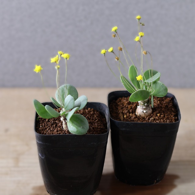 黄色い花の灌木コーデックス『オトンナ ユーフォルビオイデス』【送料無料】 こんもりとした独特の株姿が特徴のオトンナ。 低木に育つ中型のタイプで30〜40センチほどの高さにしかなりません。 主幹から複雑に枝を分岐させ、密につまった樹形をしています。 小さな株のうちは、表皮が黄金色のワックス状の硬い表皮をしていて滑らかな質感をしていますが株が成熱し古株になってくると、表皮がまるで焼け焦げたような色となり、ガサガサとざらついた質感となります。 太い枝の先端からは小さな葉を生やします。 葉は青白く、表皮の黒い色とのコントラストが見事です。 また、枝の先端付近にはトゲのような針のようなものがびっしりと生えています。 花は小さな黄色い花を咲かせますが、極寒期を除く、年間を通して咲く傾向があります。 ⚫︎管理方法 【置き場所】 成長期である秋から春にかけては、直射日光のあたる明るい場所で管理し日光が不足すると枝や葉が徒長しやすくなります。 とくにオトンナ・ユーフォルビオイデスは日光が不足すると根腐れを起こしたり、株が弱ります。 成長期は極力長時間、日光があたるようにしてください。 雪が常に降り積もっているような厳冬地を除いて屋外でも管理可能ですが、その際は雨や雪が直接かからない場所で管理しましょう。 また冷たい風が常に当たる場所だと、いくら冬型とはいえ葉が枯れ込んだり落ちる場合がありますので注意しましょう。 休眠期である夏は少し遮光をして、風通しの良い涼しい場所で管理します。 【水やり】 成長期の春と秋は土が完全に乾いてから水やりします。 その際は天気の良い日に水やりするようにしましょう。 オトンナ・ユーフォルビオイデスは極度の乾燥地帯に自生しています。 徒長させないように水やりはやや辛めにしましょう。 春から初夏にかけて葉が落ち始めたころから徐々に水を控え、夏は断水味に管理します。 ただし休眠中も月に数回、霧吹きなどで株と用土と軽く湿らせると、の枯死が防げ、秋以降の立ち上がりが良くなる場合があります。 その場合は涼しい日の夜間にごく少量のみ水を与え、朝までにはほぼ乾いている程度にしましょう。 オトンナ・ユーフォルビオイデスは涼しくなってくると徐々に葉が芽吹がしてきますので、その頃から少しづつ水やりを開始します。 その際もいきなりたくさん水をあげると腐りやすいので、水やりは少しつ開始します。 植物サイズ H 14cm W 10.5cm 鉢サイズ H 6.5㎝ 外径 6cm 【送料無料】北海道、沖縄へ発送の場合は1,000円いただきます。 ※ 同等のものをお送りしますが個体差がございます。又、画面の色の設定により実際の色味と異なる場合がございます。商品の特性上、ご了承くださいますようお願いいたします。 ※当サイトに掲載している商品は、実店舗でも同時に販売しております。 その為、サイトよりご注文を頂いた時点で稀に店舗にて完売してしまい欠品してしまう場合がございます。 在庫管理は、できる限りリアルタイムな更新を心がけておりますが、万一欠品の際はご了承下さい。