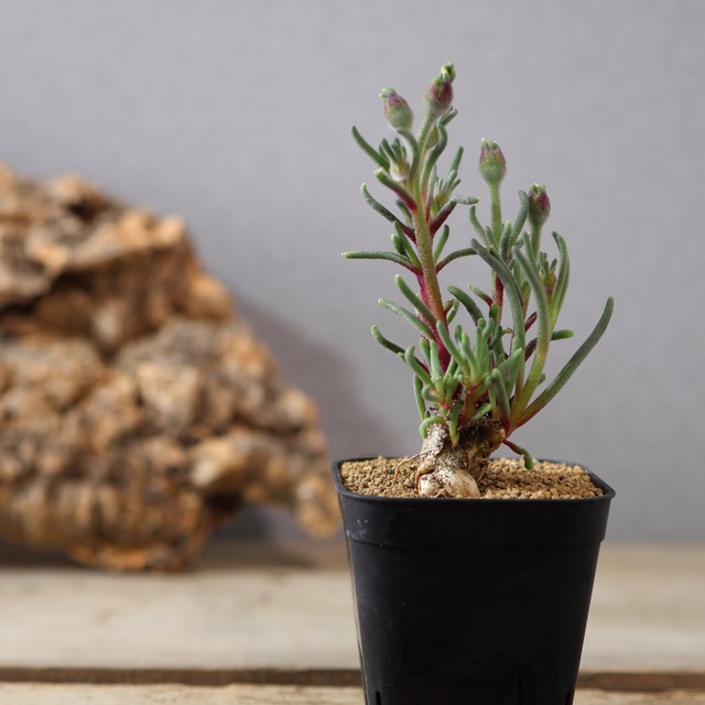 『フィロボルス テヌイフロルス』【送料無料】 木質の塊根をもった小型のメセンで、成長しても塊根は5-6cmほどの大きさにしかなりません。 でっぷりと太った塊根からはメセンの仲間らしい葉を伸ばします。 塊根はややコルク質で、年月を経るにつれ少しづつヒビ割れが入り、徐々に風格が出てきます。 成長期の盛りを過ぎたころ、直径40mmほどの花を咲かせます。 種小名の“繊細な花”というどおり、非常に花弁の細かいキクのような黄色い花を咲かせます。 塊根も葉っぱも花も美しい素晴らしい植物ですが、成長はゆっくりで、塊根部分はなかなか大きく育ちません。 もともと小型の植物なので、焦らずにゆっくりと育てましょう。 植物サイズ H 17cm W 7cm 鉢サイズ H 7㎝ 外径 6cm ⚫︎管理方法 置き場所】 成長期である秋から春までは日光のよく当たる場所で管理します。 日光が弱いと葉が徒長し、だらんと垂れてしまうことがあります。 フィロボルス・テヌイフロルスは涼しい季節に成長する冬型種のため、夏は遮光をして風通しの良い場所で管理します。 蒸し暑さに弱いので、夏は風通しの良い棚上など、で管理すると良いかもしれません。 【水やり】 成長期の秋と春は土が完全に乾いてから水やりします。 ただし、あまり頻繁に水やりしすぎると塊根が腐りやすくなるため注意しましょう。 フィロボルス・テヌイフロルスは冬型種ですが、寒さが厳しくなる厳冬期は水やりは控えめに行います。 蒸し暑くなり始めた頃から徐々に水やりを控え、休眠期に入った後は涼しくなるまでは断水します。 【送料無料】北海道、沖縄へ発送の場合は1,000円いただきます。 ※ 同等のものをお送りしますが個体差がございます。又、画面の色の設定により実際の色味と異なる場合がございます。商品の特性上、ご了承くださいますようお願いいたします。 ※当サイトに掲載している商品は、実店舗でも同時に販売しております。 その為、サイトよりご注文を頂いた時点で稀に店舗にて完売してしまい欠品してしまう場合がございます。 在庫管理は、できる限りリアルタイムな更新を心がけておりますが、万一欠品の際はご了承下さい。