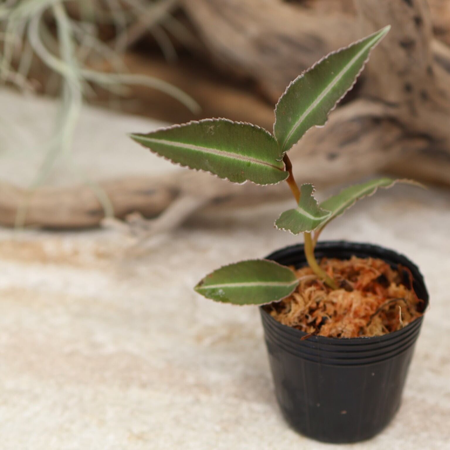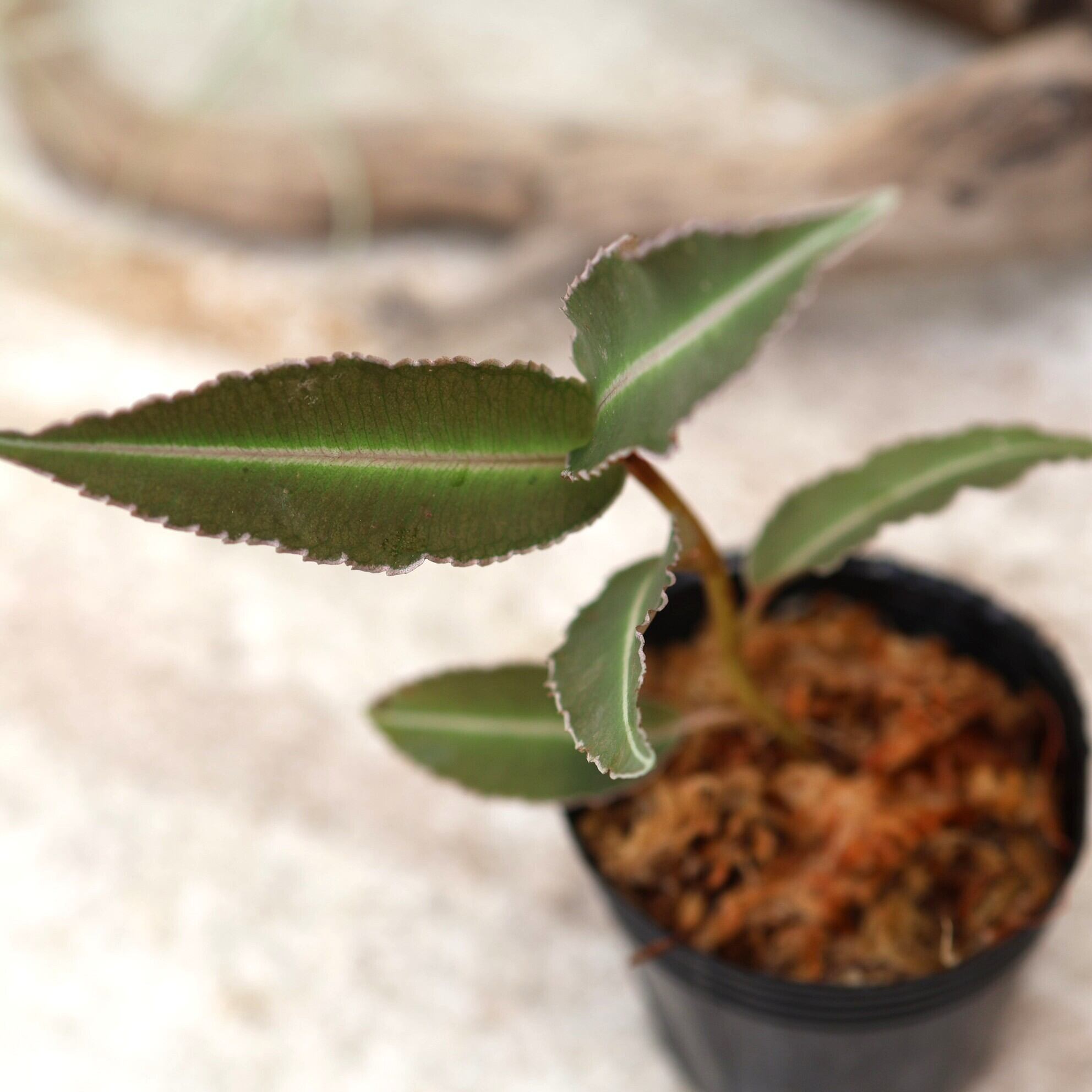 『ラビシア sp』は、個性的なギザギザの形状の葉にピンクの筋が魅力的な流通量が少ないラビシア。南タイ産。