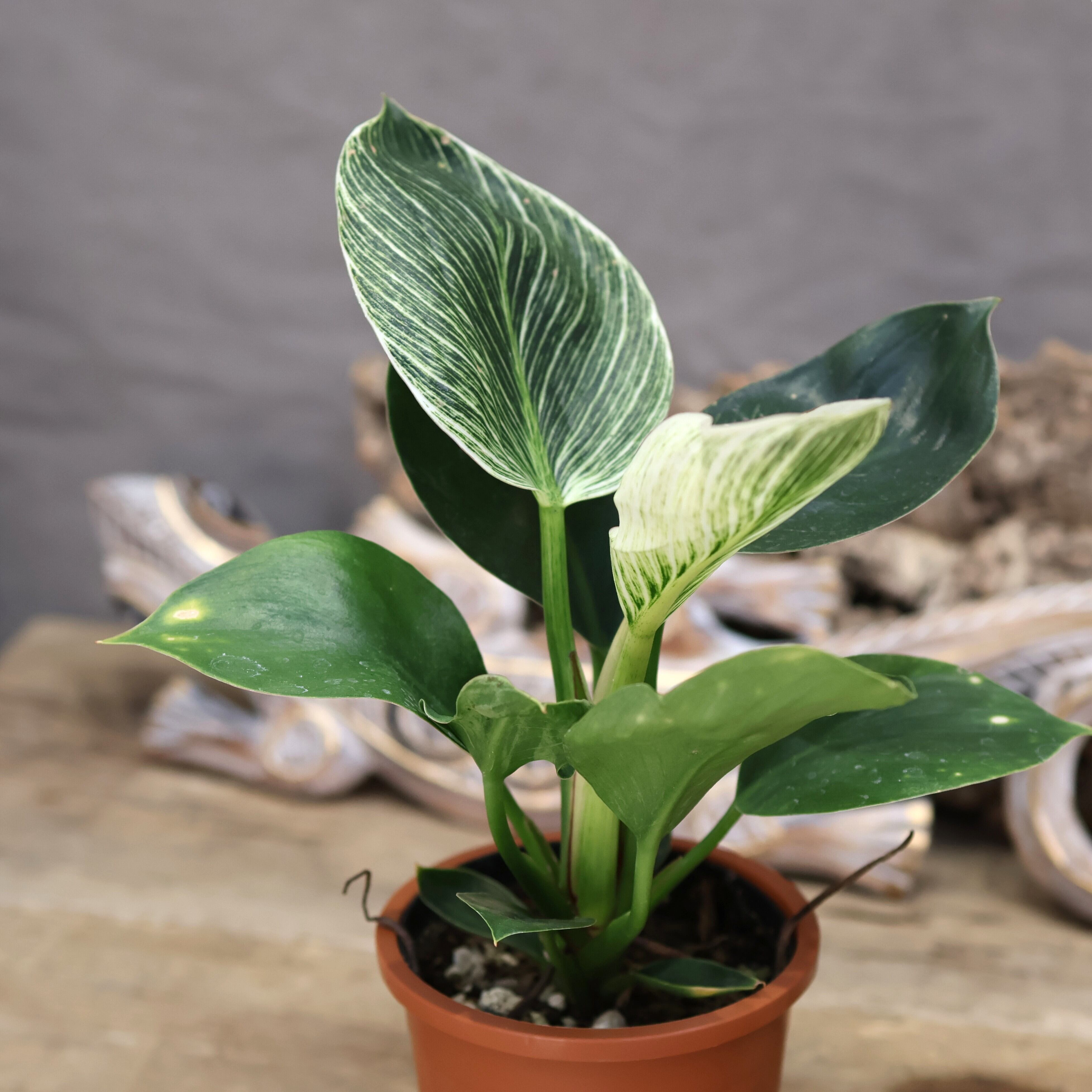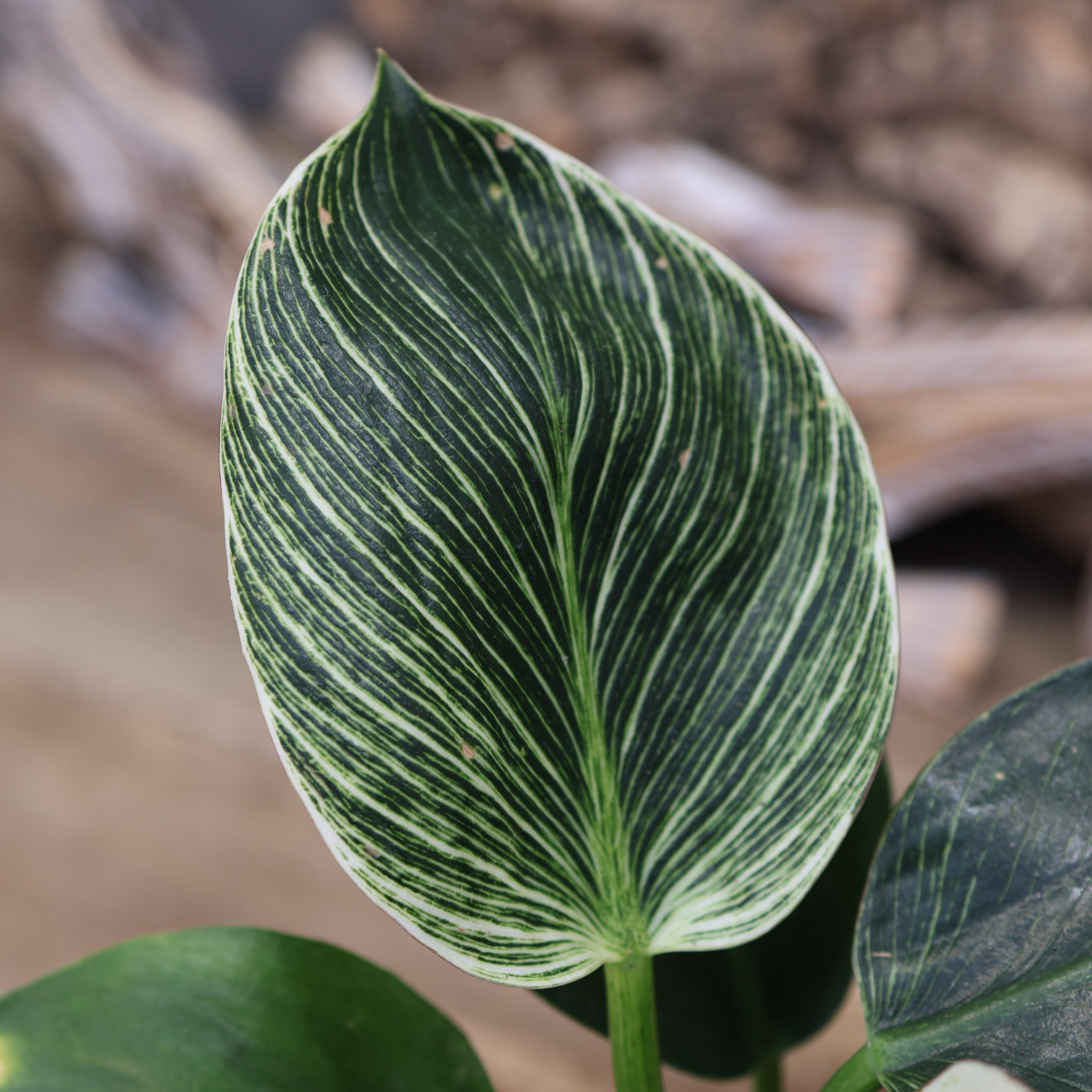 『フィロデンドロン バーキン』は、美しい葉柄模様が特徴の観葉植物です。深い緑の葉に鮮やかな白いストライプが入ることで、エレガントな印象を与えます。