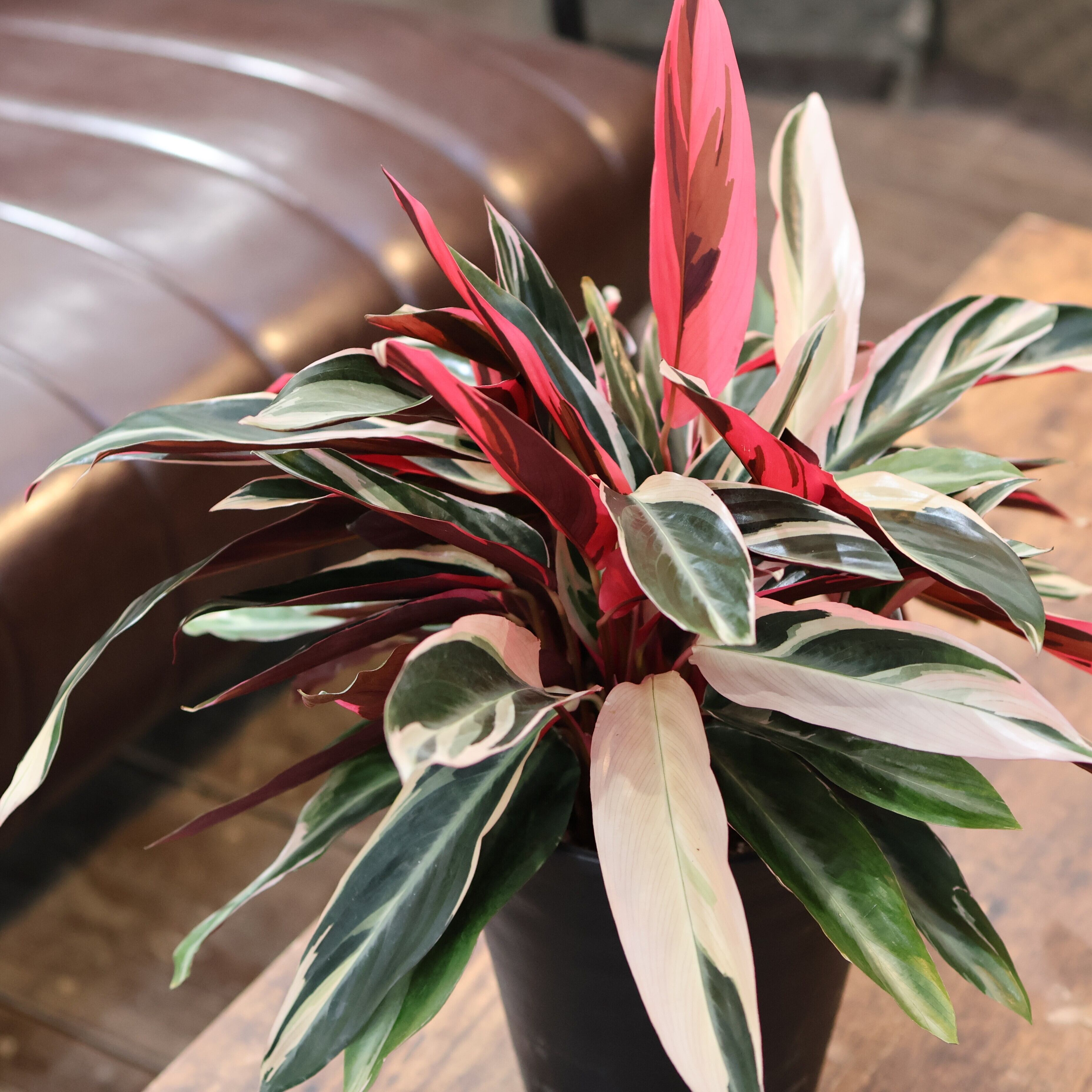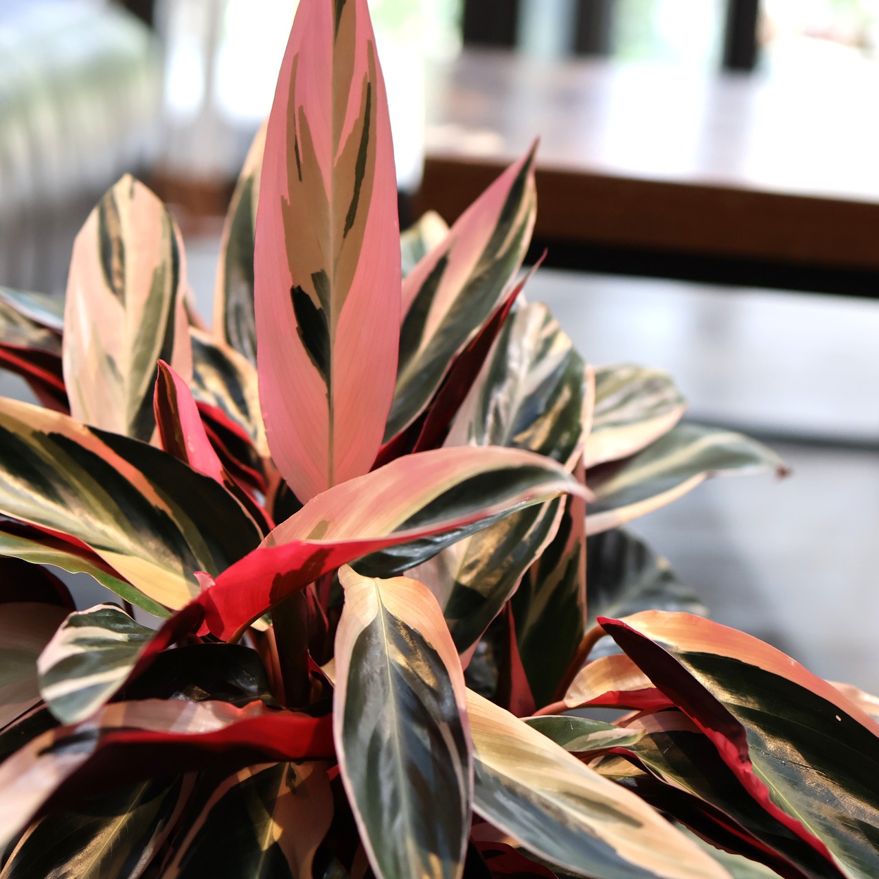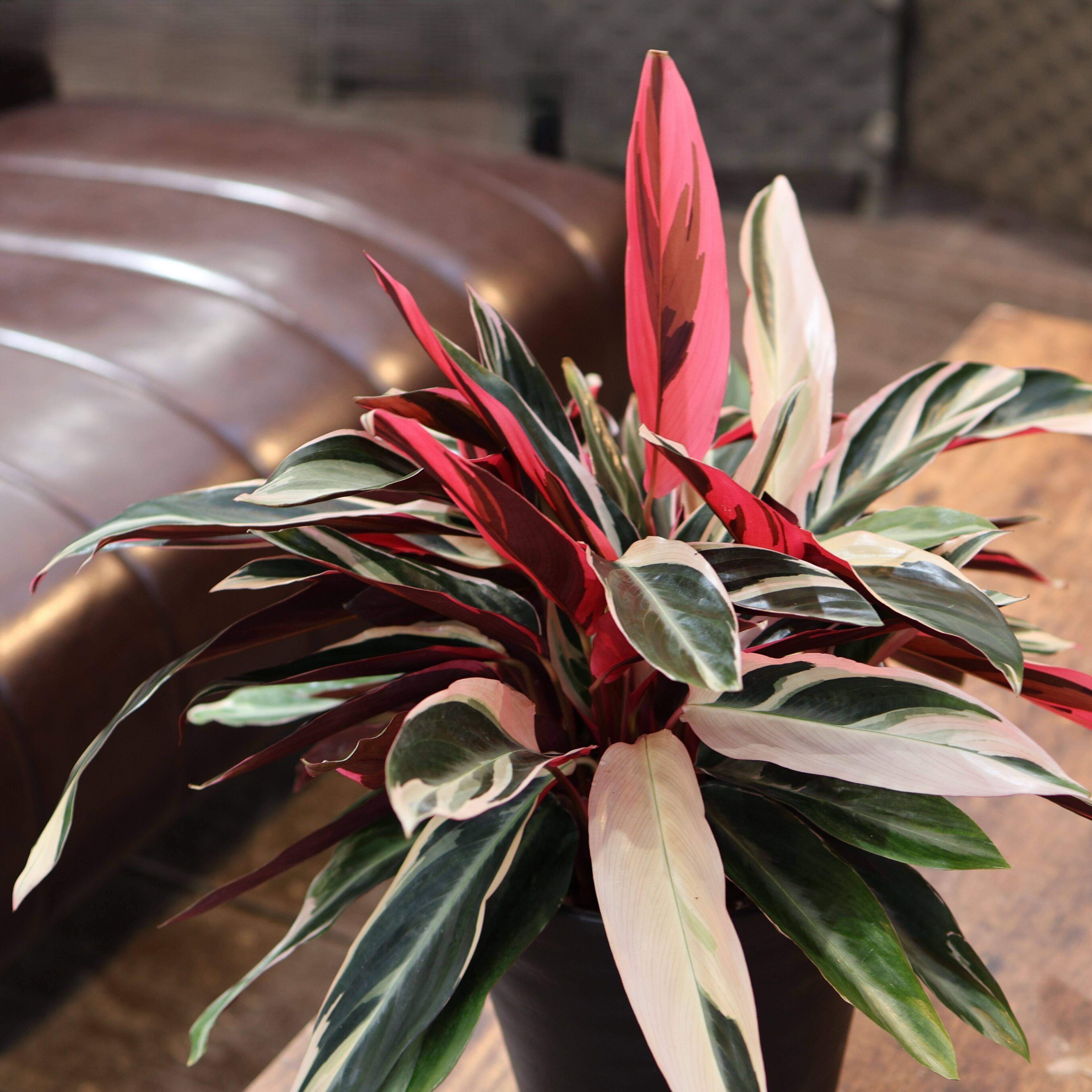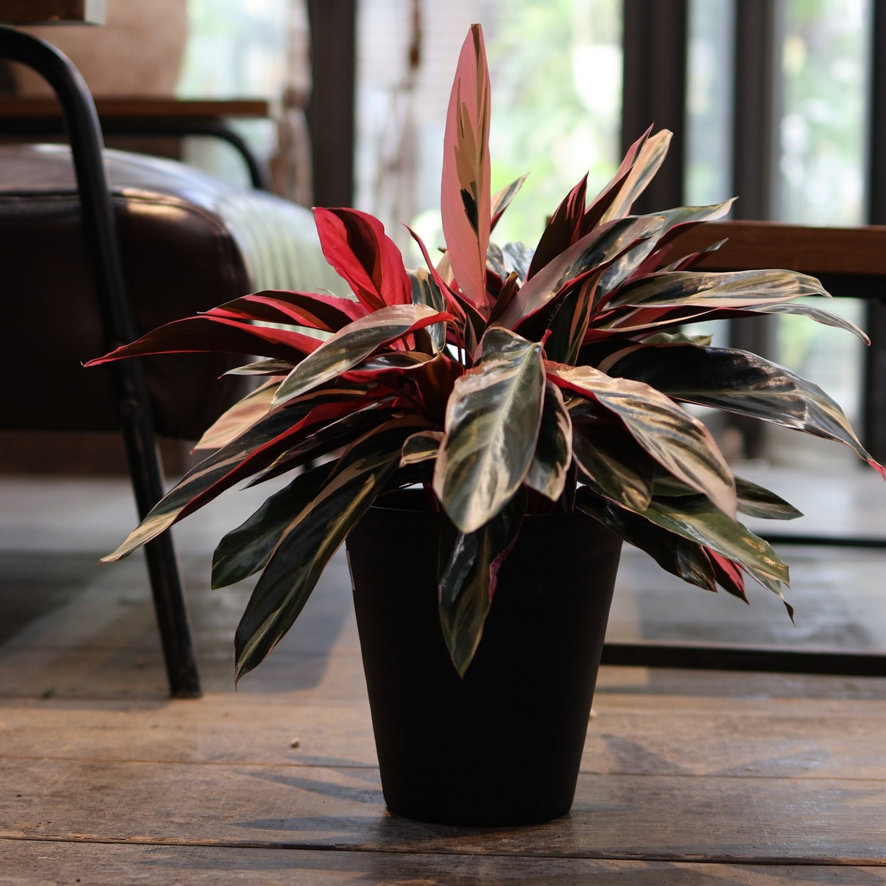 『ストロマンテ トリオスター』は、葉の表面は深い緑色に薄緑や白の斑が入り、葉の裏や茎は朱色のコントラストが魅力です。一葉一葉表情が違うので視覚的にも楽しませてくれる個性的な一品
