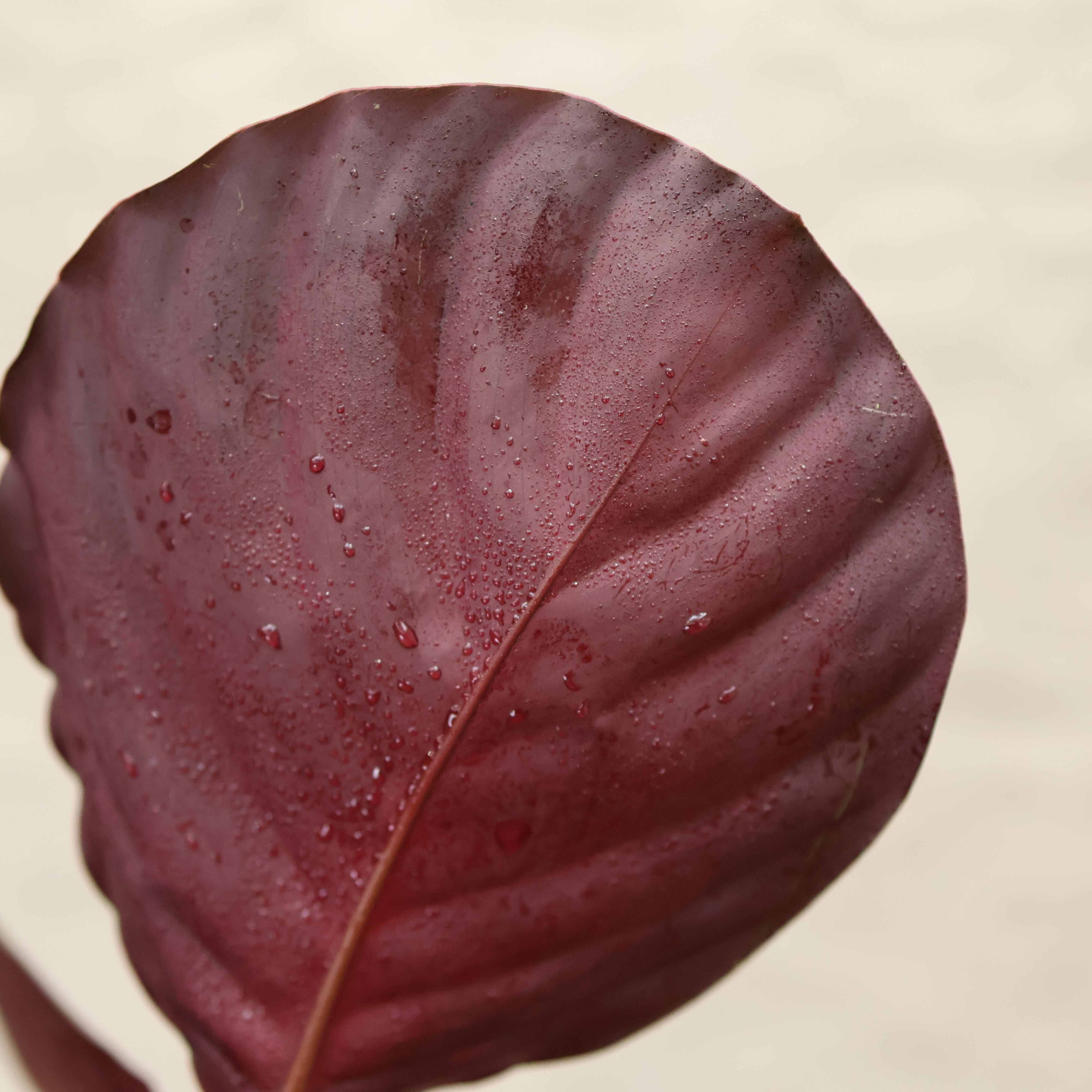 深みのある赤紫の葉に、シックな濃い紫の縁取り。さらに、葉裏はガーネット色という、色合いが特徴です。一鉢で様々な葉の雰囲気を楽しめる鑑賞度の高い観葉植物です。