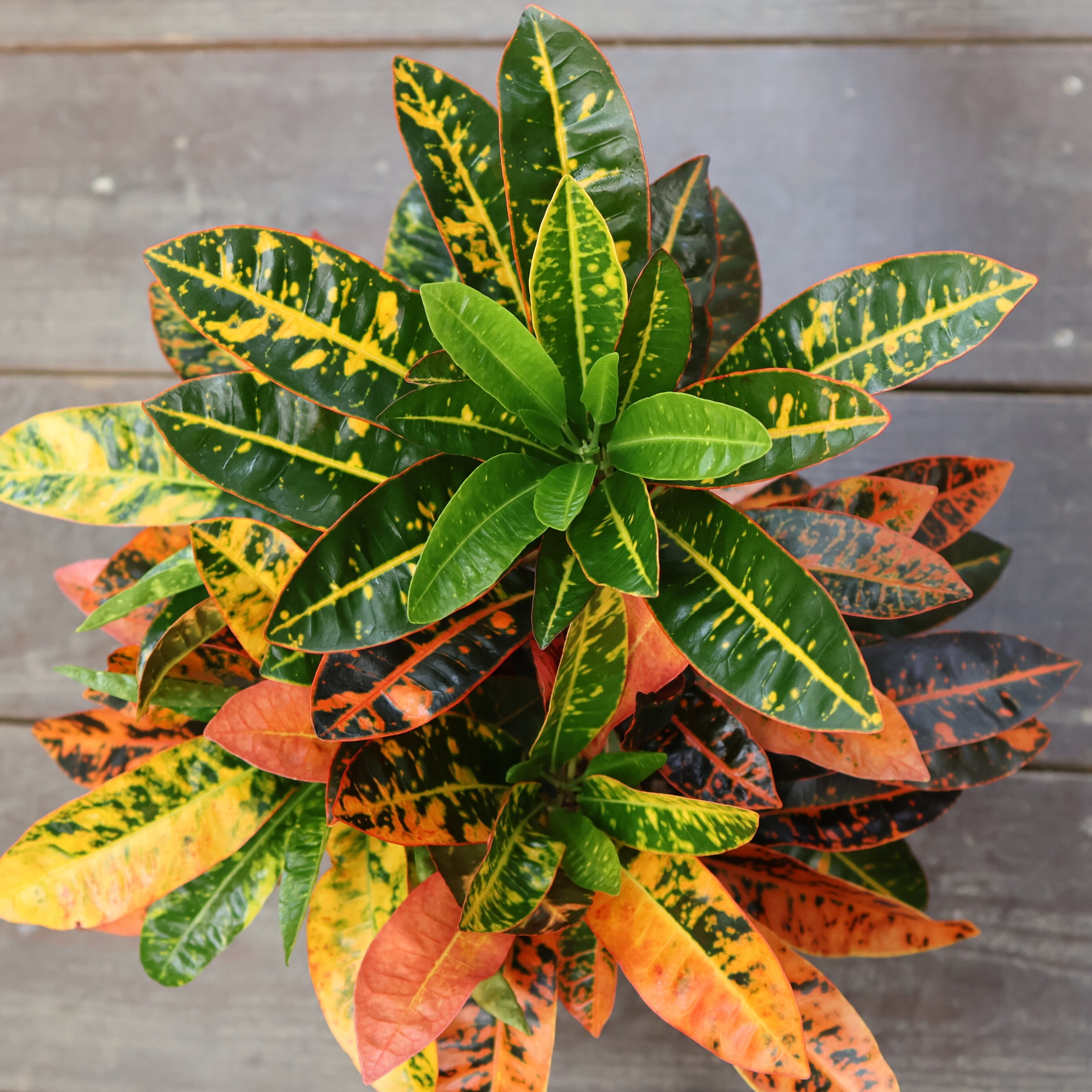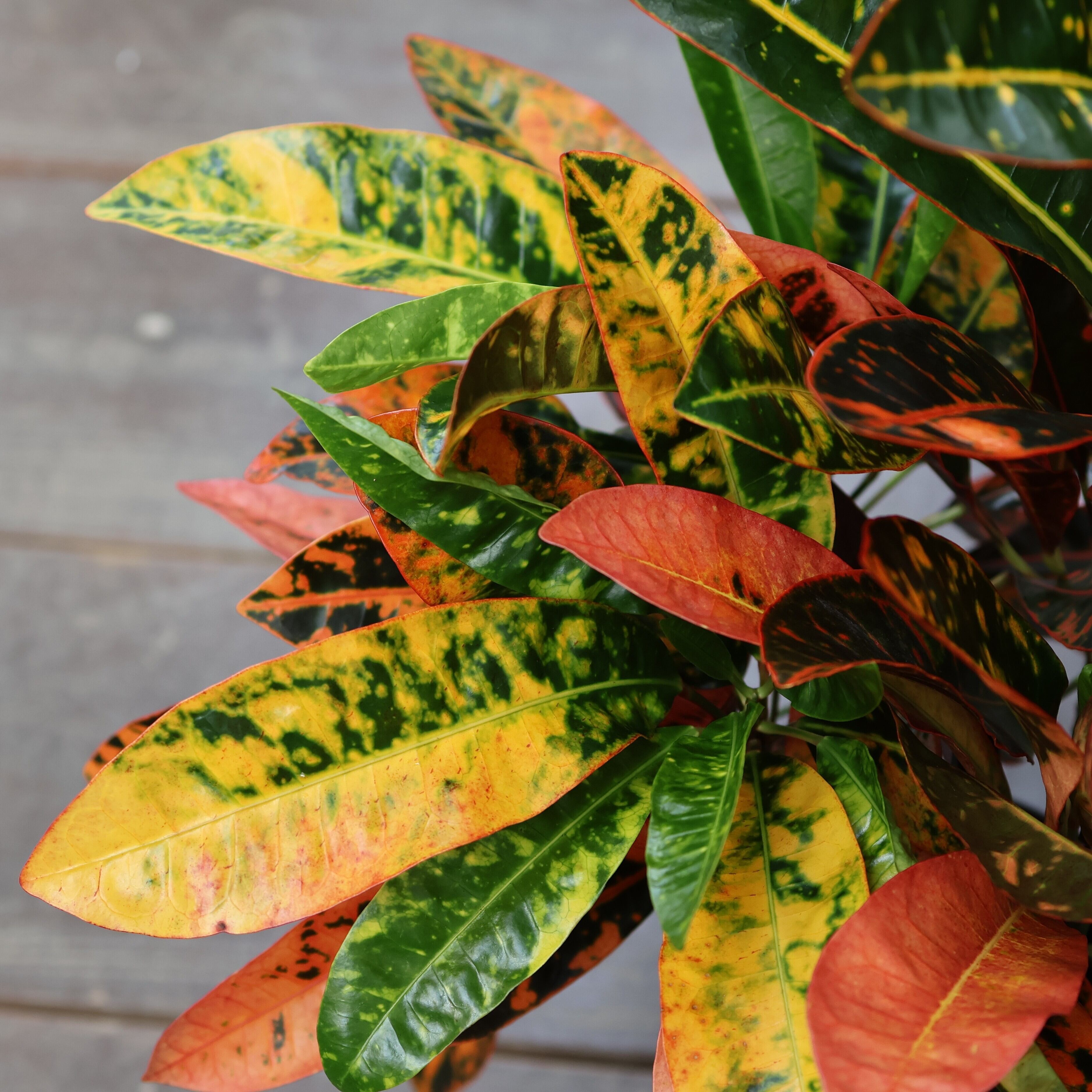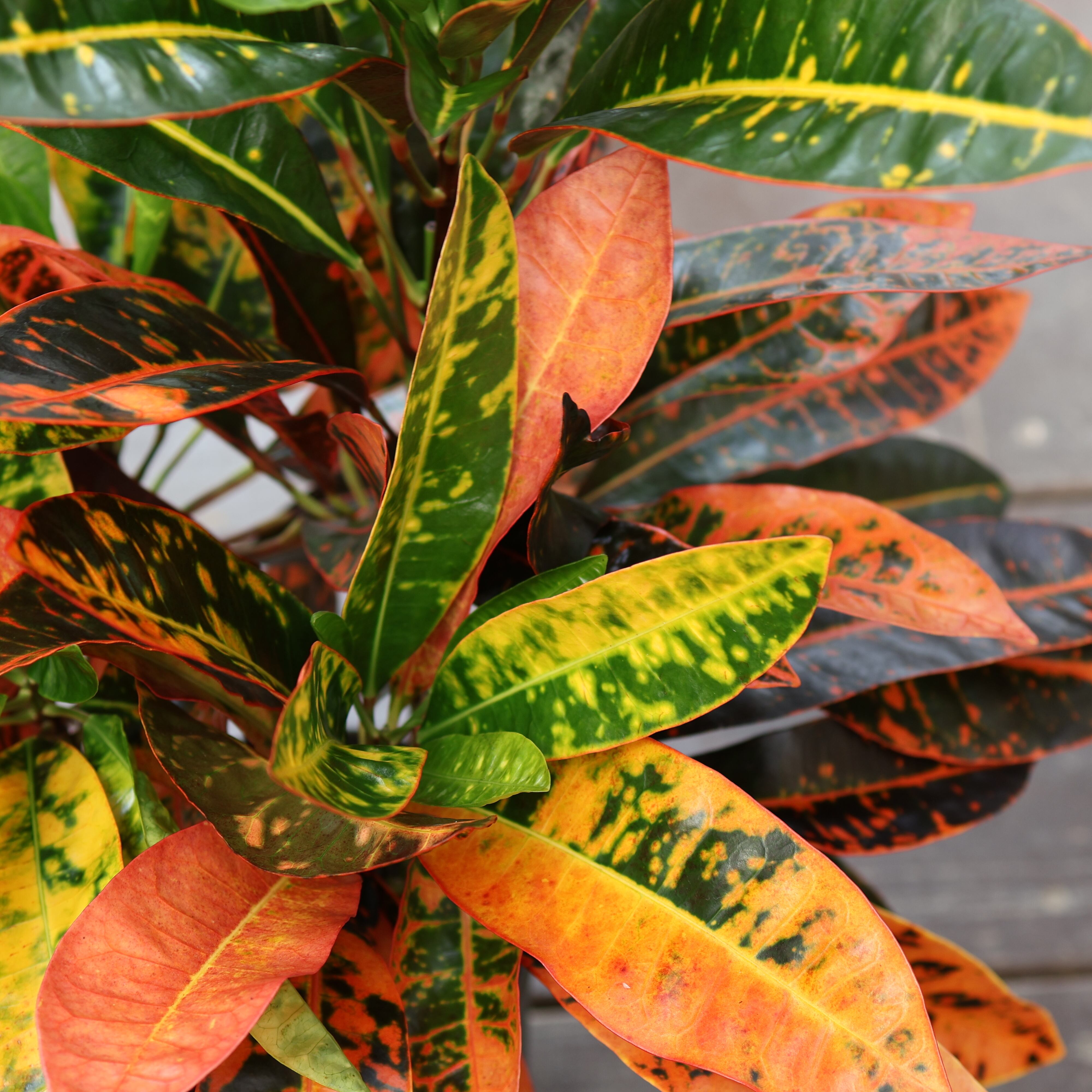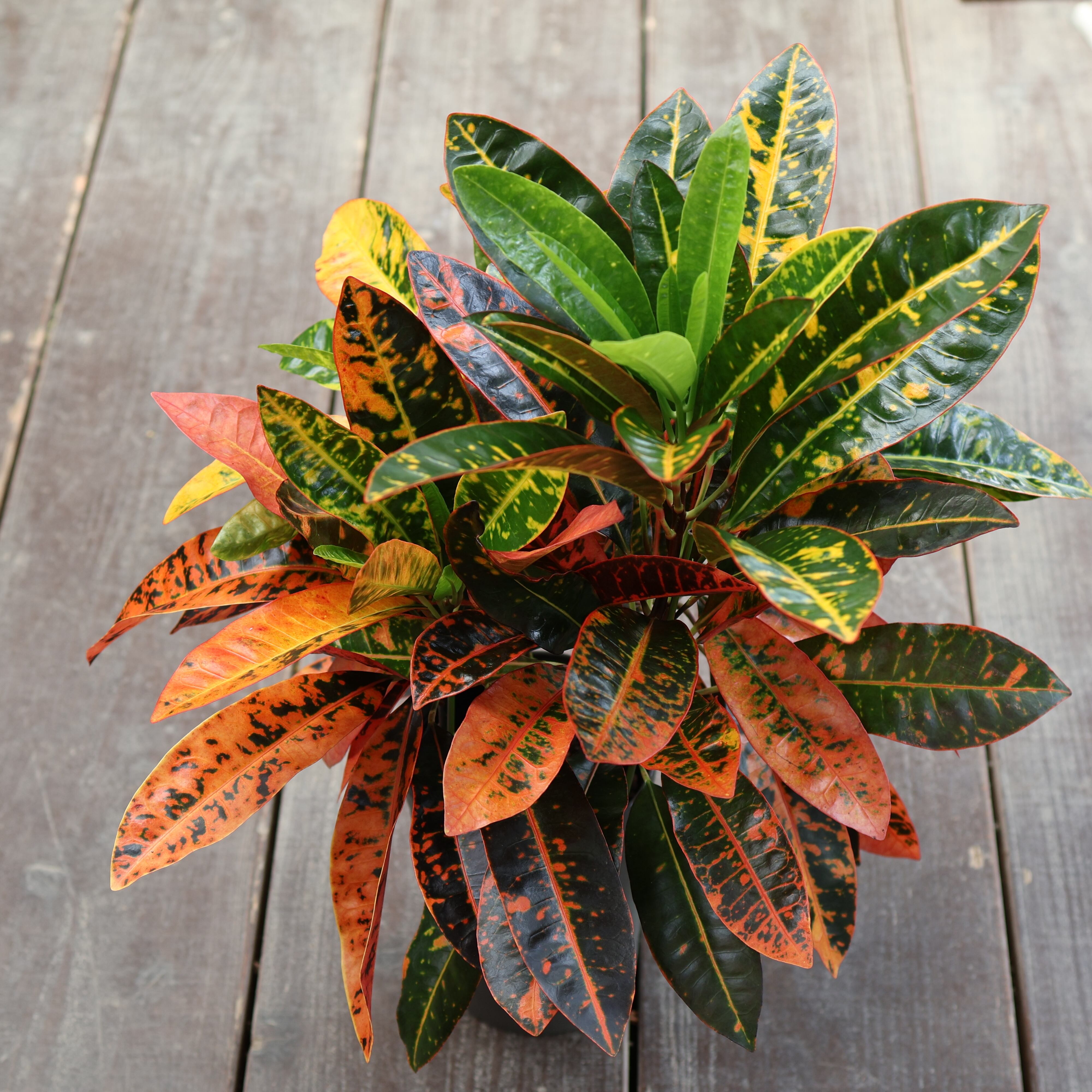 『クロトン』は、鮮やかな葉色が楽しめる人気の観葉植物です。深いグリーンに赤や黄色が華やかに美しく混じり合い、まるで芸術作品のような模様が魅力的。