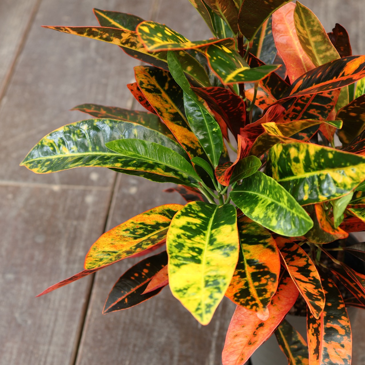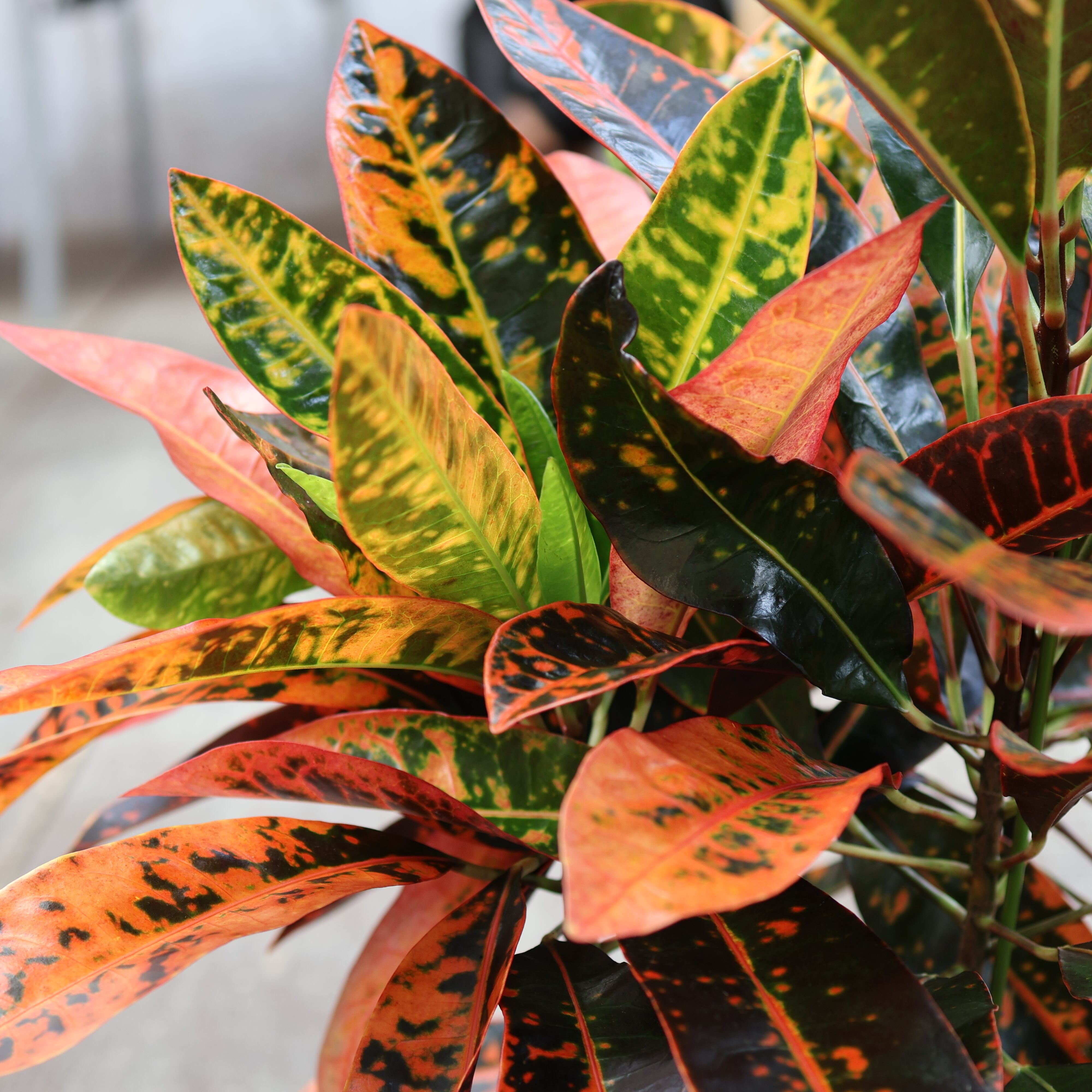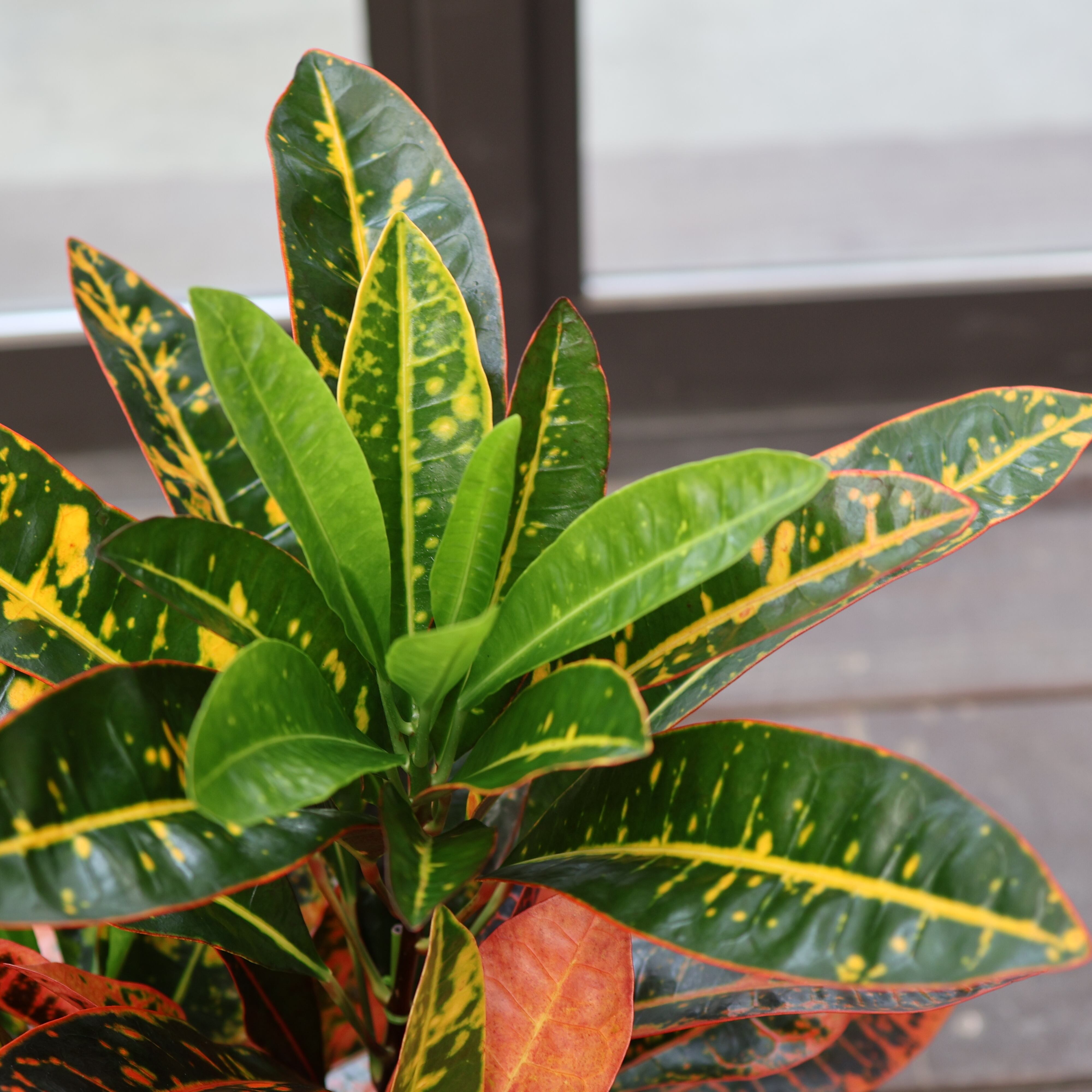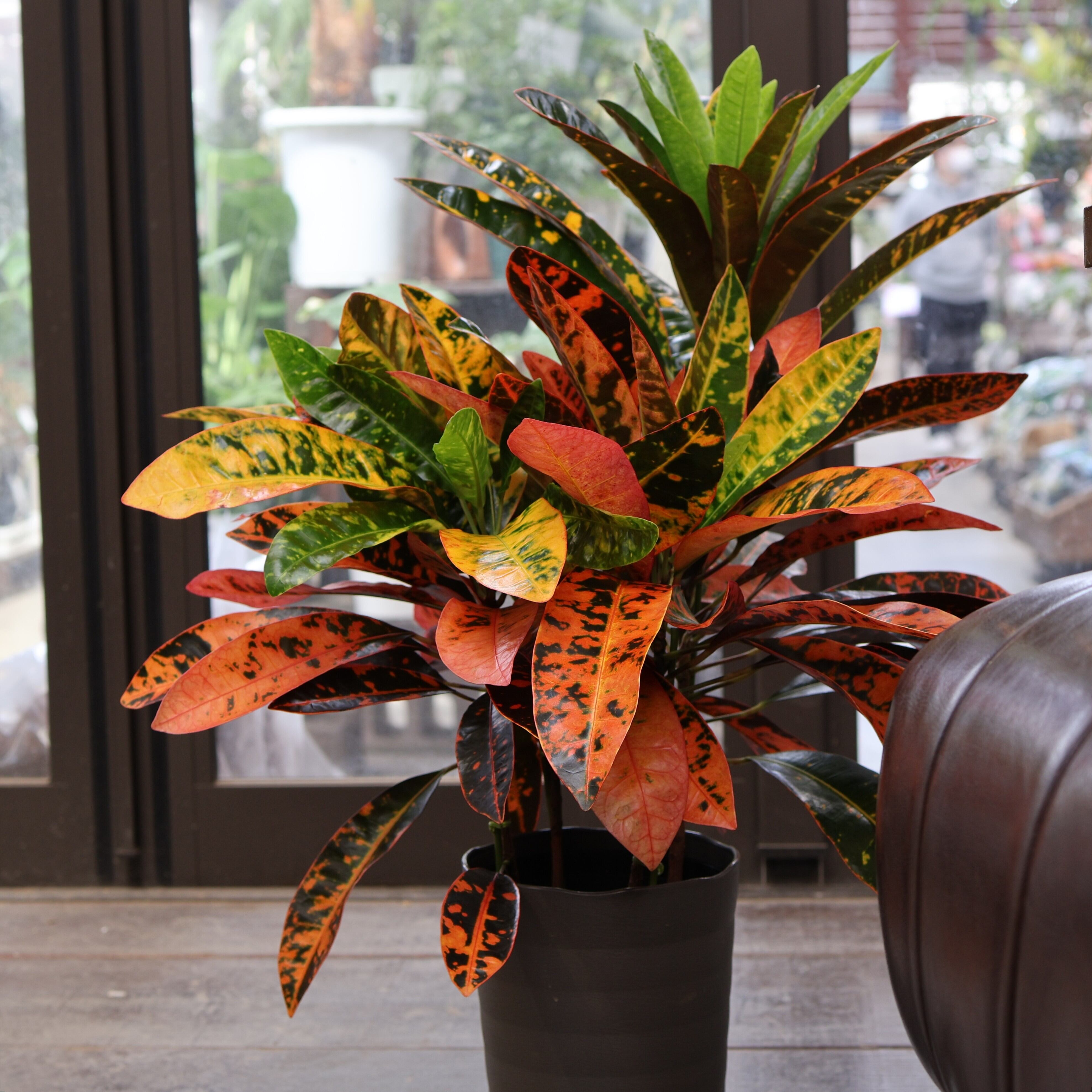 『クロトン』は、鮮やかな葉色が楽しめる人気の観葉植物です。深いグリーンに赤や黄色が華やかに美しく混じり合い、まるで芸術作品のような模様が魅力的。
