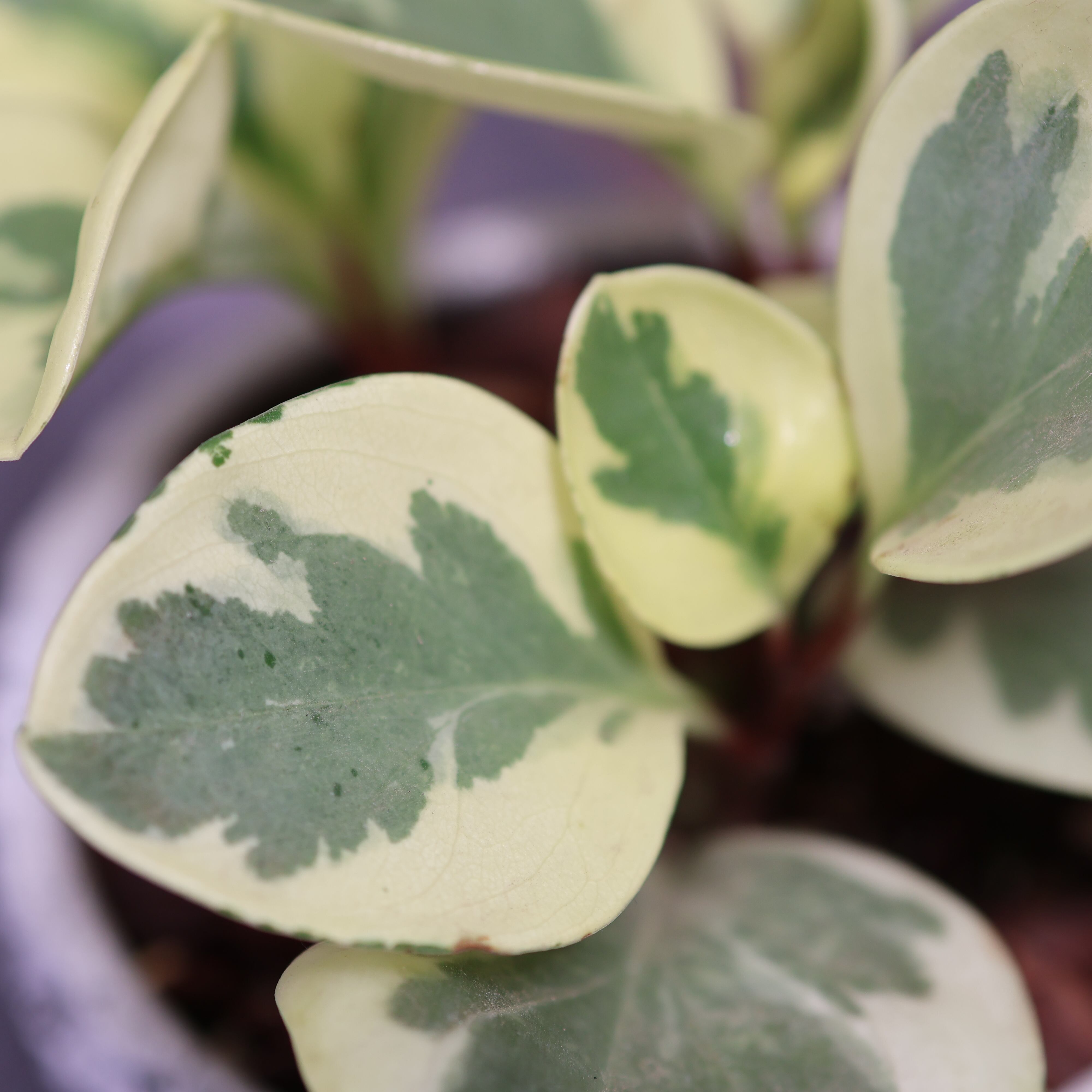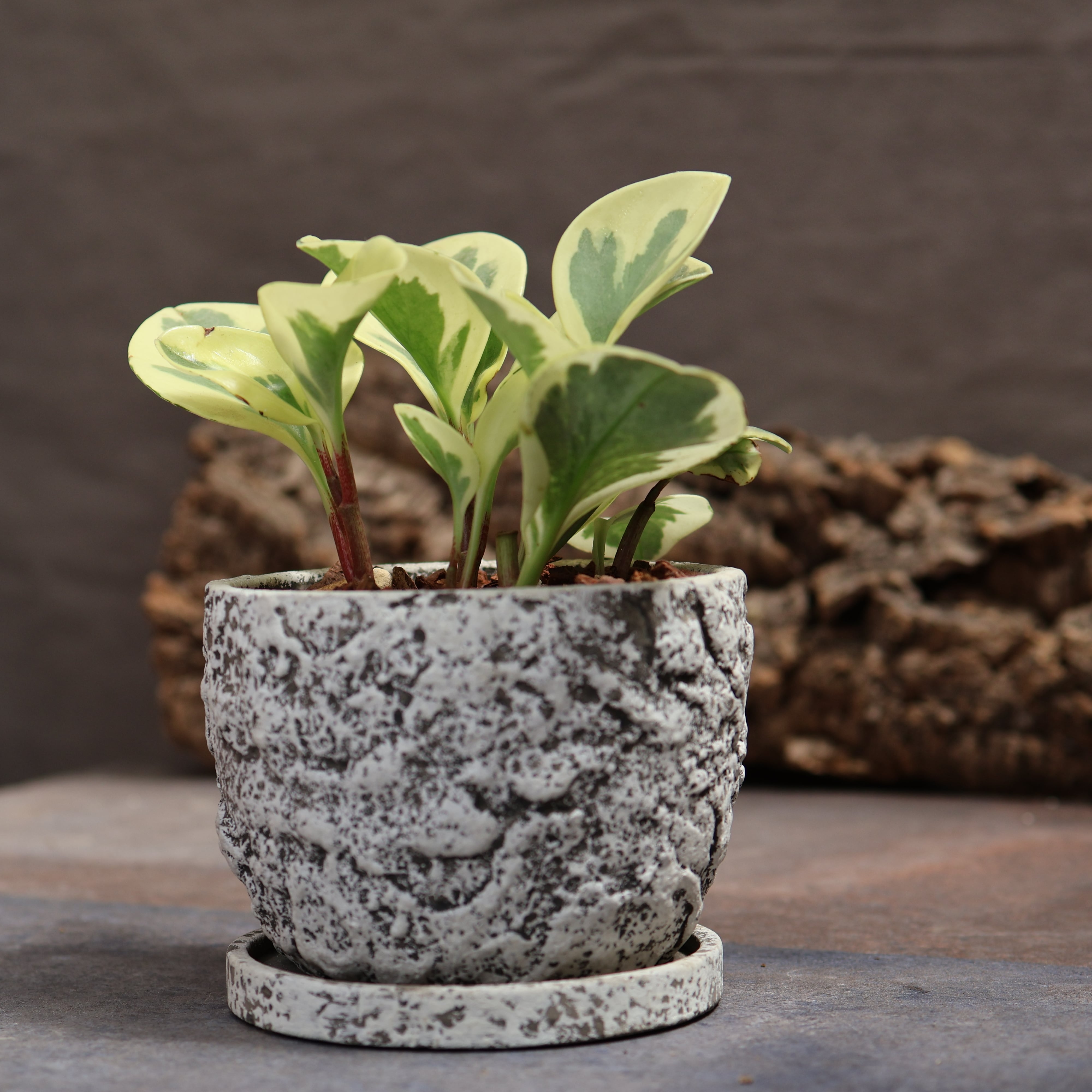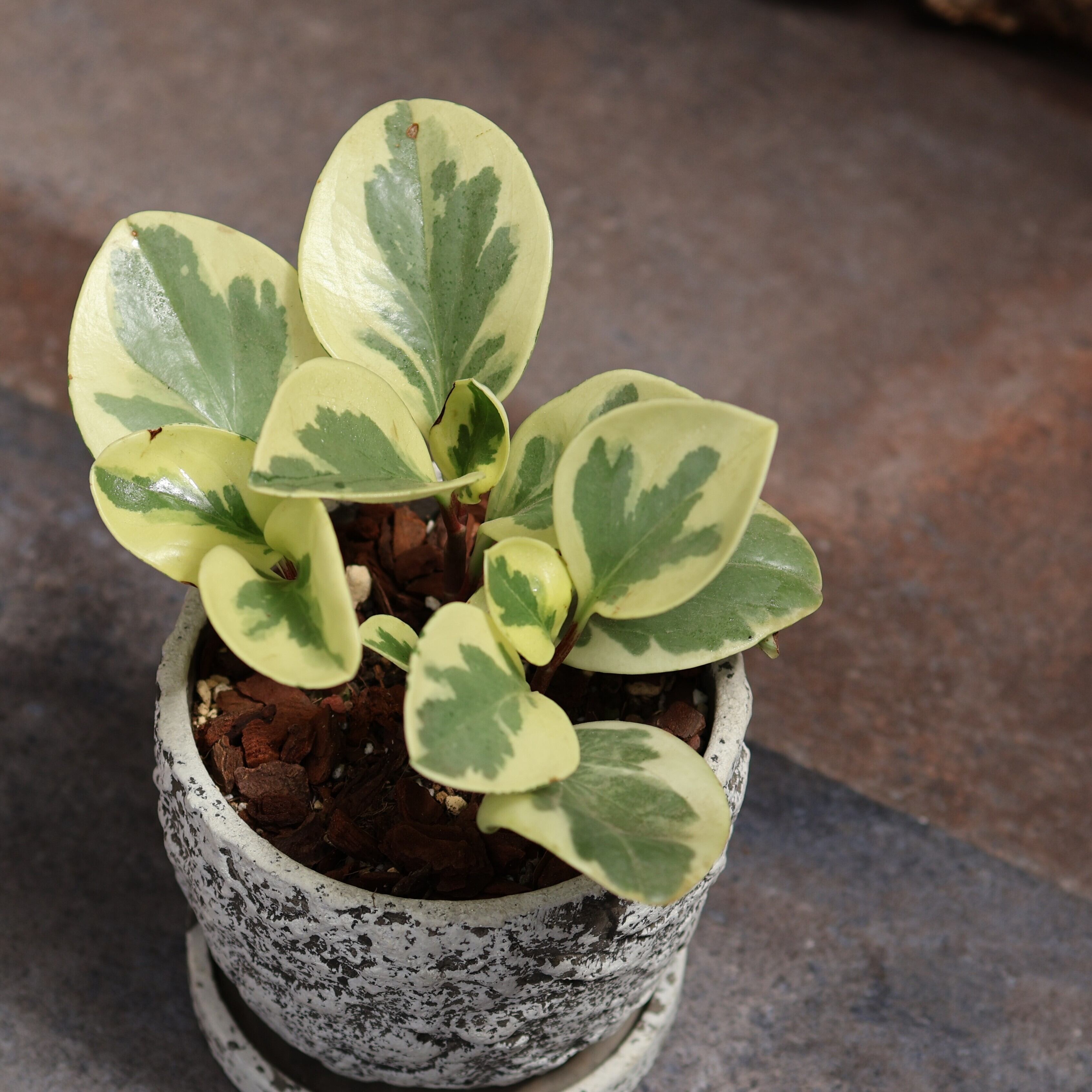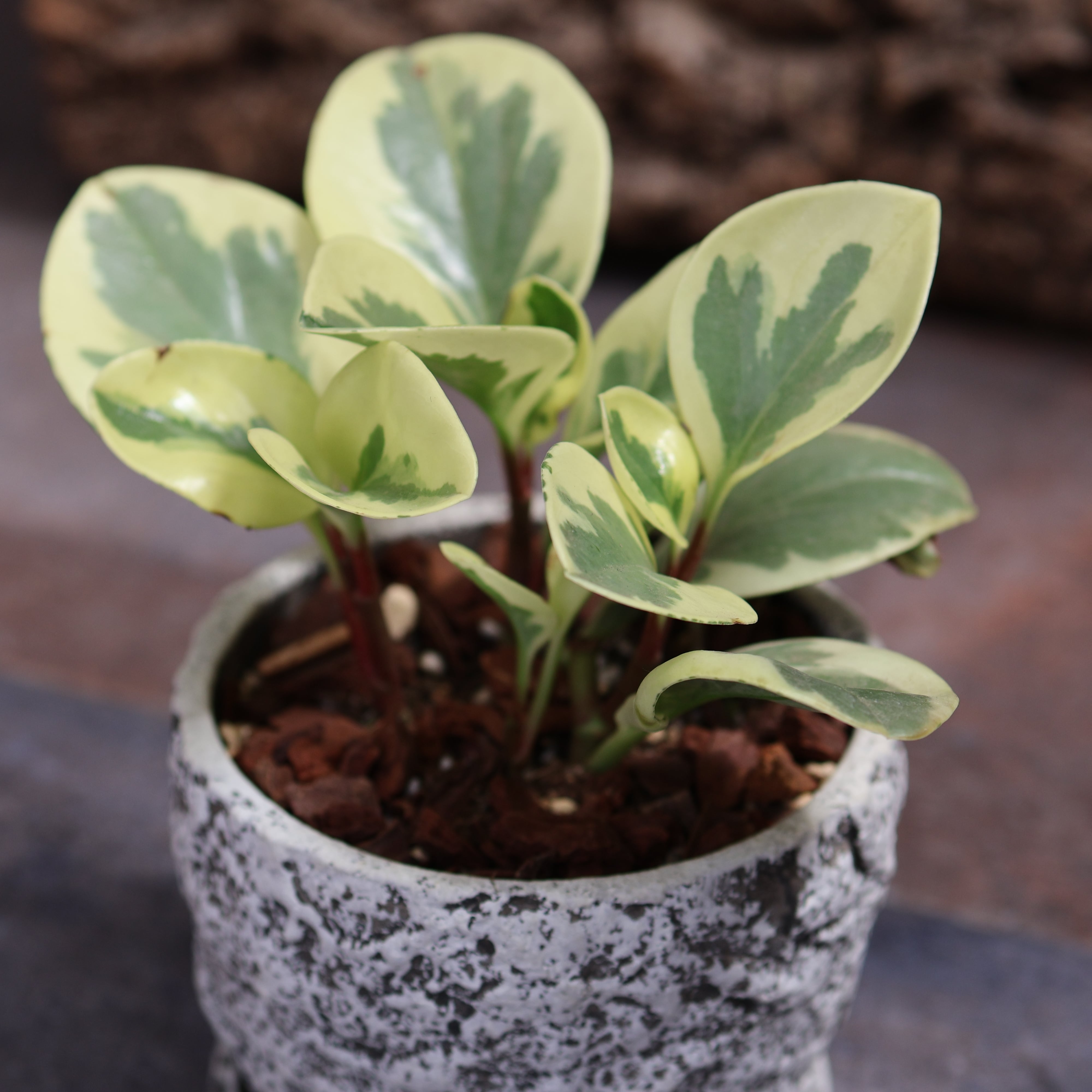『ペペロミア』は、ぷっくりした愛らしい葉と斑の入り方が魅力なインテリアグリーンとして人気の観葉植物です。シンプルな鉢に植え替えてあり鉢皿もついていますのでプレゼントにもおススメです。