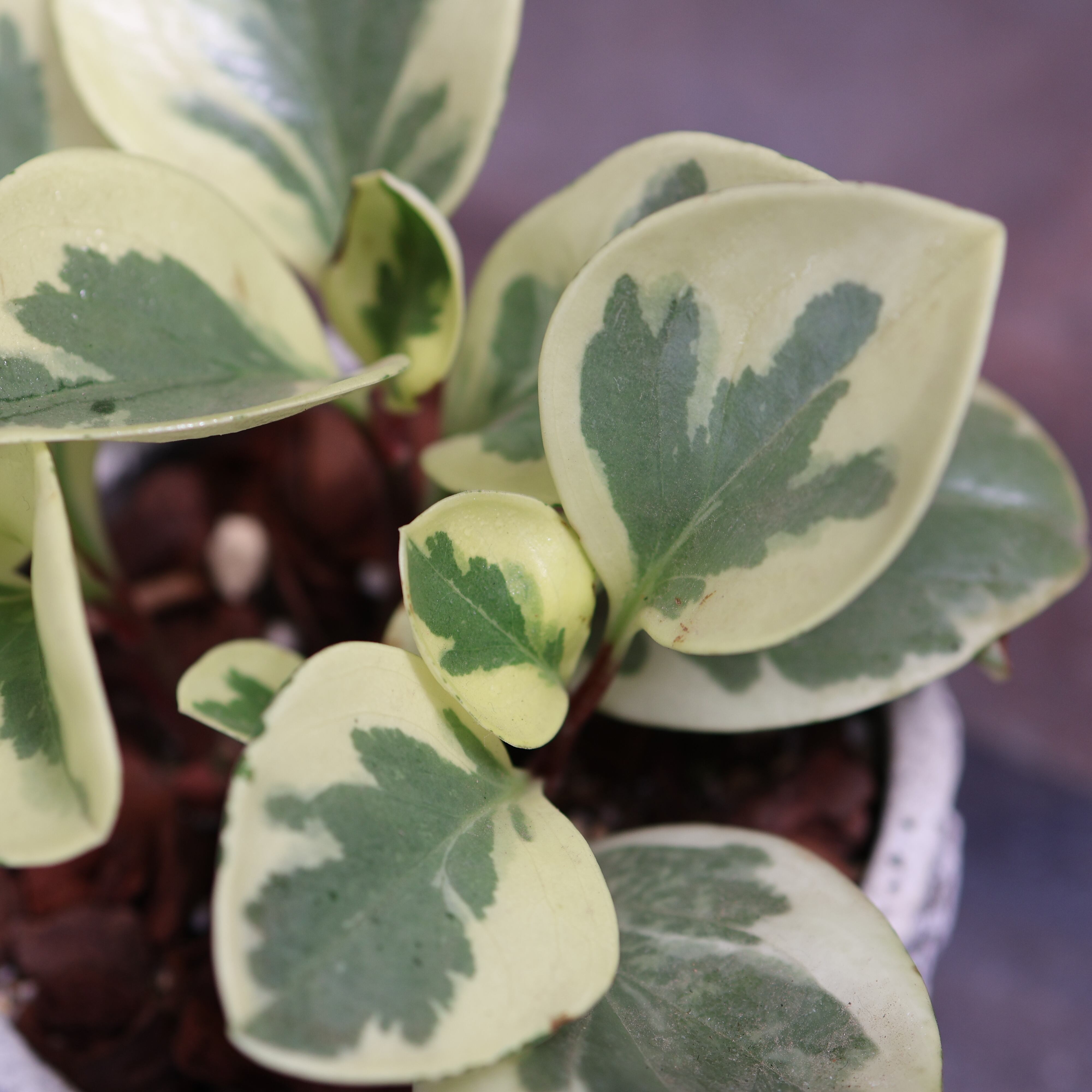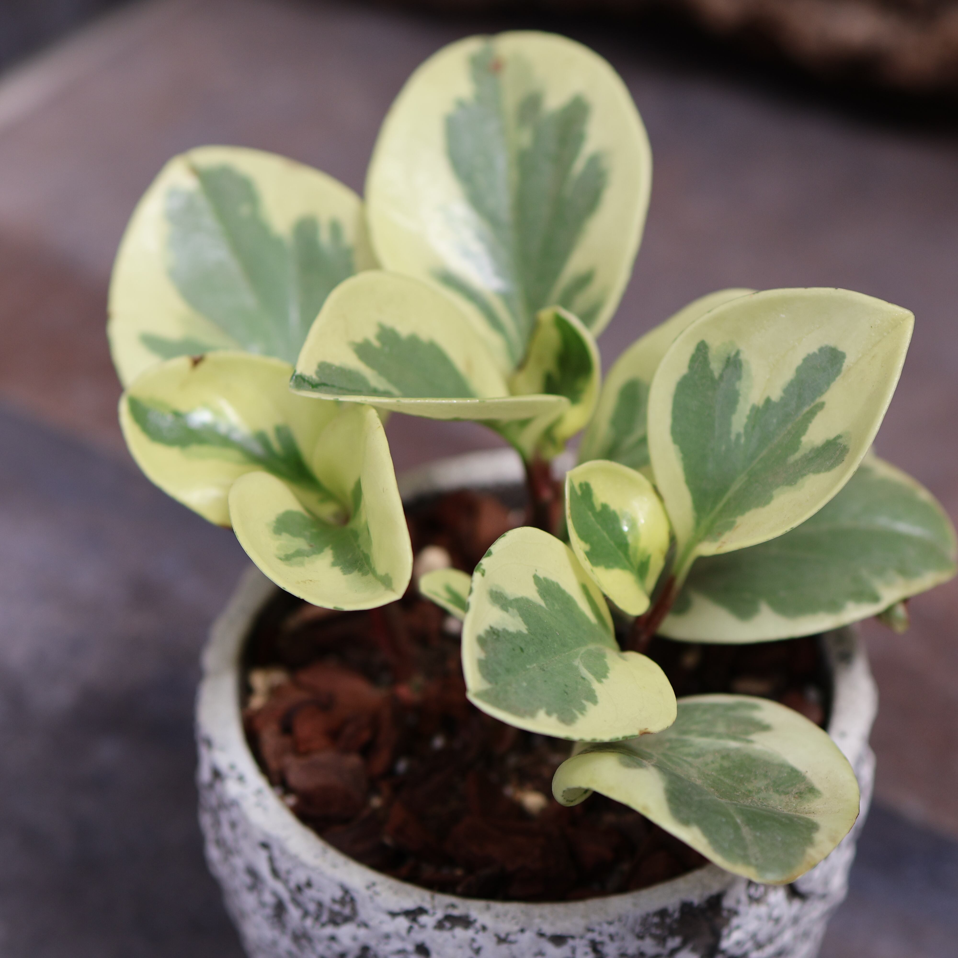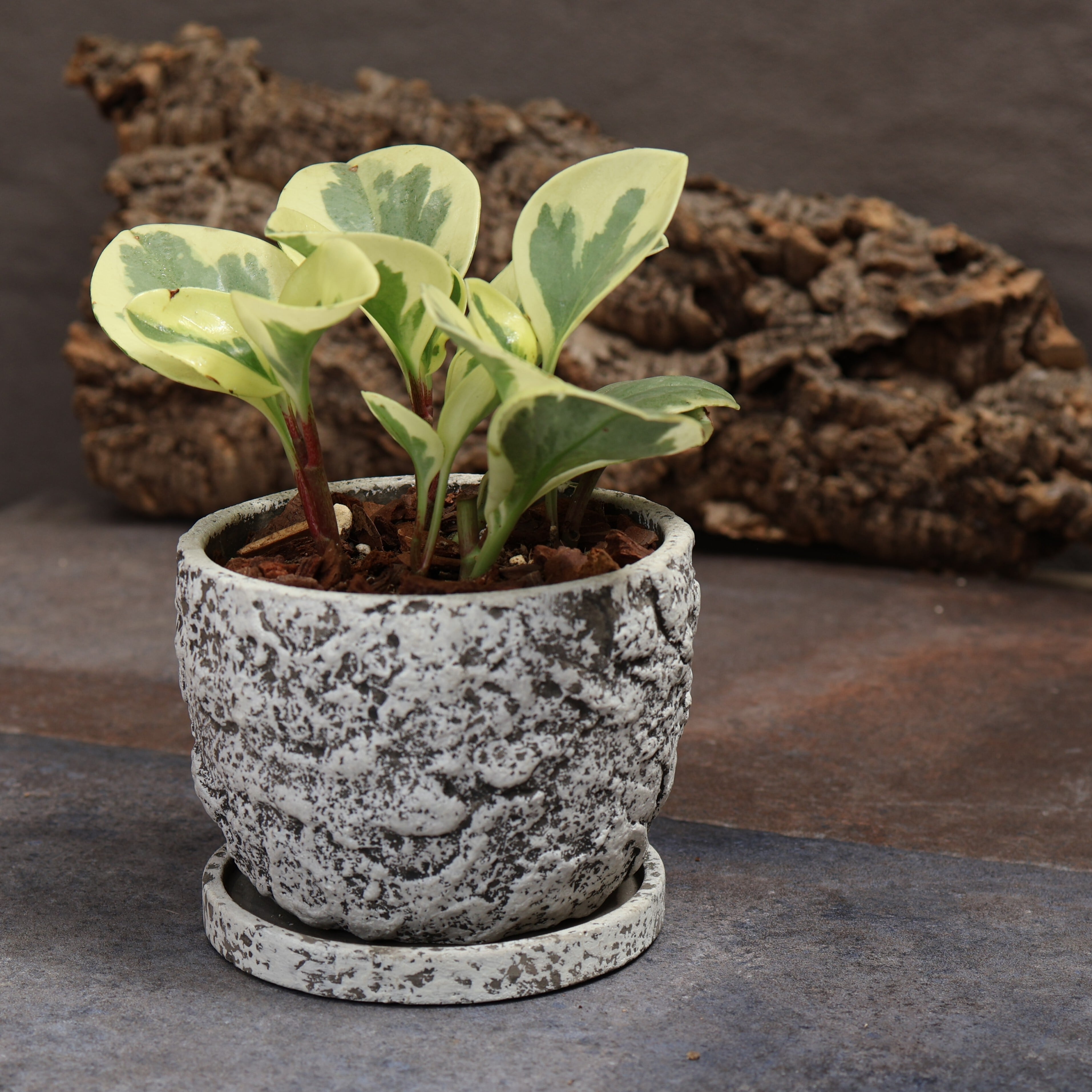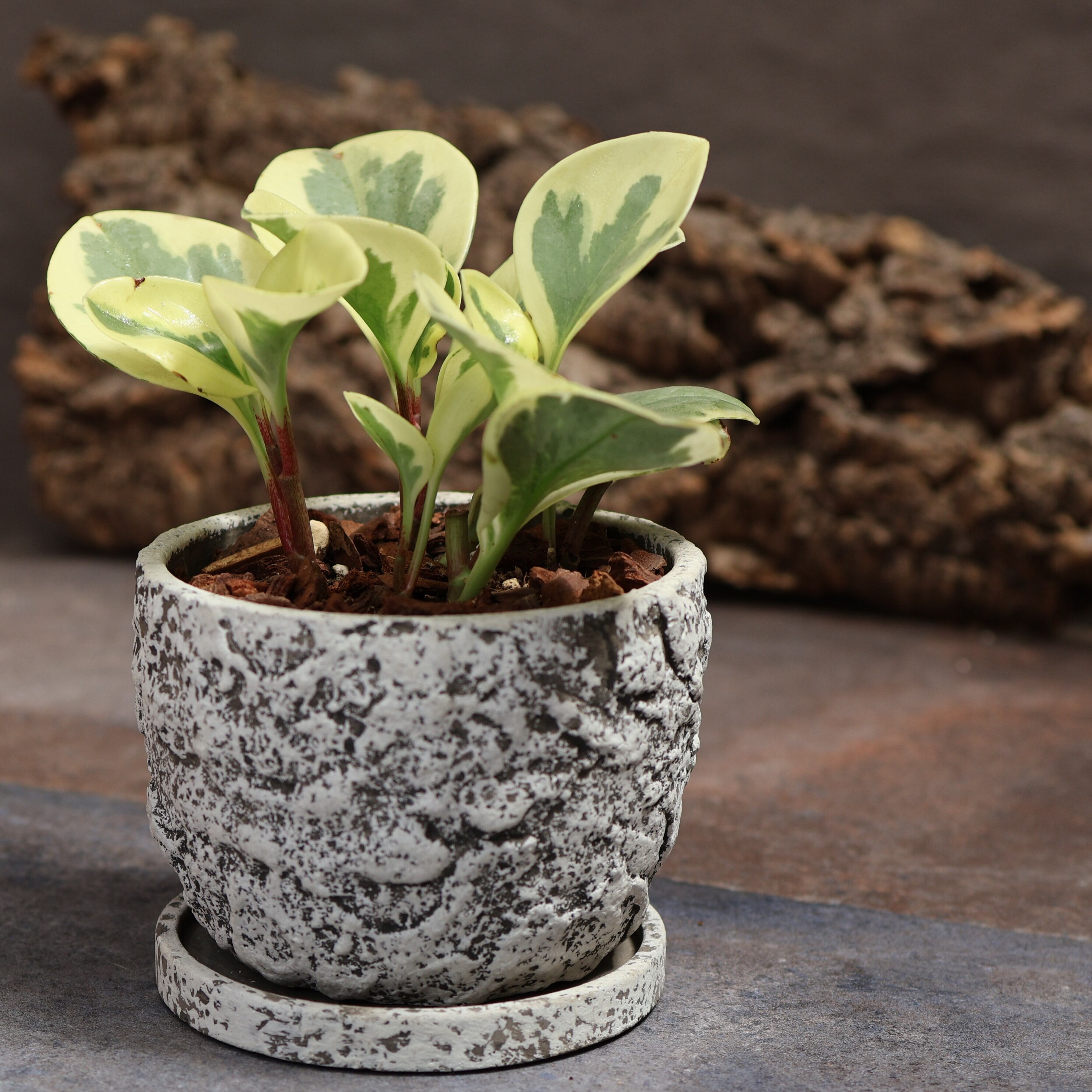 『ペペロミア』は、ぷっくりした愛らしい葉と斑の入り方が魅力なインテリアグリーンとして人気の観葉植物です。シンプルな鉢に植え替えてあり鉢皿もついていますのでプレゼントにもおススメです。