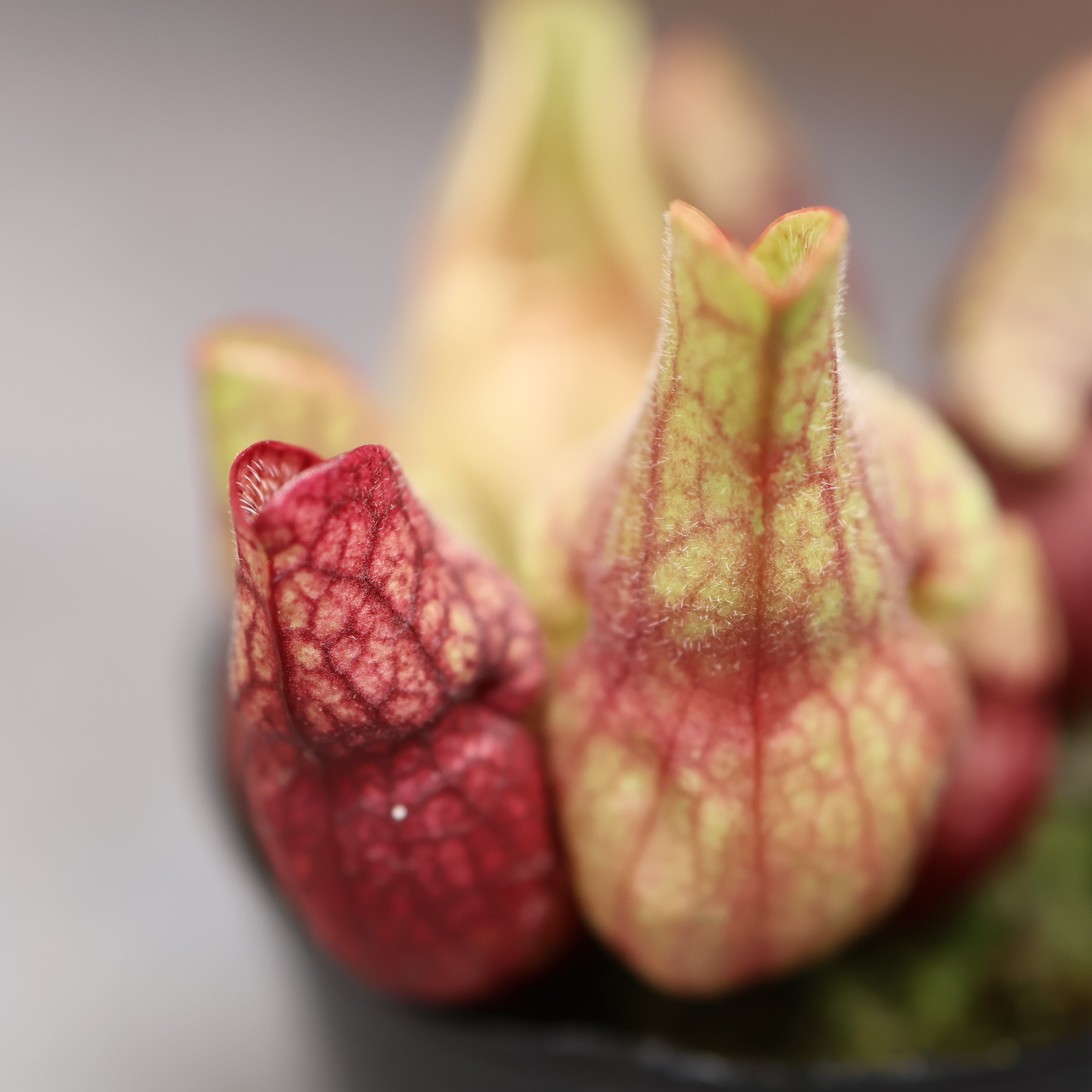 『サラセニア プルプレア ベノーサ S.pupurea Var.Venosa』は、湿地帯に自生する食虫植物。筒状に立ち上がったように伸びる葉、この葉の内部に蜜があり、誘惑されて落ちた虫が餌食となり消化吸収されます。