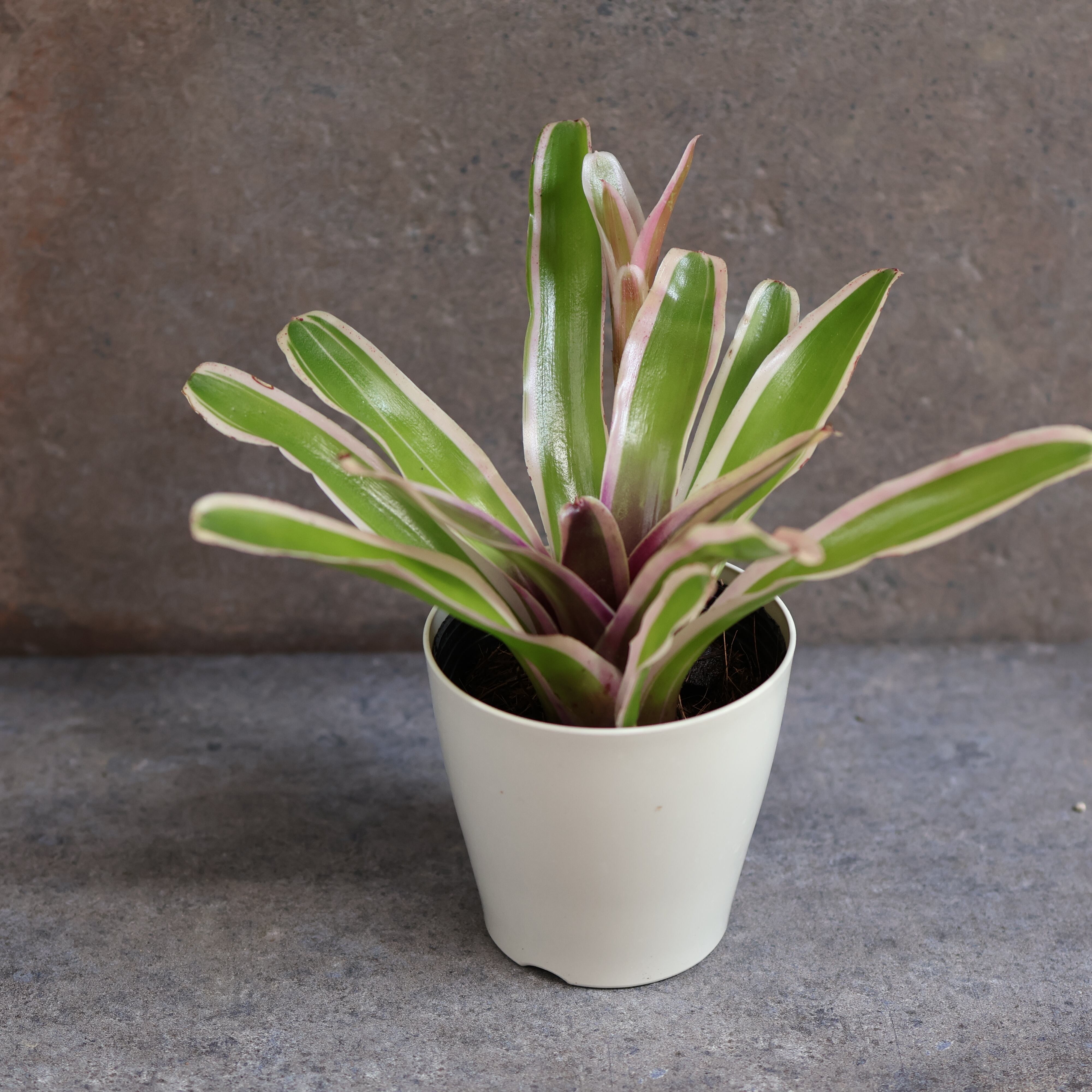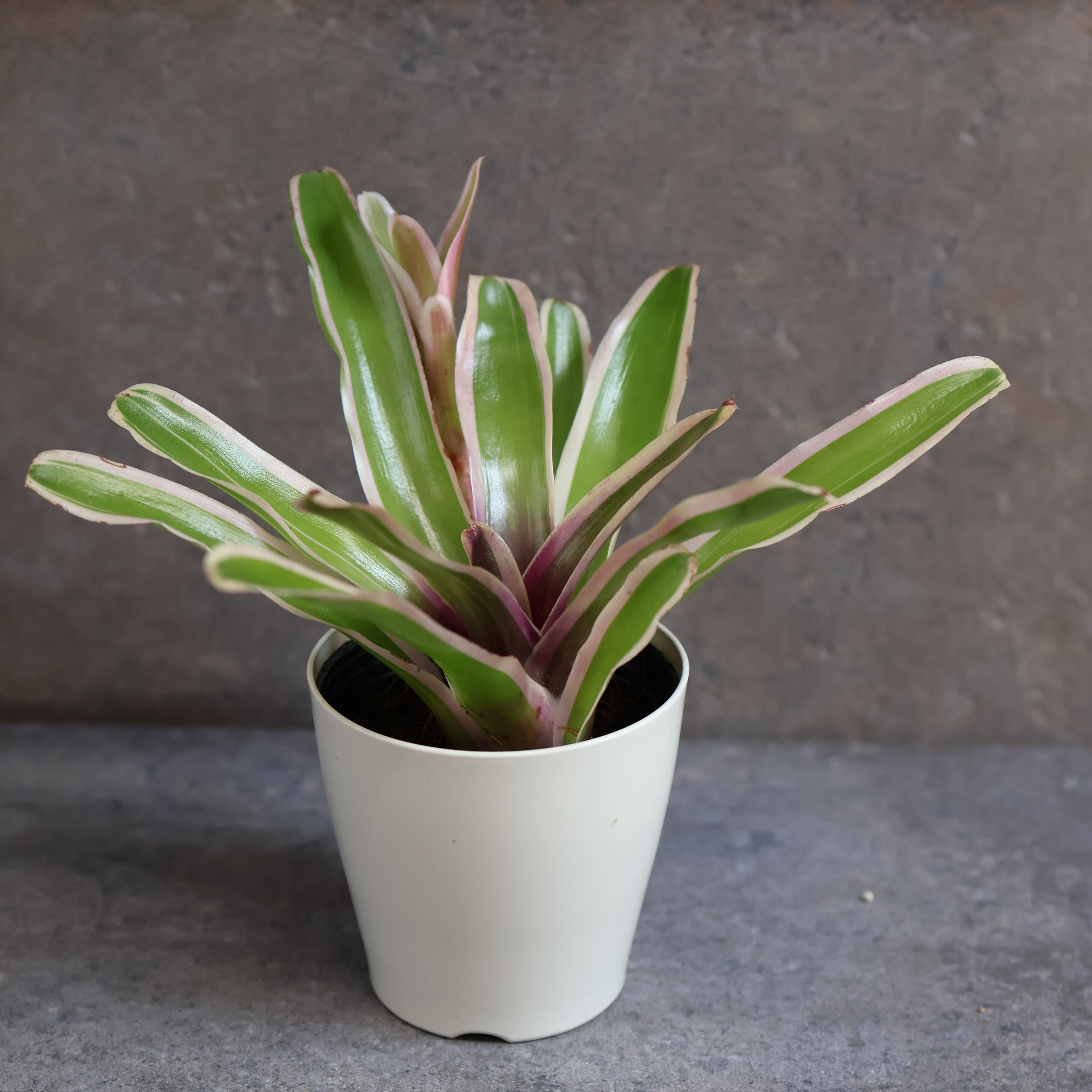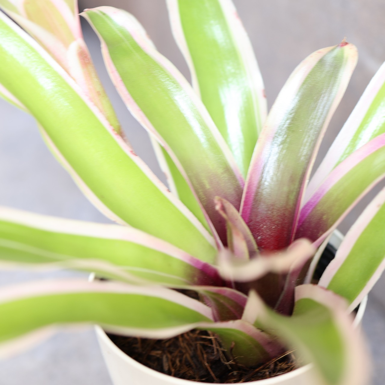 『ネオレゲリアファイヤーボール』は、可愛らしい色合いのタンクブロメリアです。ブラジルに原生する中~小型の着生タイプのアナナス類。子株ができやすく、ランナーを伸ばして生長しボリュームのある株姿になります。群生を楽しめます。