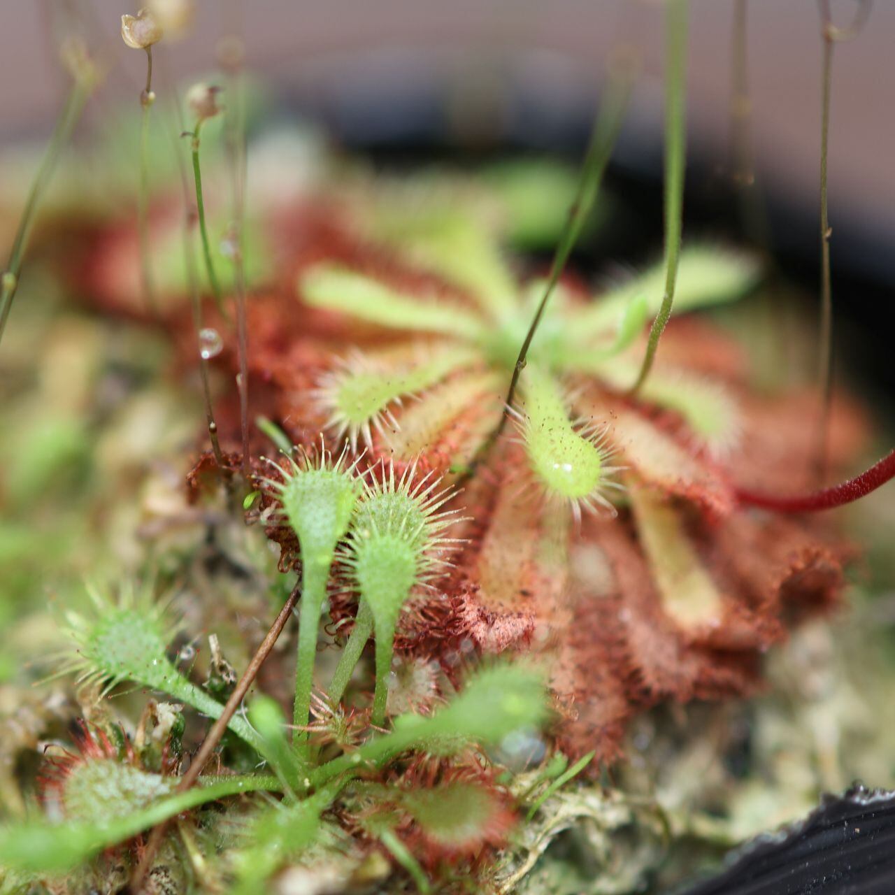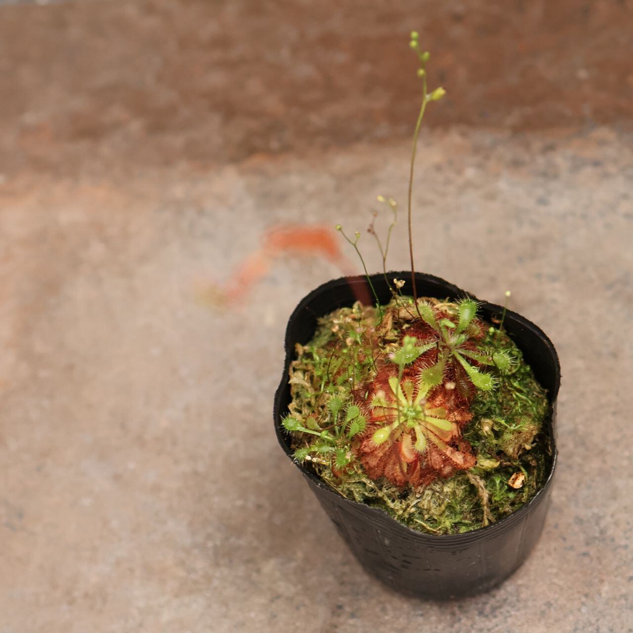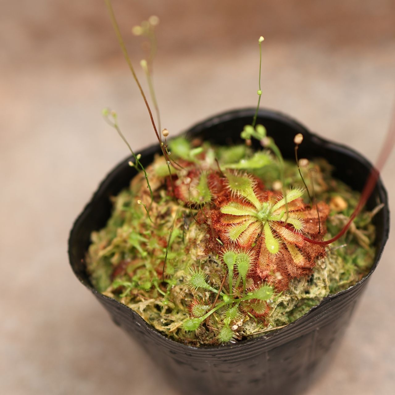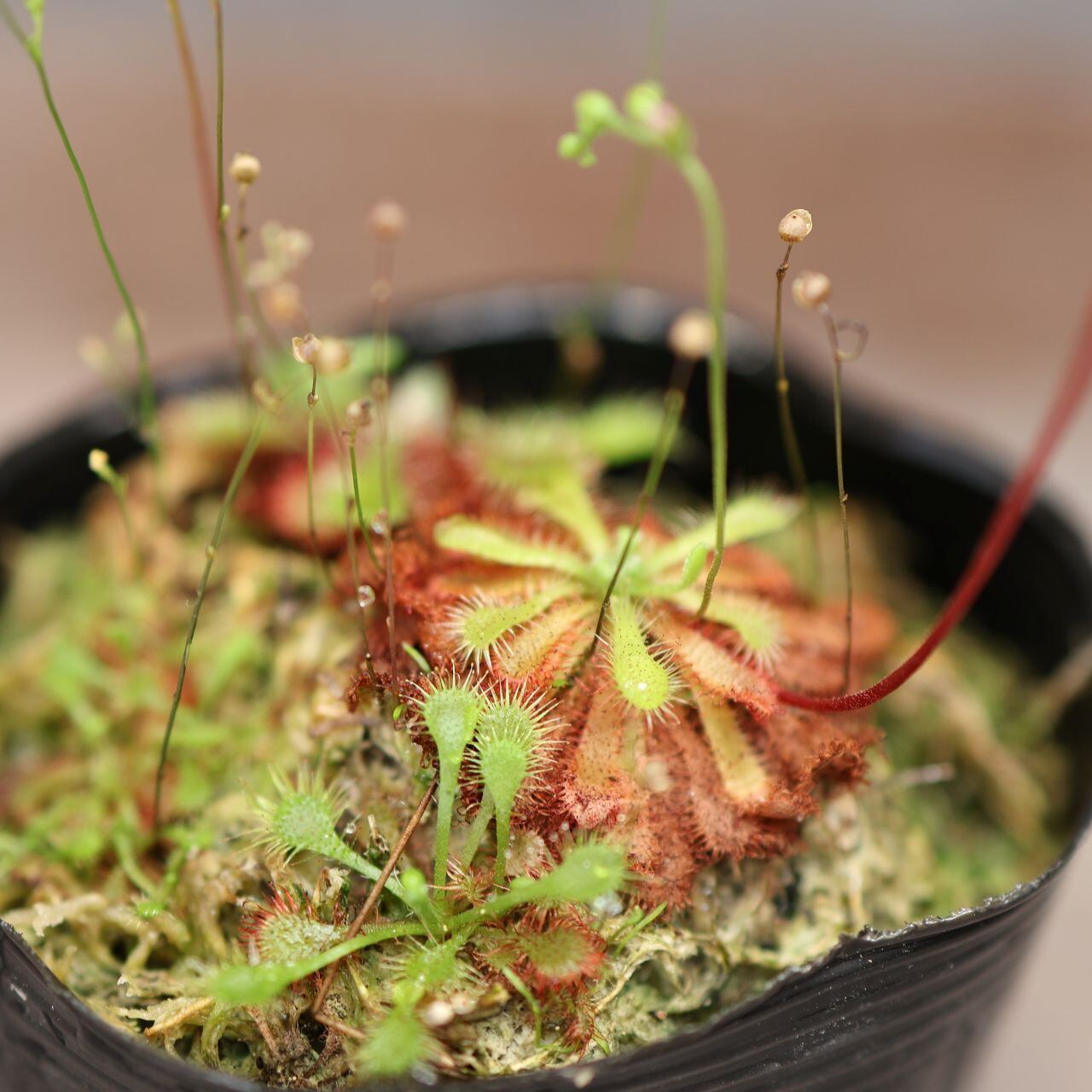 『ドロセラ モウセンゴケDrosera spatulata Var lavellae』は、栄養の少ない湿地に自生する食虫植物です。葉の表面には「腺毛」と呼ばれる毛が密生し、粘液を分泌して虫を捕獲・消化・吸収します。名前に「コケ」とありますが、種子植物に分類され、初夏から夏にかけて白や赤の小さな花を咲かせます。別名「ドロセラ」はラテン語で「露が多い」という意味で、粘液が日光を反射して輝く美しい姿が特徴です。