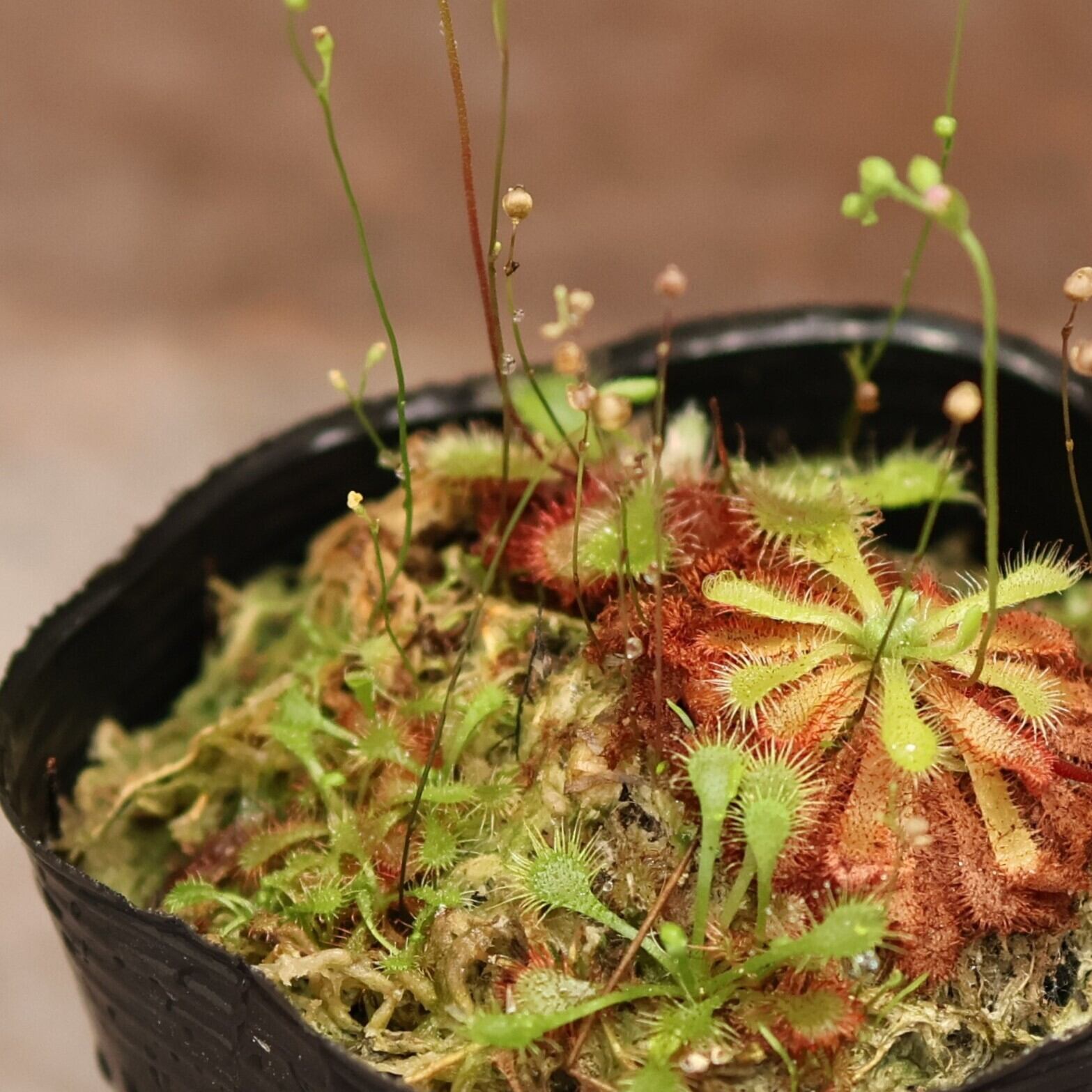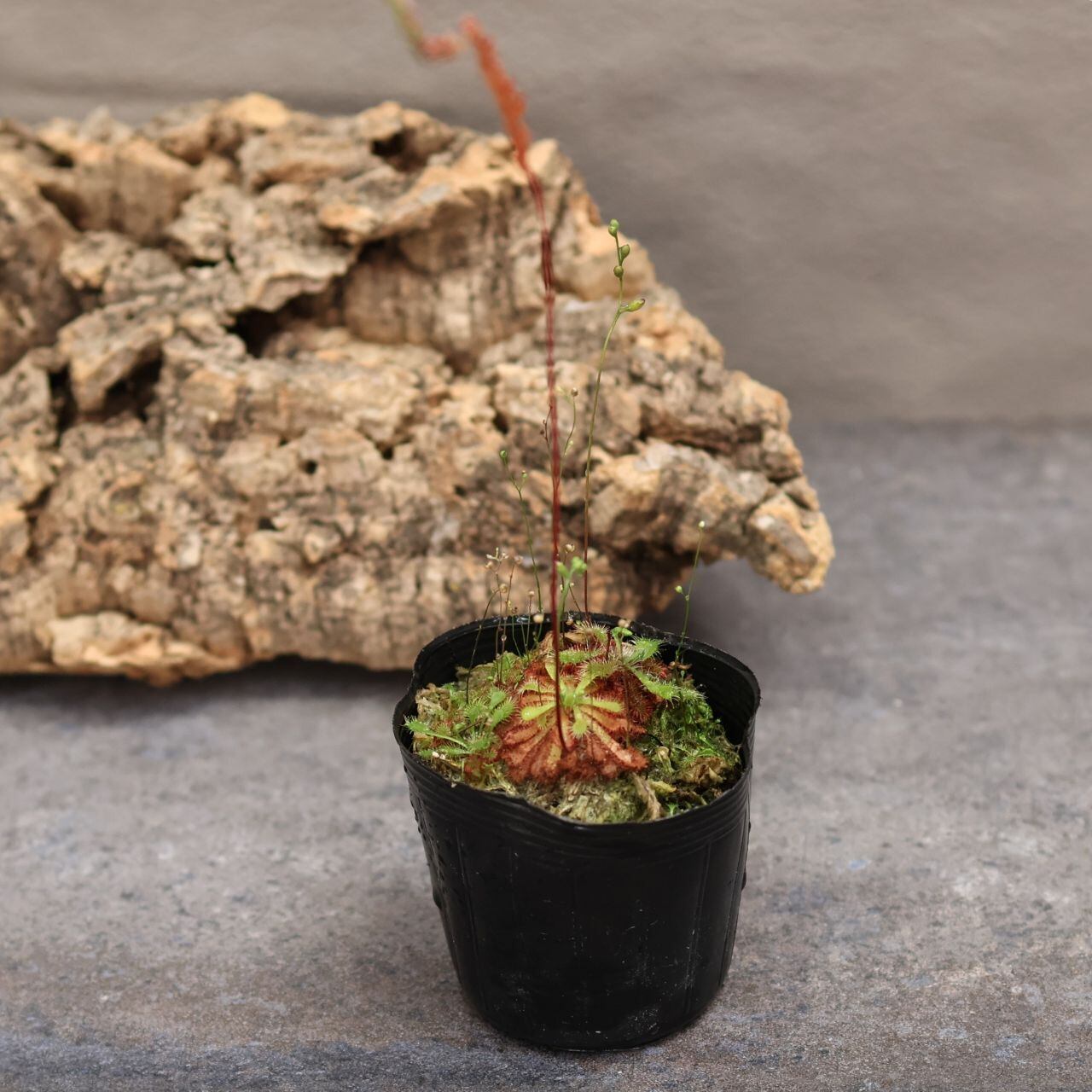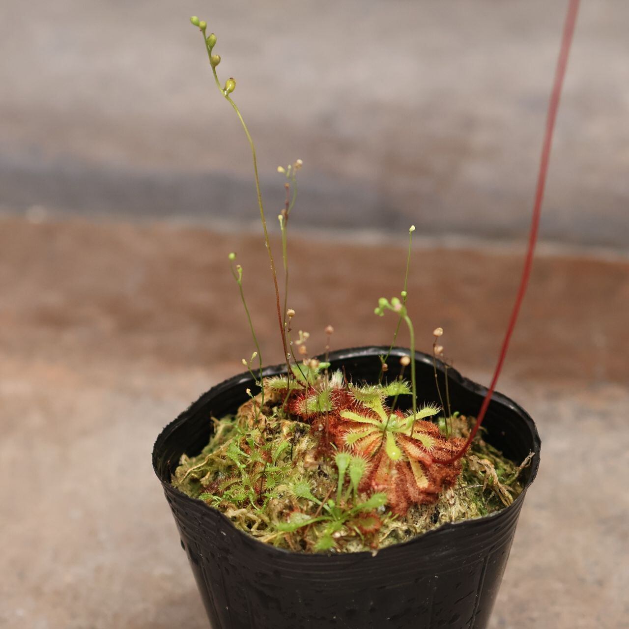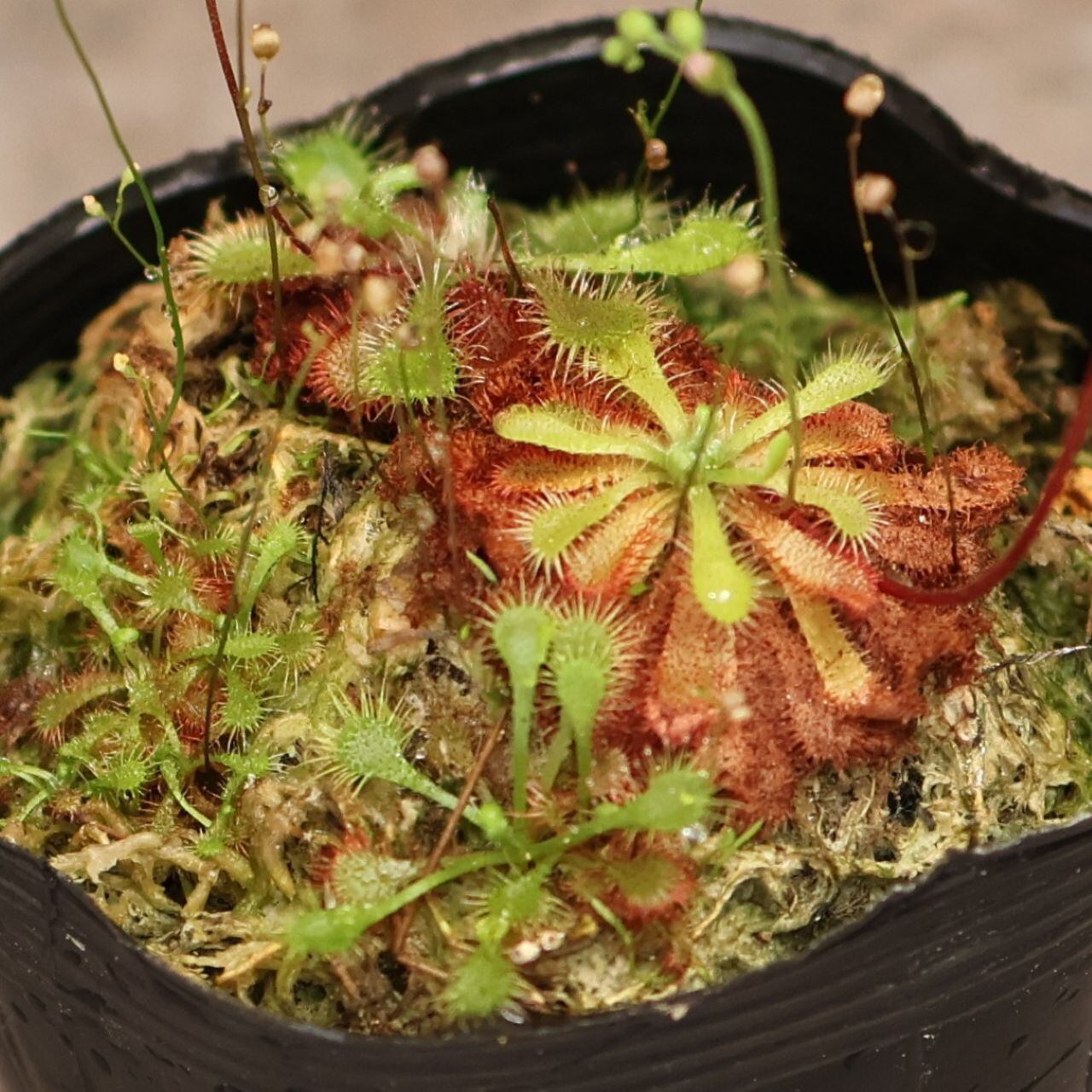 『ドロセラ モウセンゴケDrosera spatulata Var lavellae』は、栄養の少ない湿地に自生する食虫植物です。葉の表面には「腺毛」と呼ばれる毛が密生し、粘液を分泌して虫を捕獲・消化・吸収します。名前に「コケ」とありますが、種子植物に分類され、初夏から夏にかけて白や赤の小さな花を咲かせます。別名「ドロセラ」はラテン語で「露が多い」という意味で、粘液が日光を反射して輝く美しい姿が特徴です。
