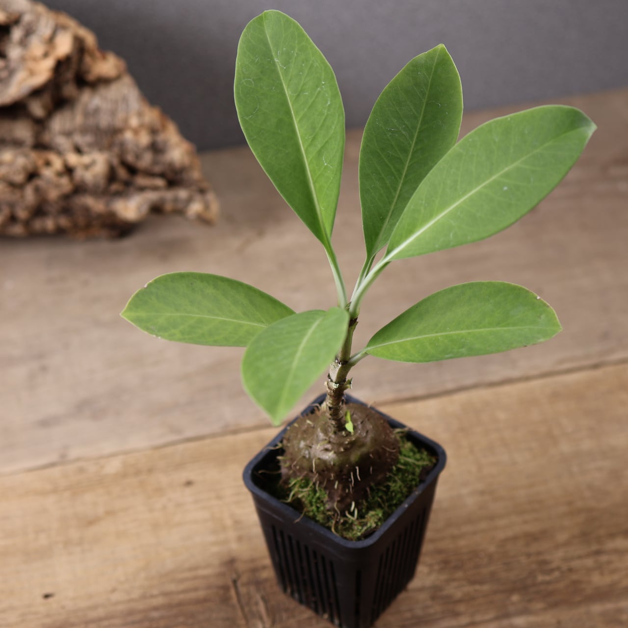 自然界では木に着生し、ふくらんだ根元部分がアリのすみかになることから、「アリノトリデ(蟻の砦)」とも呼ばれています。アカネ科のヒドノフィツムなどと同じく、アリと共生することで知られるユニークな植物です。
