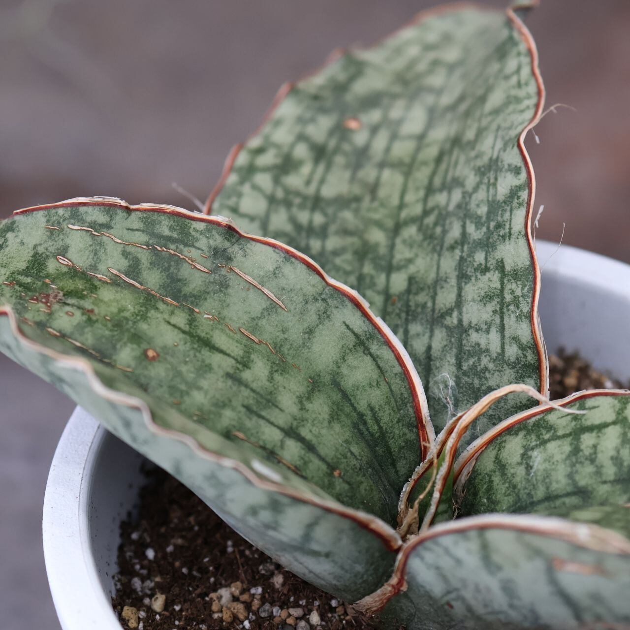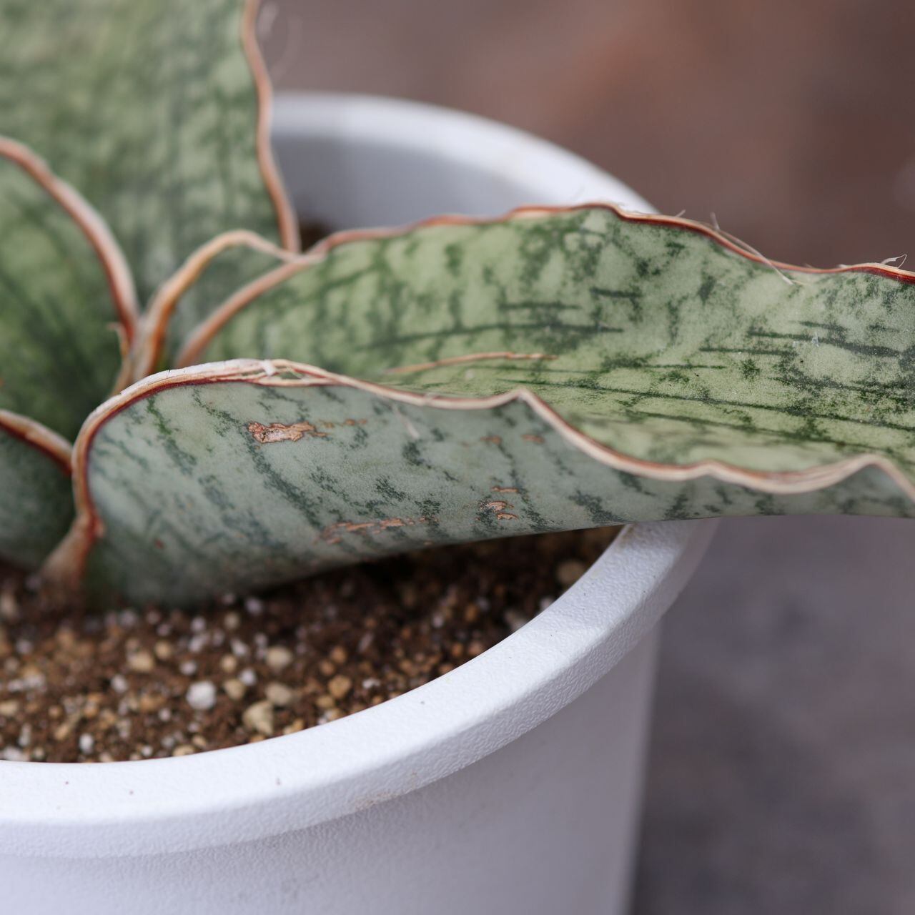 『サンスベリア キルキ―シルバーブルー』は、肉厚で存在感のある葉が特徴の観葉植物です。落ち着いたシルバーブルーの葉に、ほんのりピンク色の縁取りが入ることで、シックさの中にかわいらしさも感じられる魅力的な品種です。
