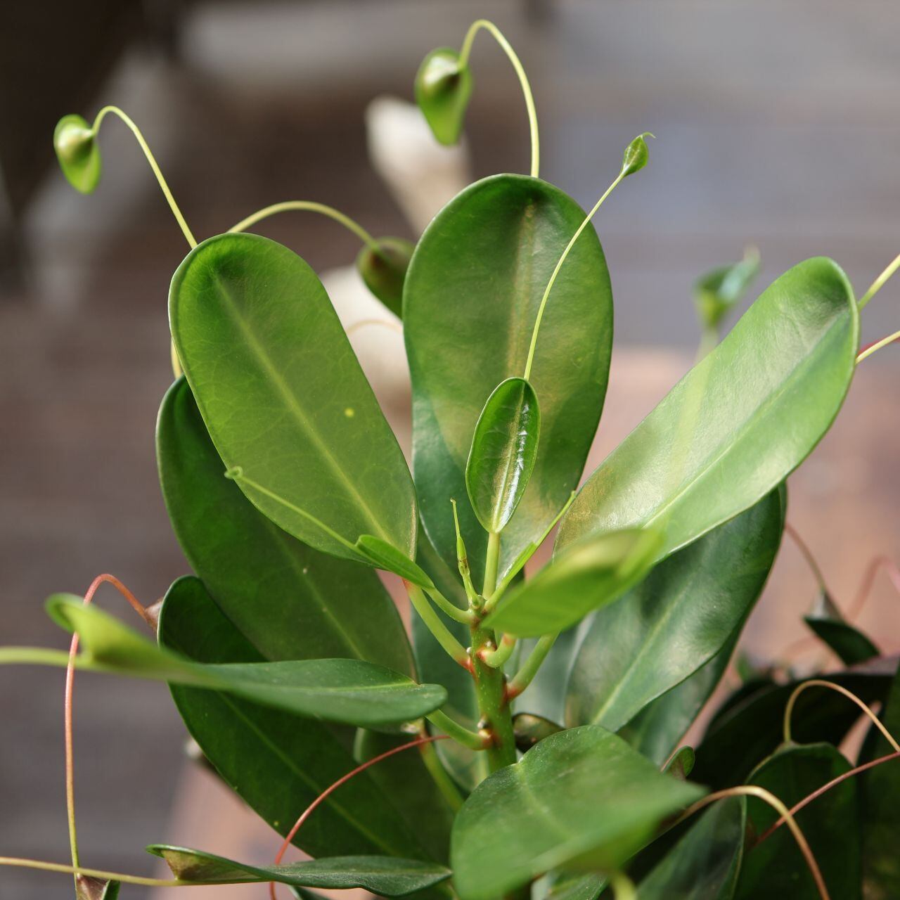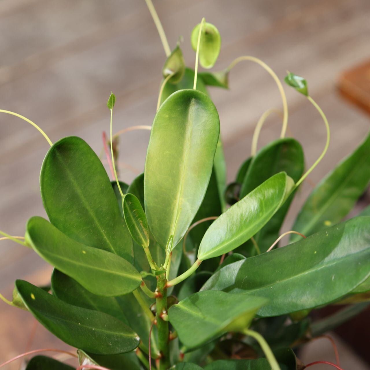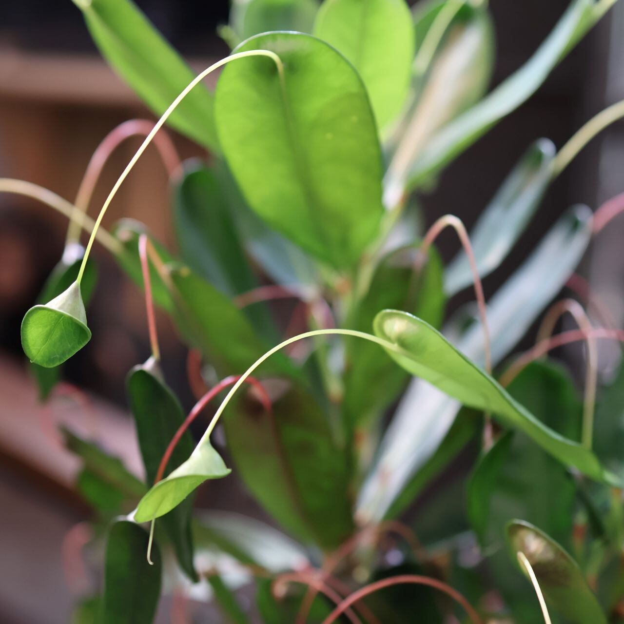 クロトンは、沢山種類がある中でこちらは飛葉クロトンと呼ばれる品種。葉の先に小さい葉がピョンピョンと飛んでいるように付いている姿がとてもかわいい観葉植物です。