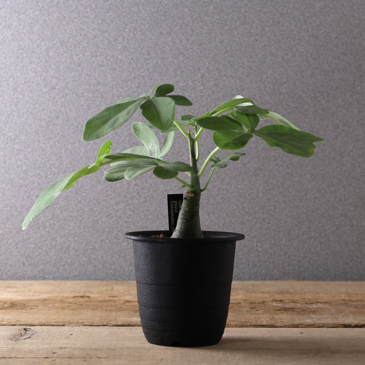 『アデニア・グラウカ』は、乾燥した草原地帯などに自生しています。株の幹は緑色の肌をしていて、幹が太るにつれ、マットな渋い青緑色に変わります。幹はとっくり形に育ちます。生育期にはつるが長く伸び、葉を出し、夏の光を自らの葉で遮光します。休眠期になると落葉し、つるも少し枯れます。春に芽吹き始めたら、枯れた部分を切って整えます。