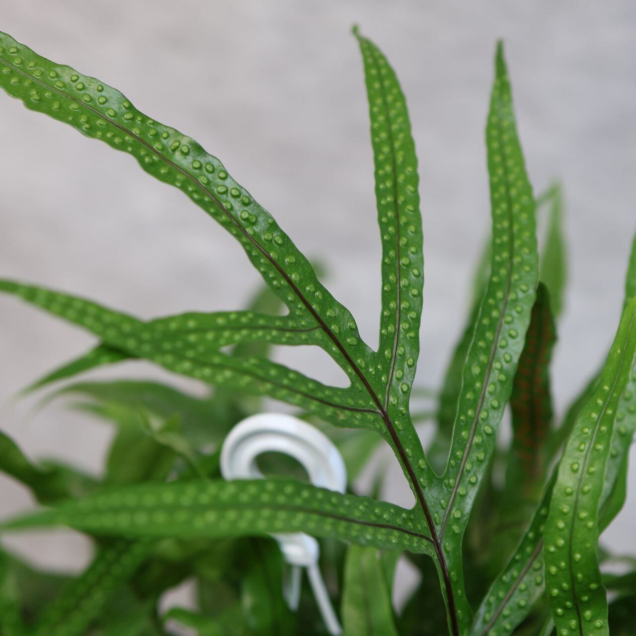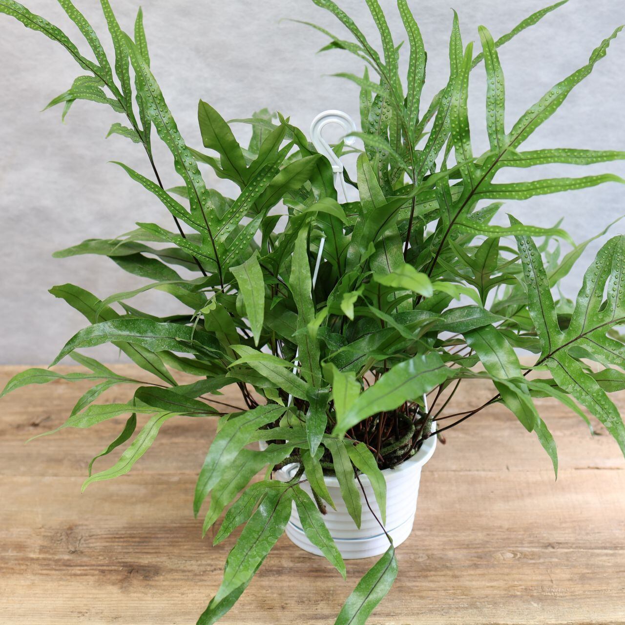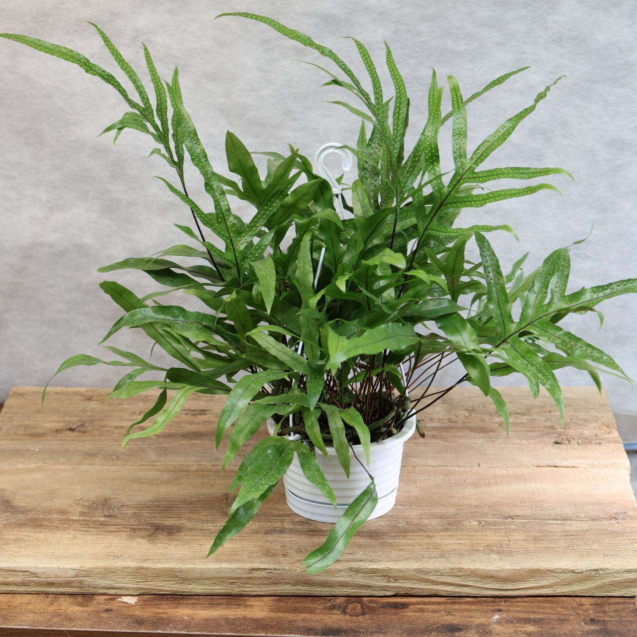 『カンガルーファン』はオーストラリア・ニュージーランド原産で、つやのある細めの葉がわさっとたくさん茂るようすが魅力的な常緑性のシダの仲間。カンガルーの前足のような様子からこの名があります。鉢から外にぐんぐん伸びてくる根も野性味があります。