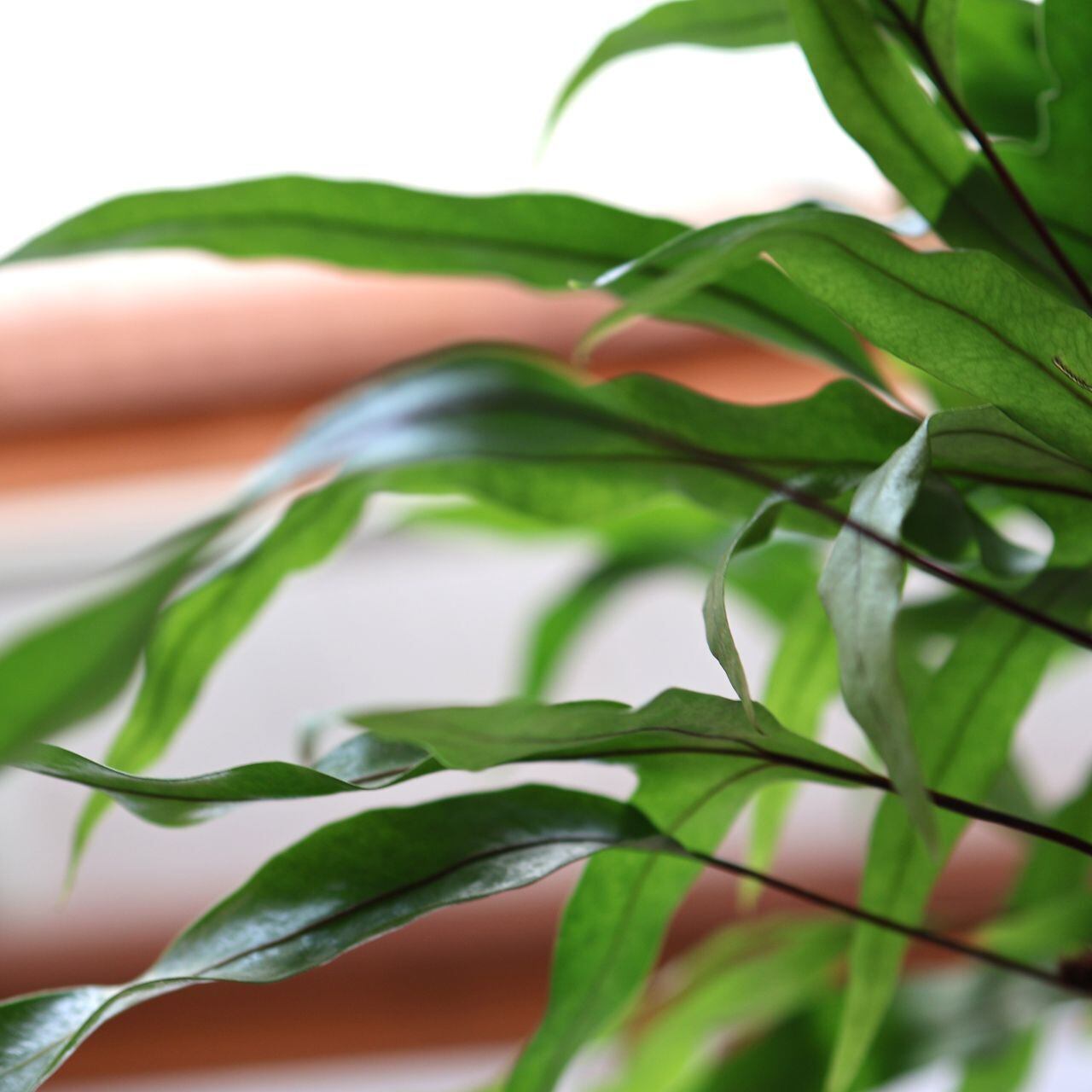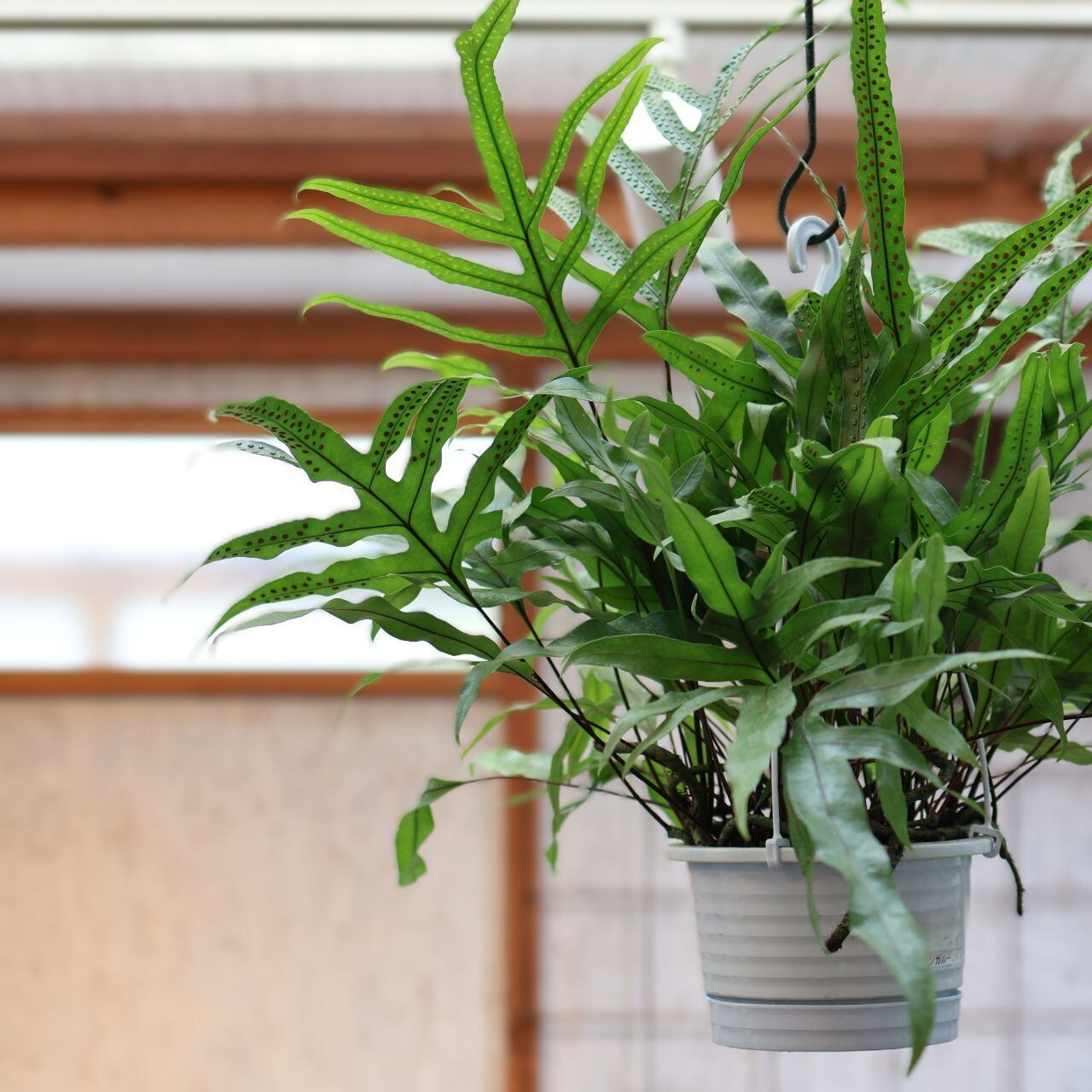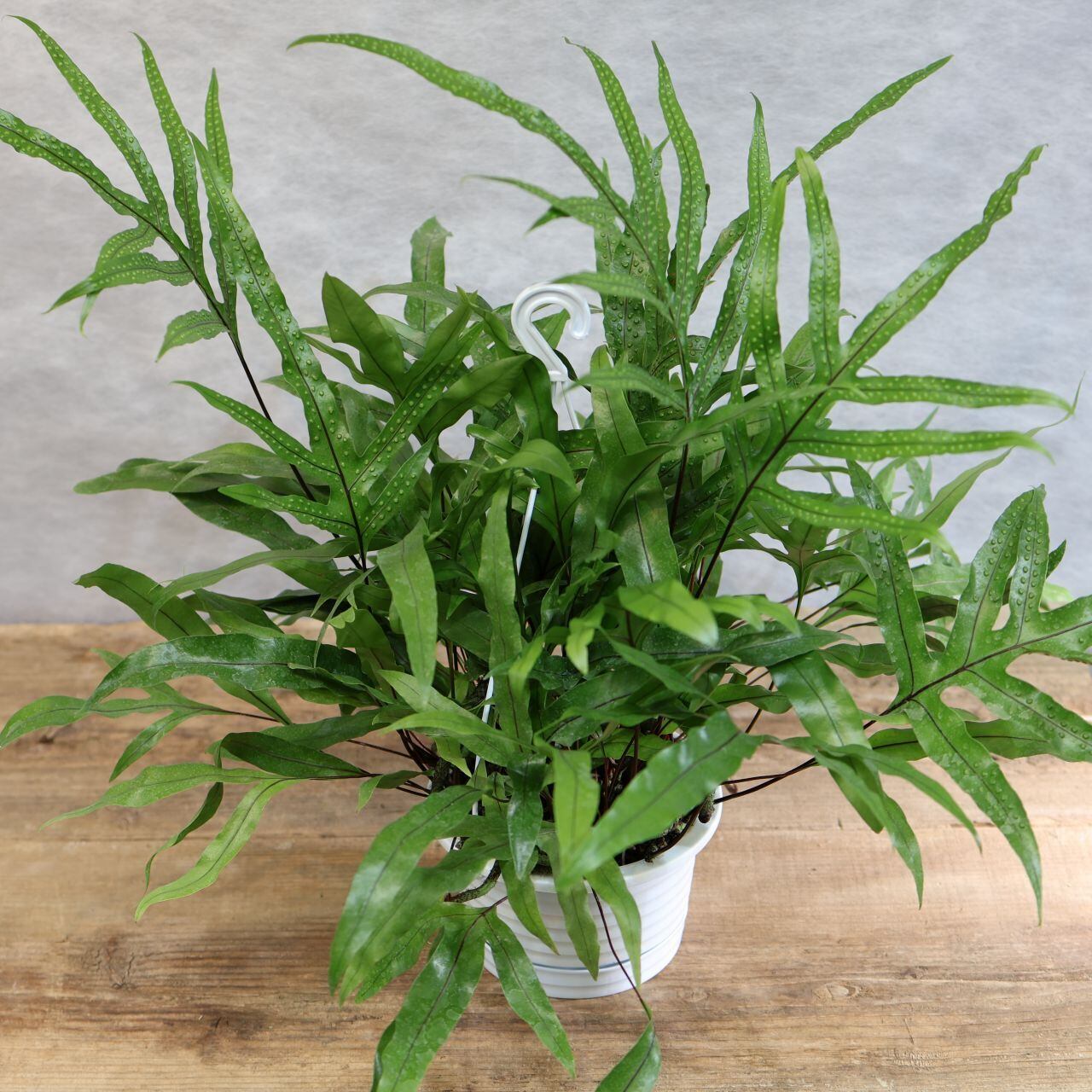『カンガルーファン』はオーストラリア・ニュージーランド原産で、つやのある細めの葉がわさっとたくさん茂るようすが魅力的な常緑性のシダの仲間。カンガルーの前足のような様子からこの名があります。鉢から外にぐんぐん伸びてくる根も野性味があります。