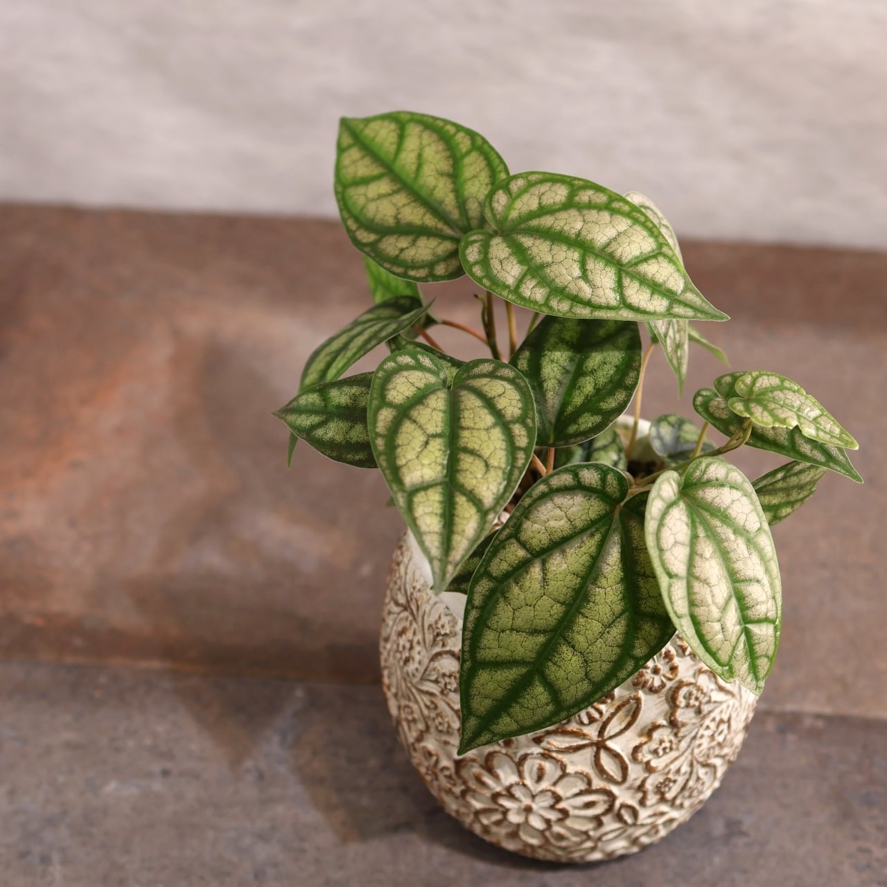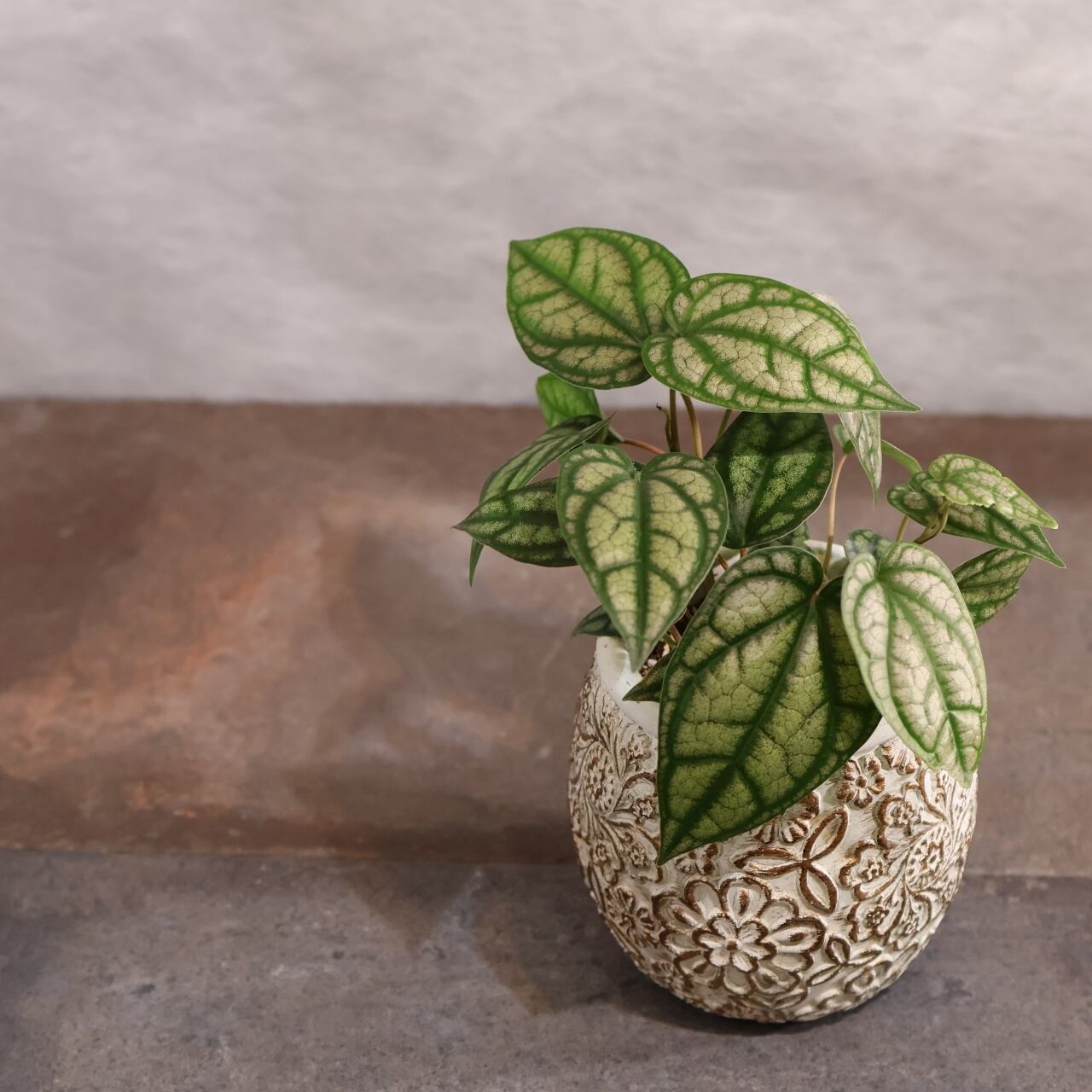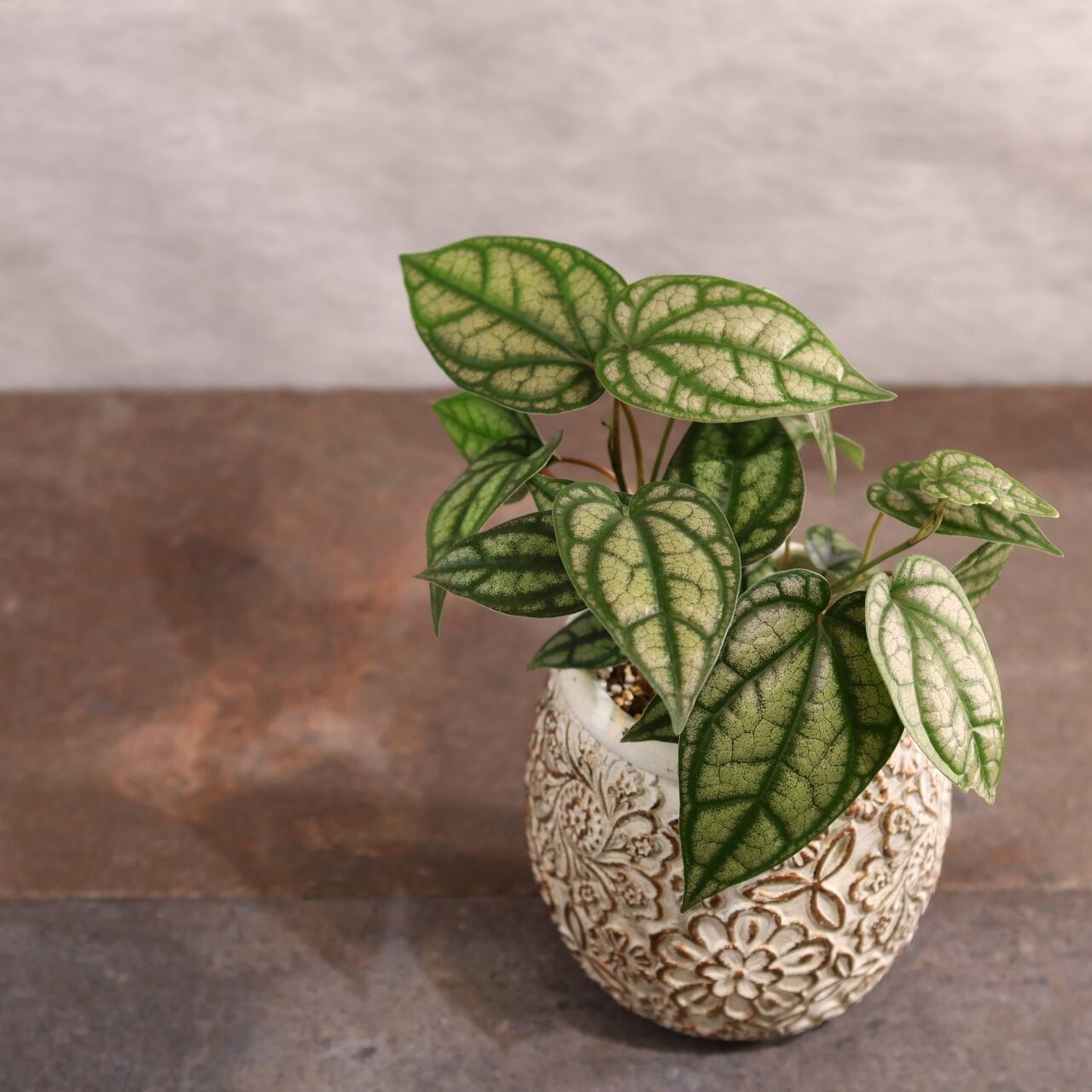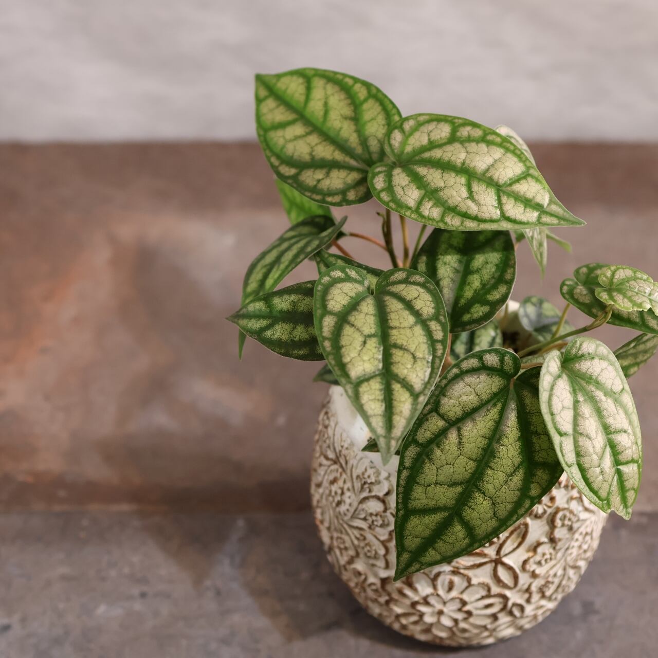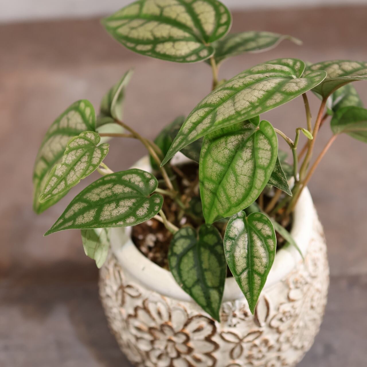 ピペル・シルバティクムは、深い森の中でしっとりと育つツル性の観葉植物。ハート型の葉に浮かぶメタリックな葉脈模様は、まるで月明かりに照らされた宝石のよう。
