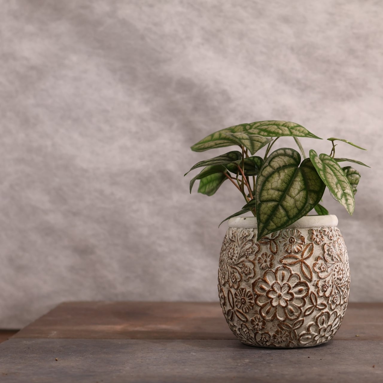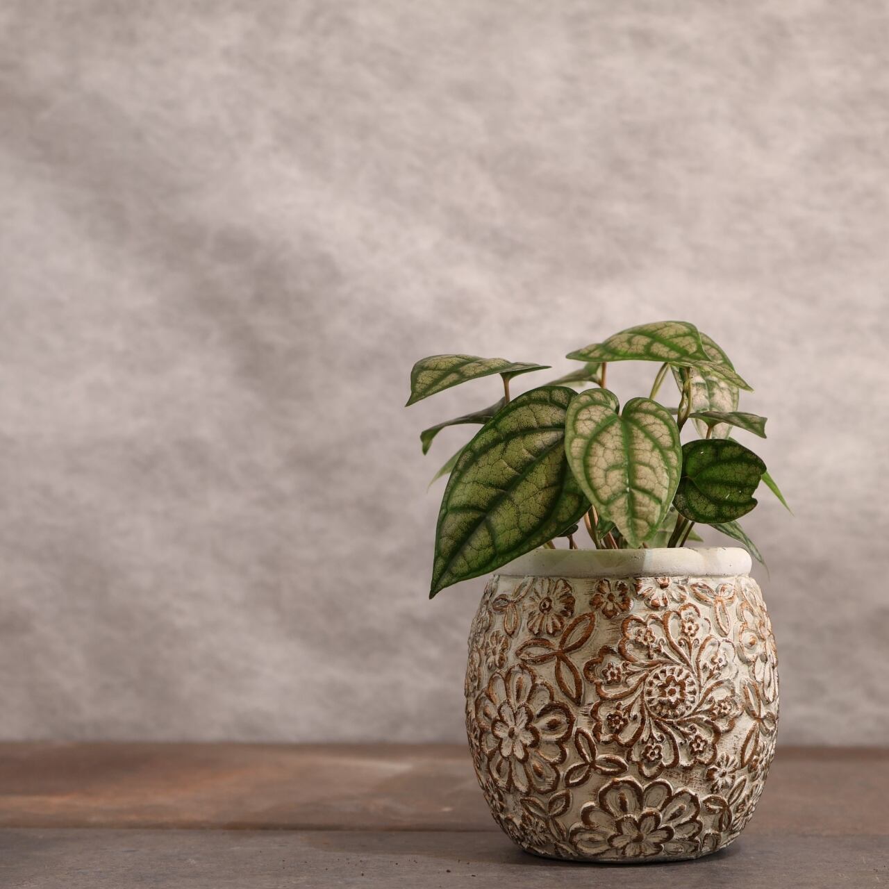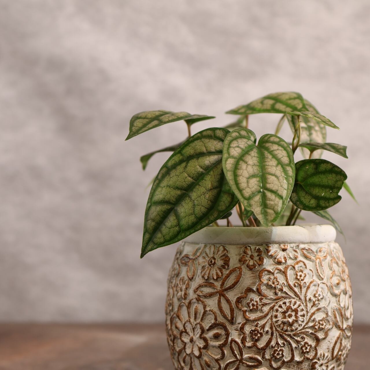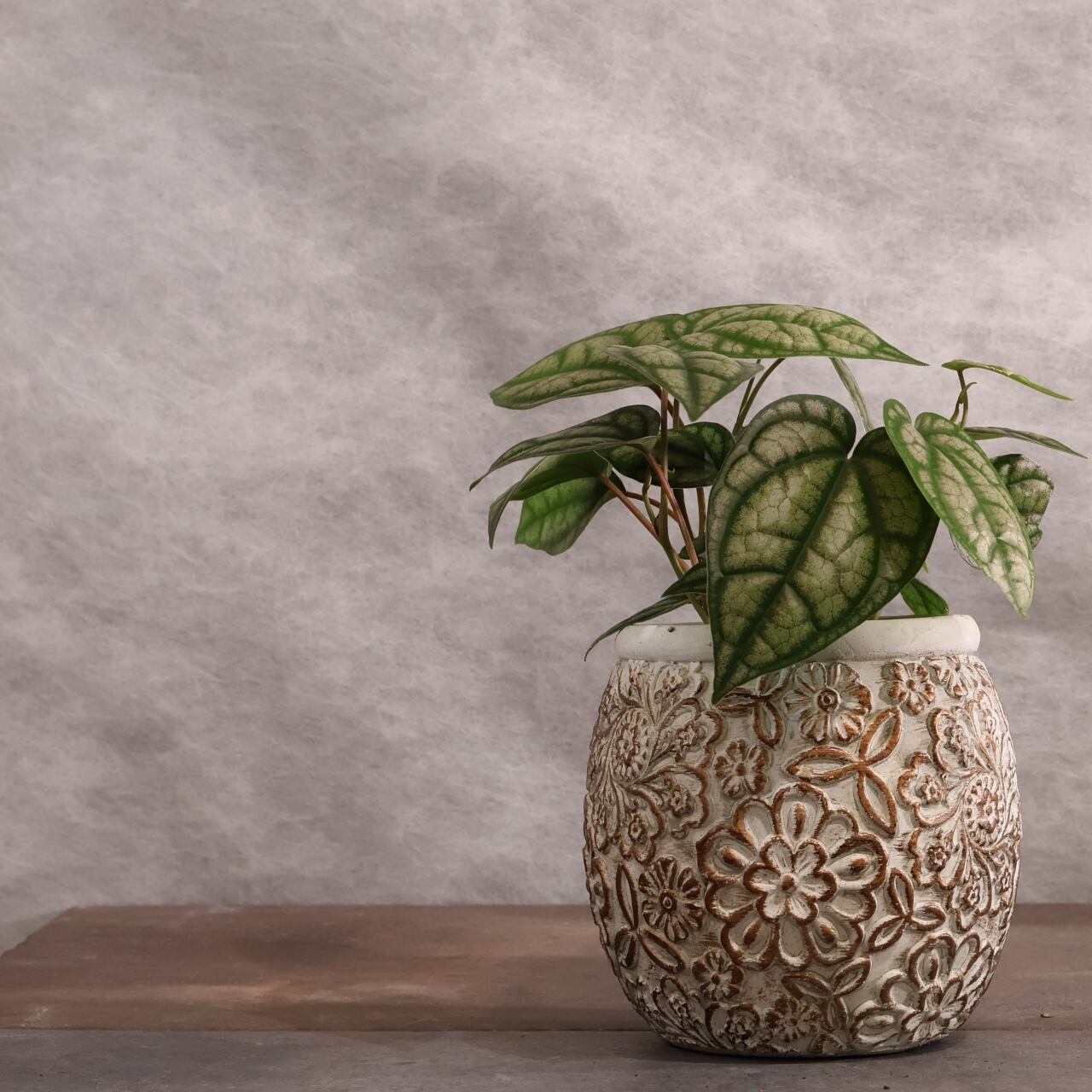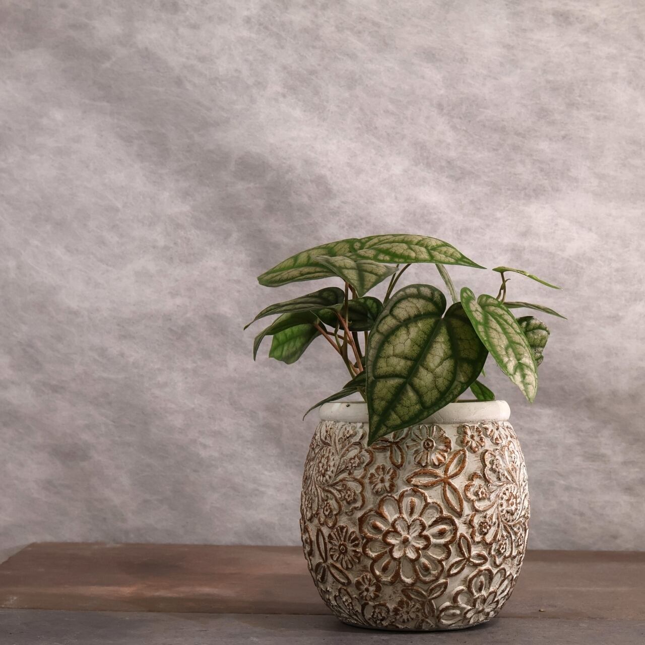 ピペル・シルバティクムは、深い森の中でしっとりと育つツル性の観葉植物。ハート型の葉に浮かぶメタリックな葉脈模様は、まるで月明かりに照らされた宝石のよう。