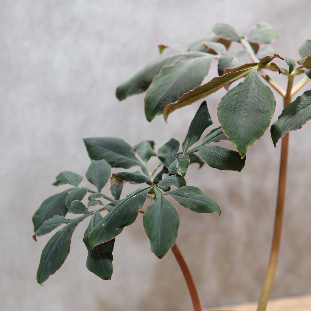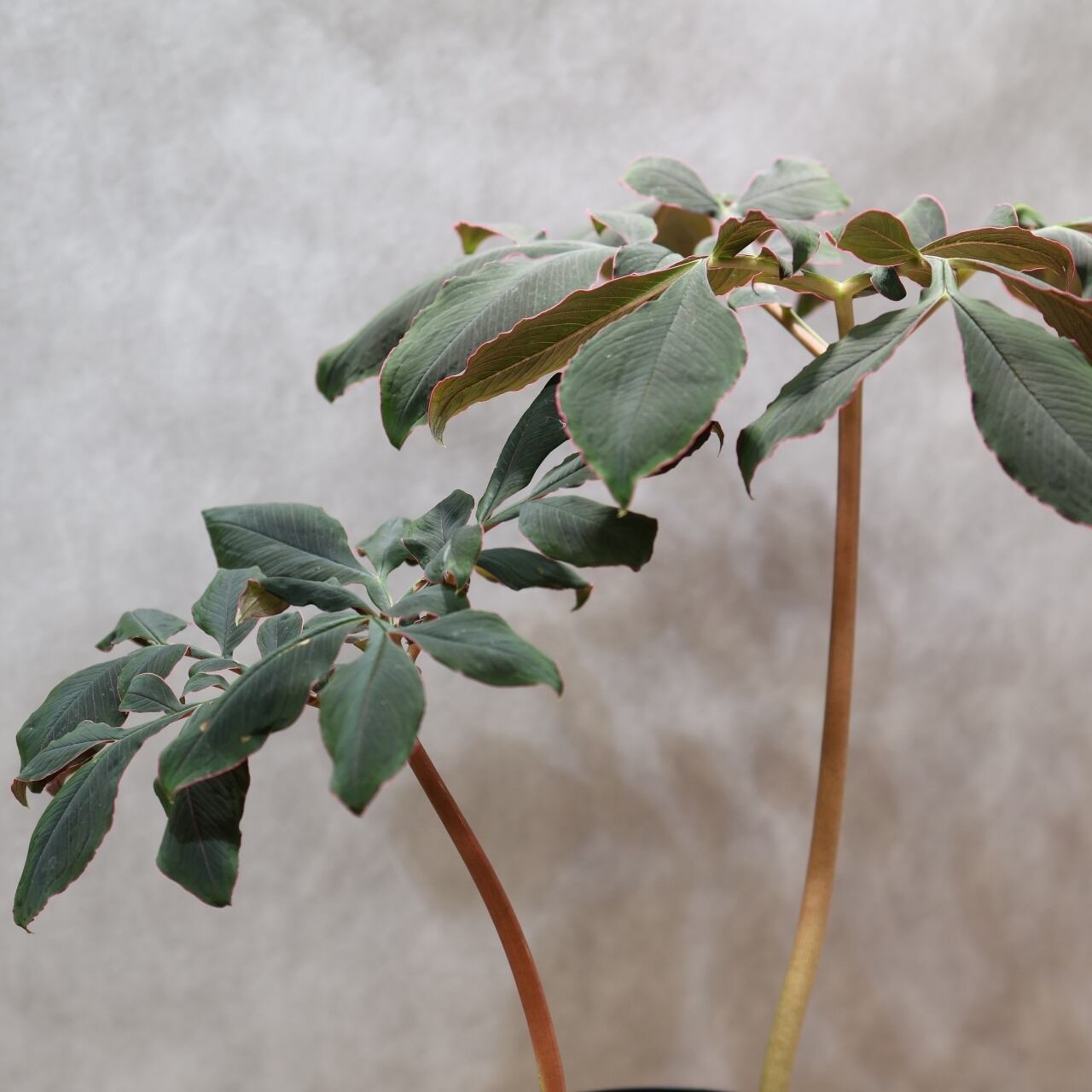 このアトロビリディスは特に葉が美しい品種で、赤い茎と少し丸みを帯びた黒質な葉が非常に美しいタイ南部原産の小型球根性アロイドです。