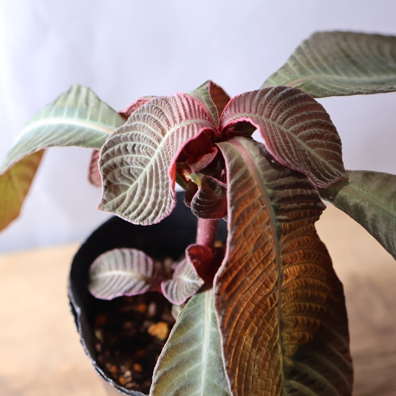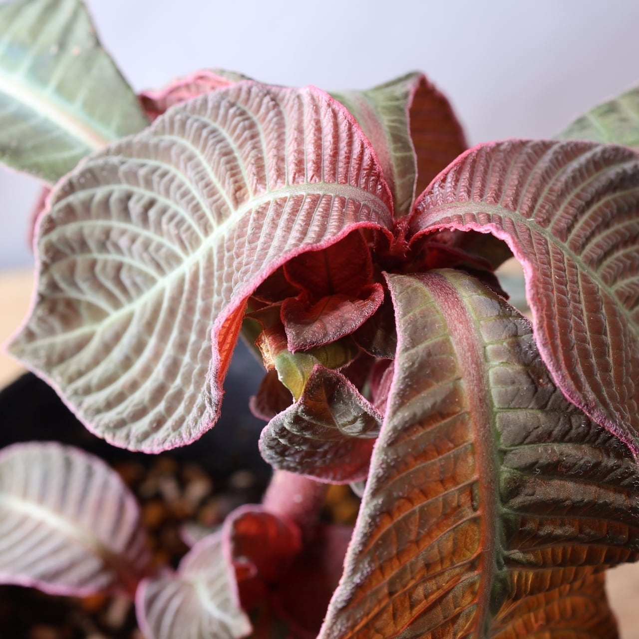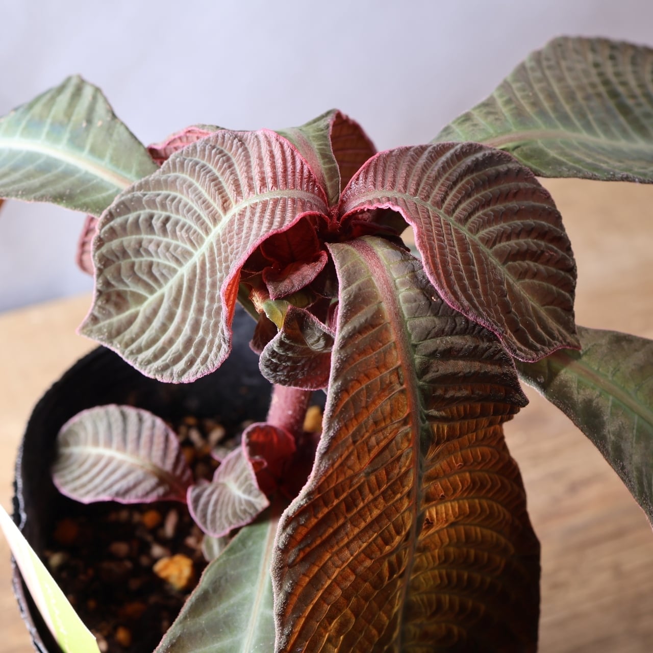 最大の魅力はそのビロード質のダークグリーンの葉と、鮮やかな赤い葉脈。