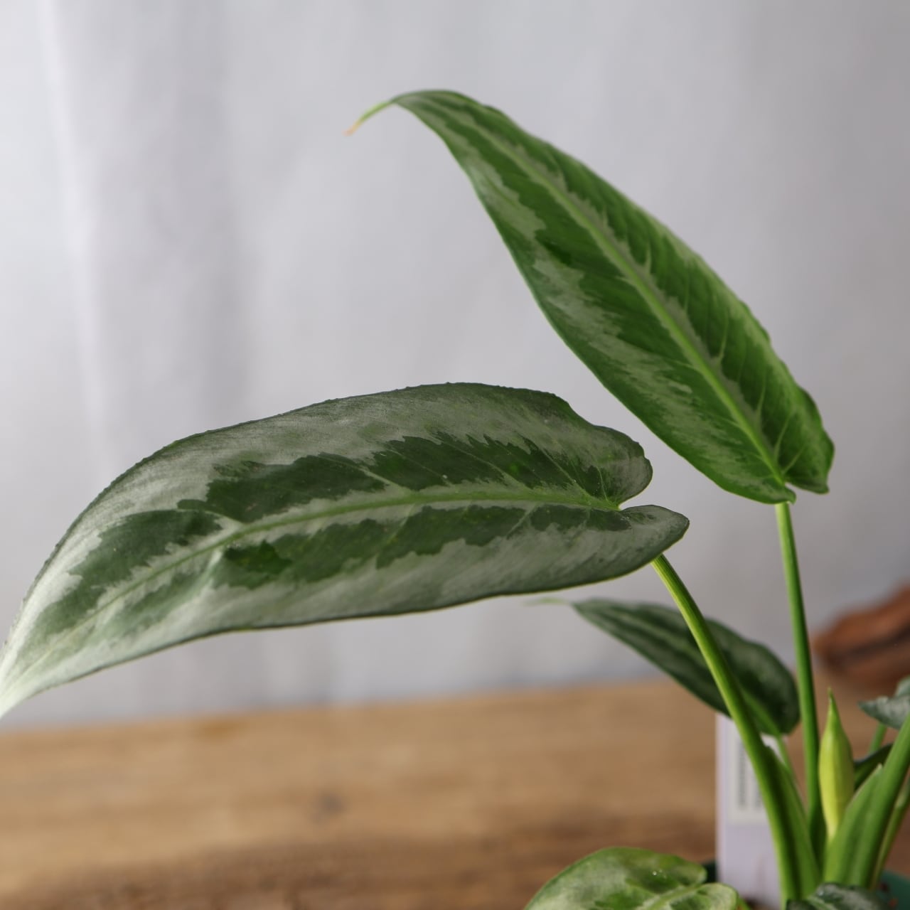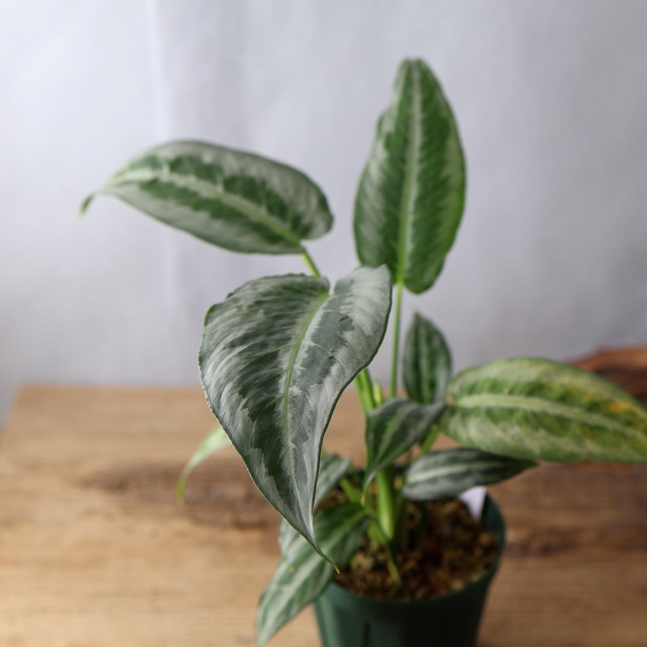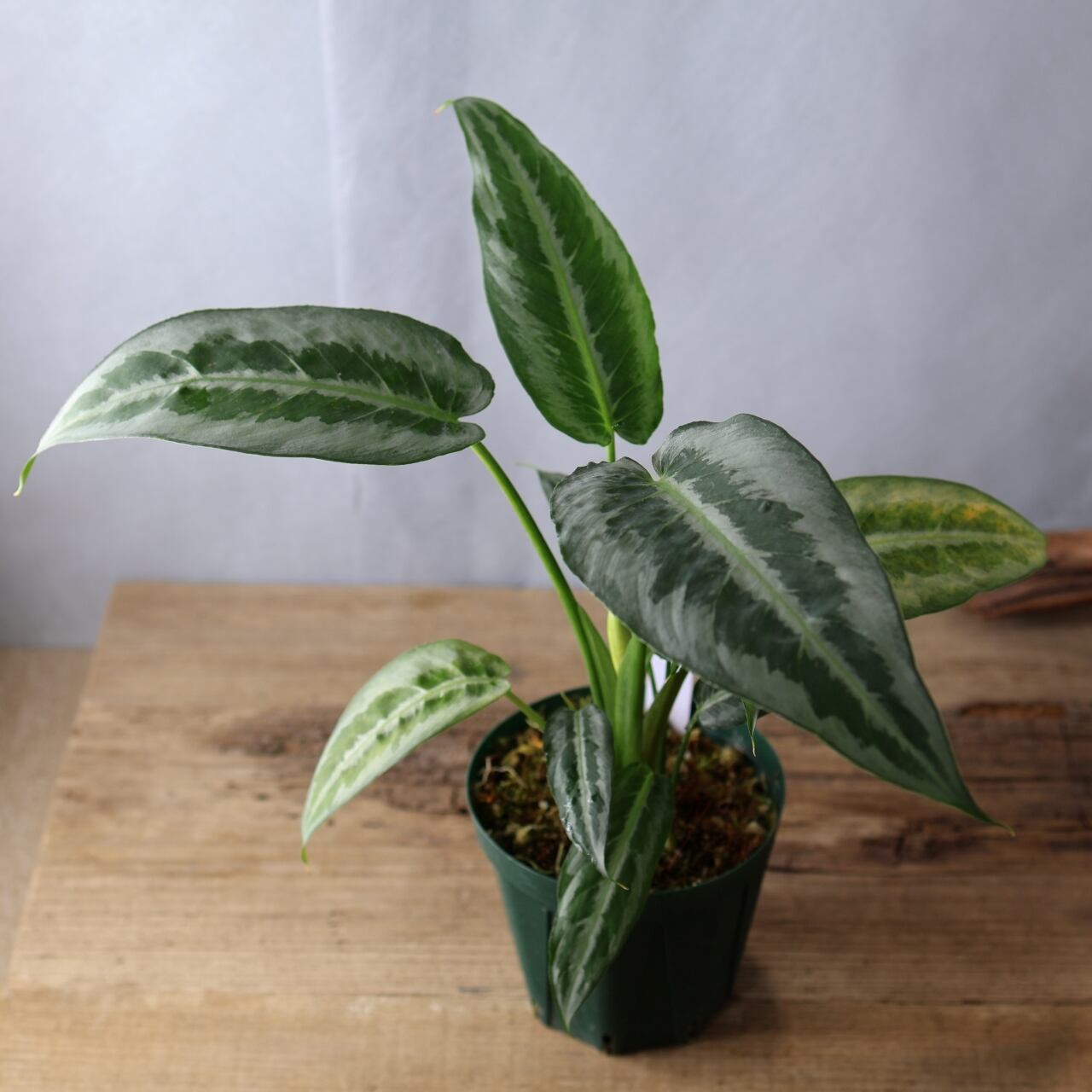 スキスマトグロッティス ハイナエンシスは、シルバーの葉色に、ハケで書いたようなダークグリーンの斑入り葉が美しいサトイモ科の観葉植物です。