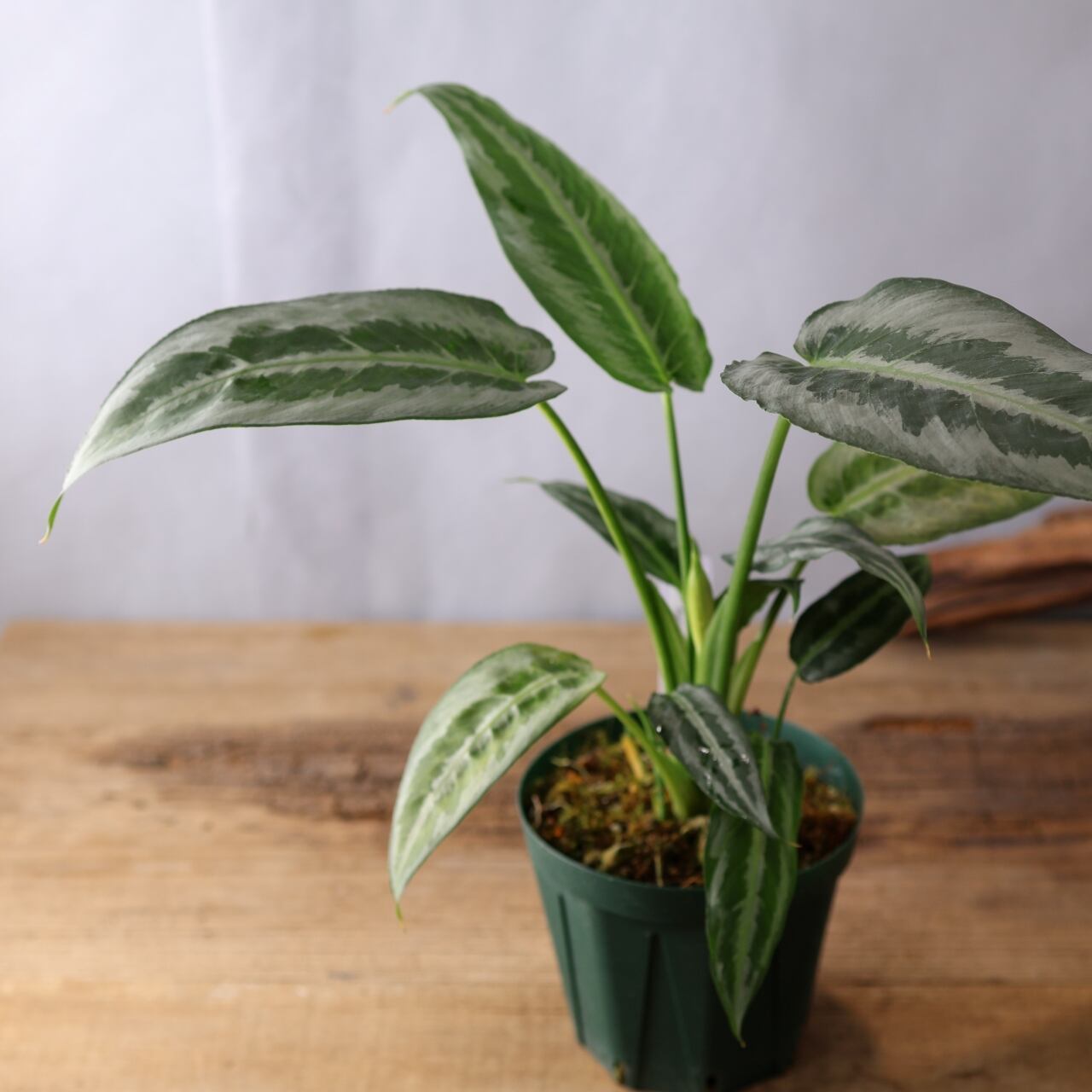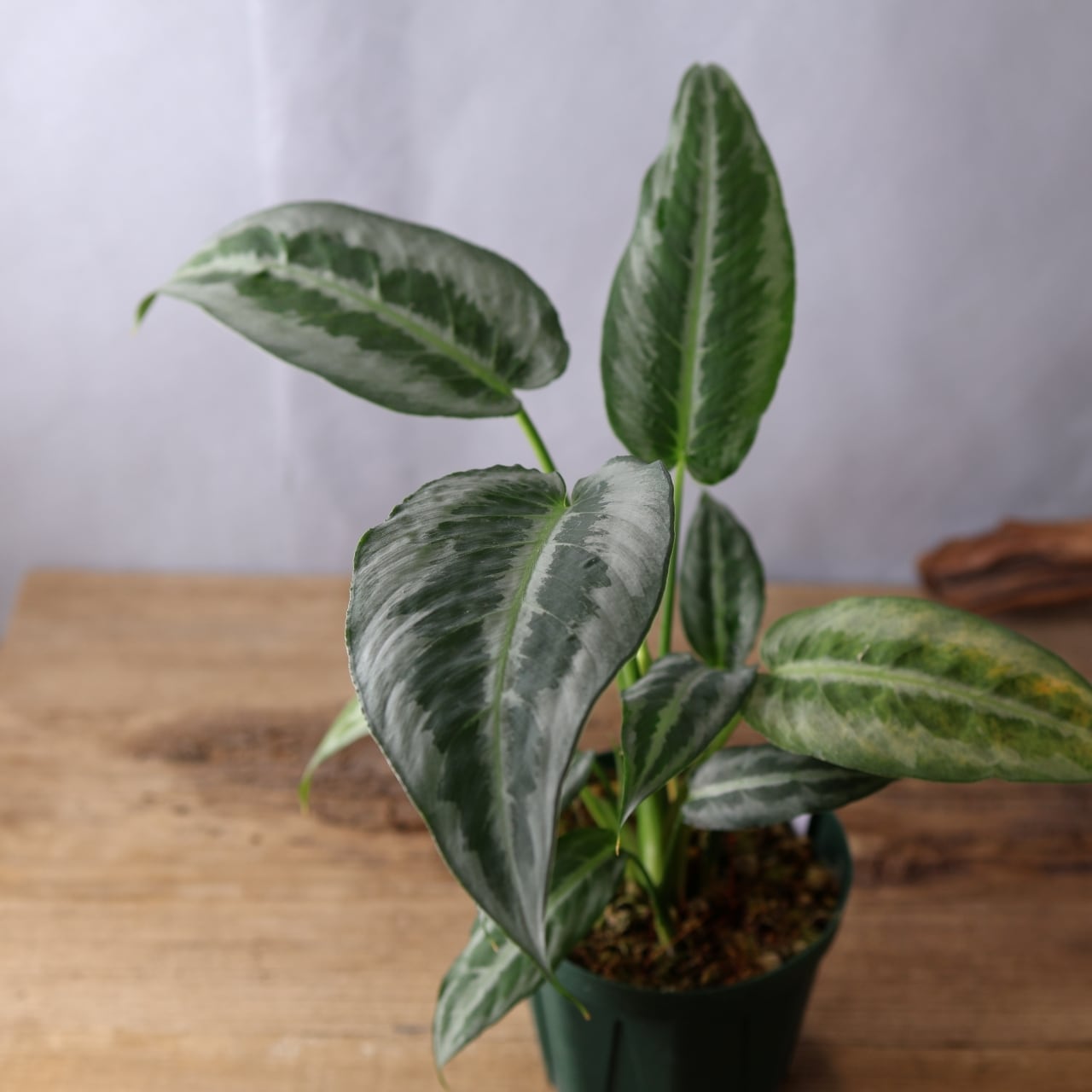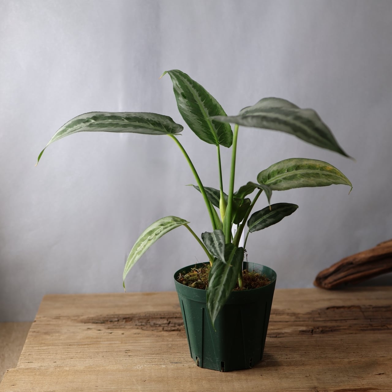 スキスマトグロッティス ハイナエンシスは、シルバーの葉色に、ハケで書いたようなダークグリーンの斑入り葉が美しいサトイモ科の観葉植物です。