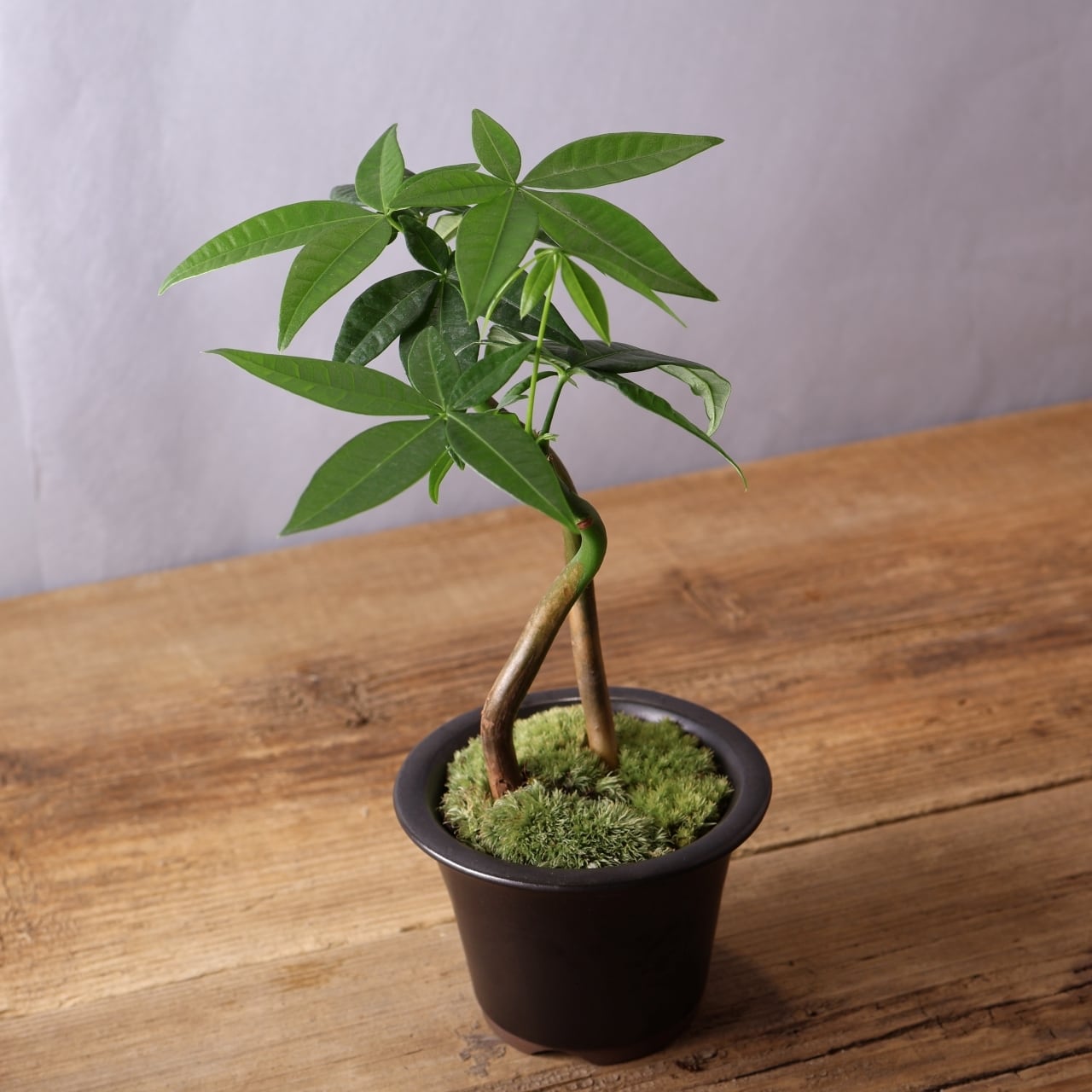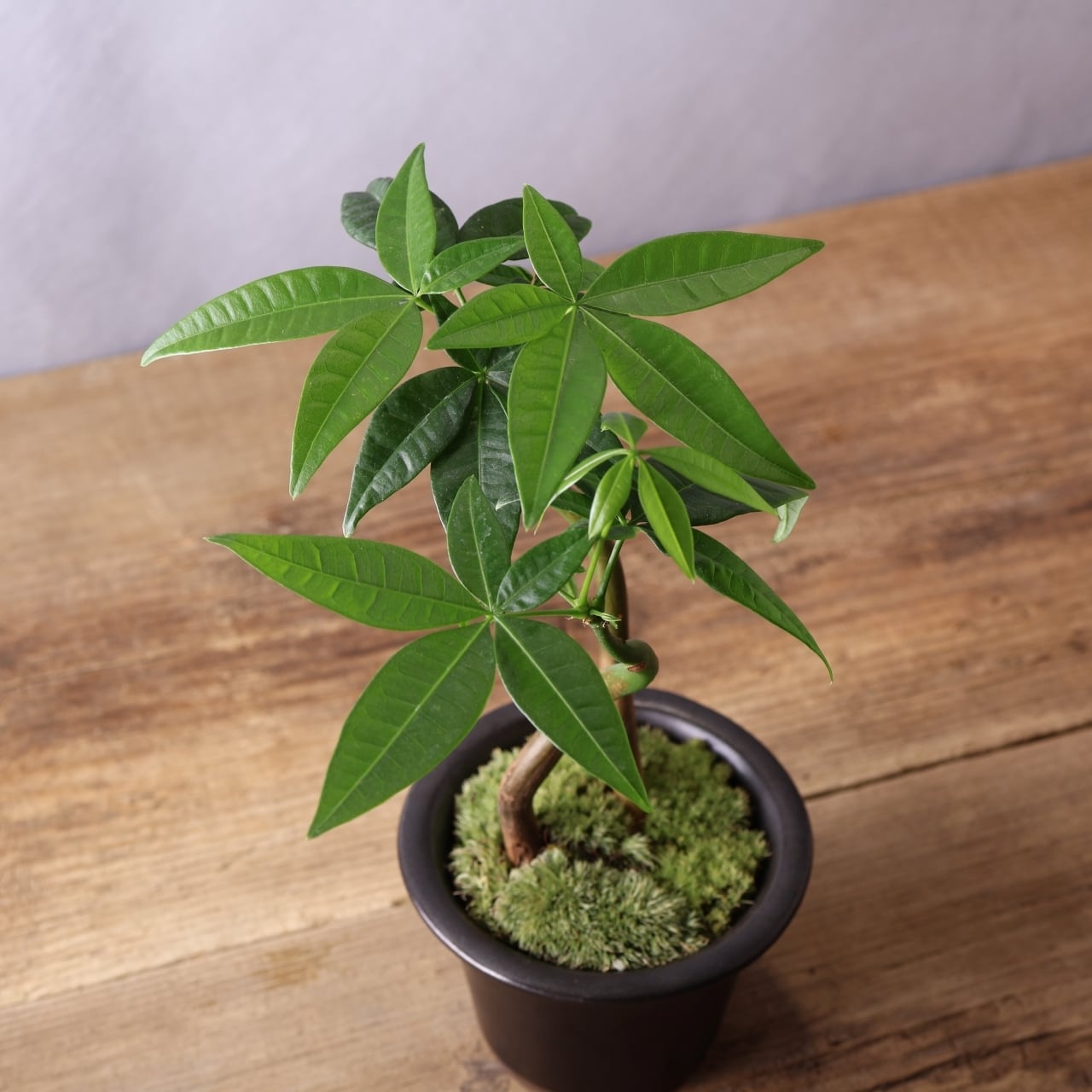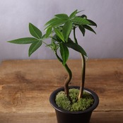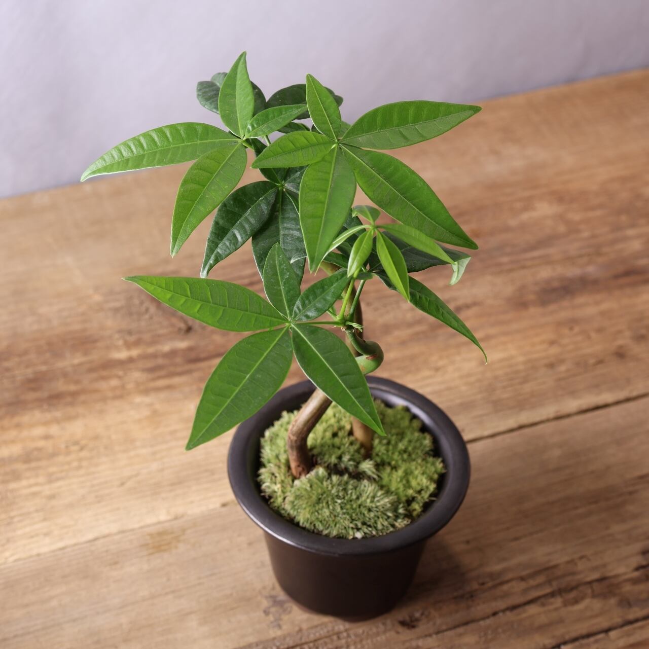 パキラは光沢のある掌状の葉と、編み込みや太い幹姿が特徴的な観葉植物。