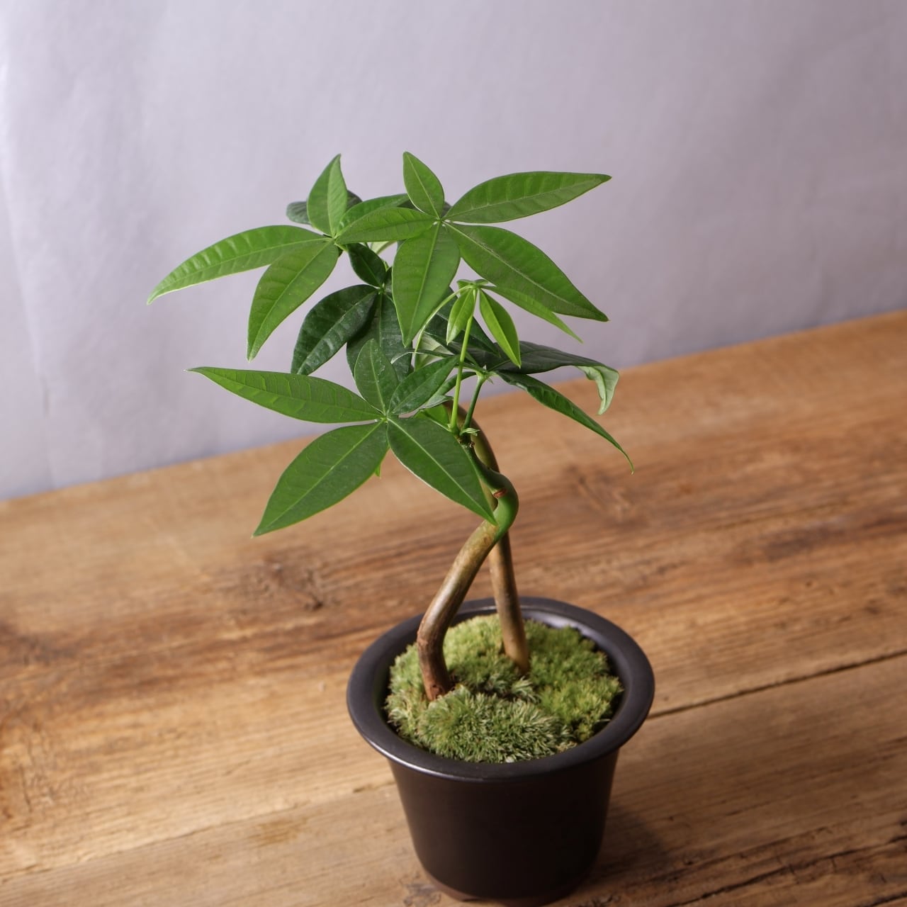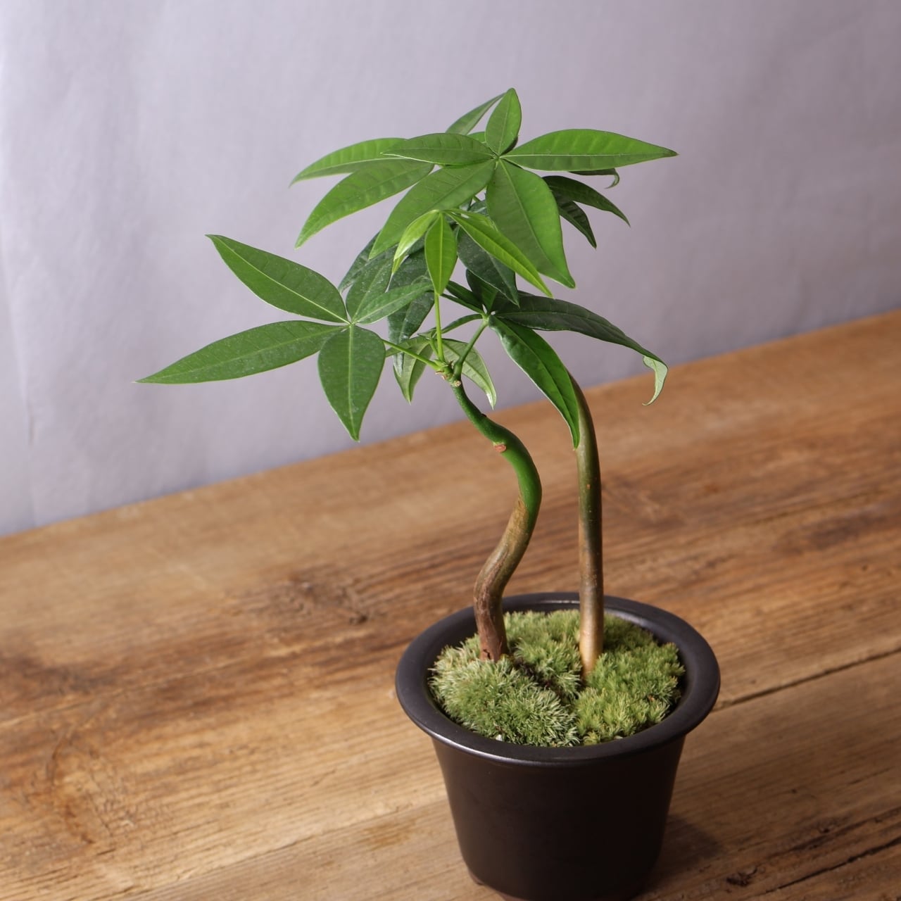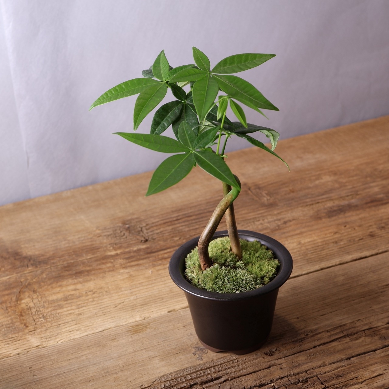 パキラは光沢のある掌状の葉と、編み込みや太い幹姿が特徴的な観葉植物。