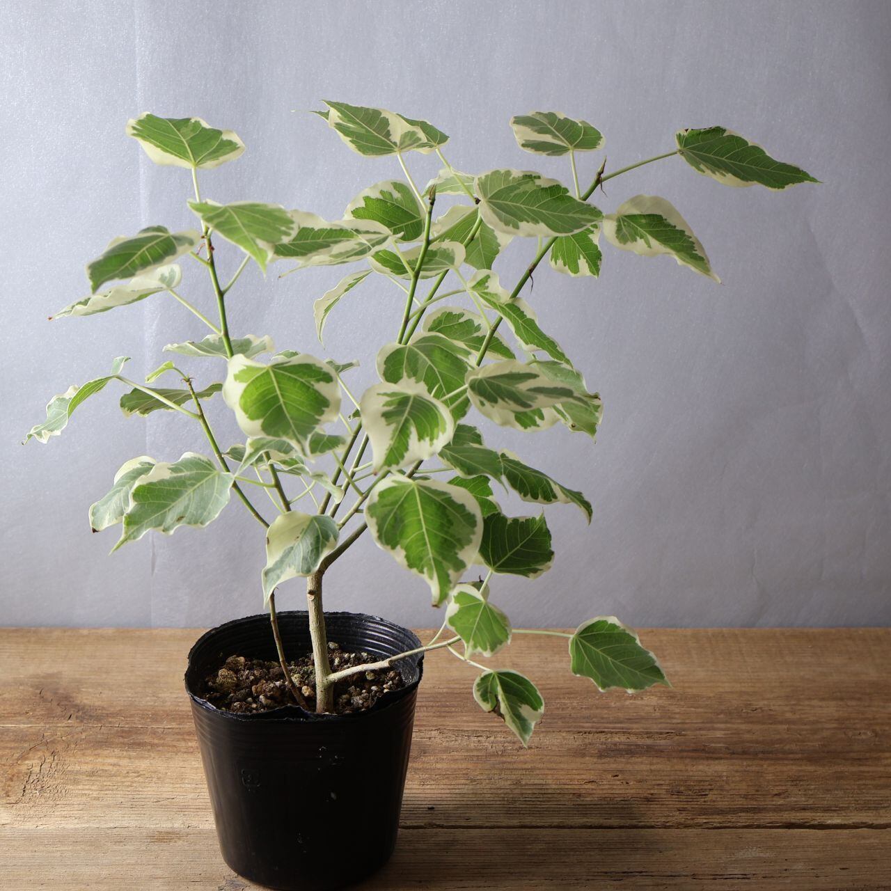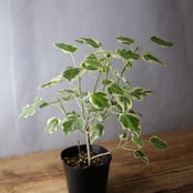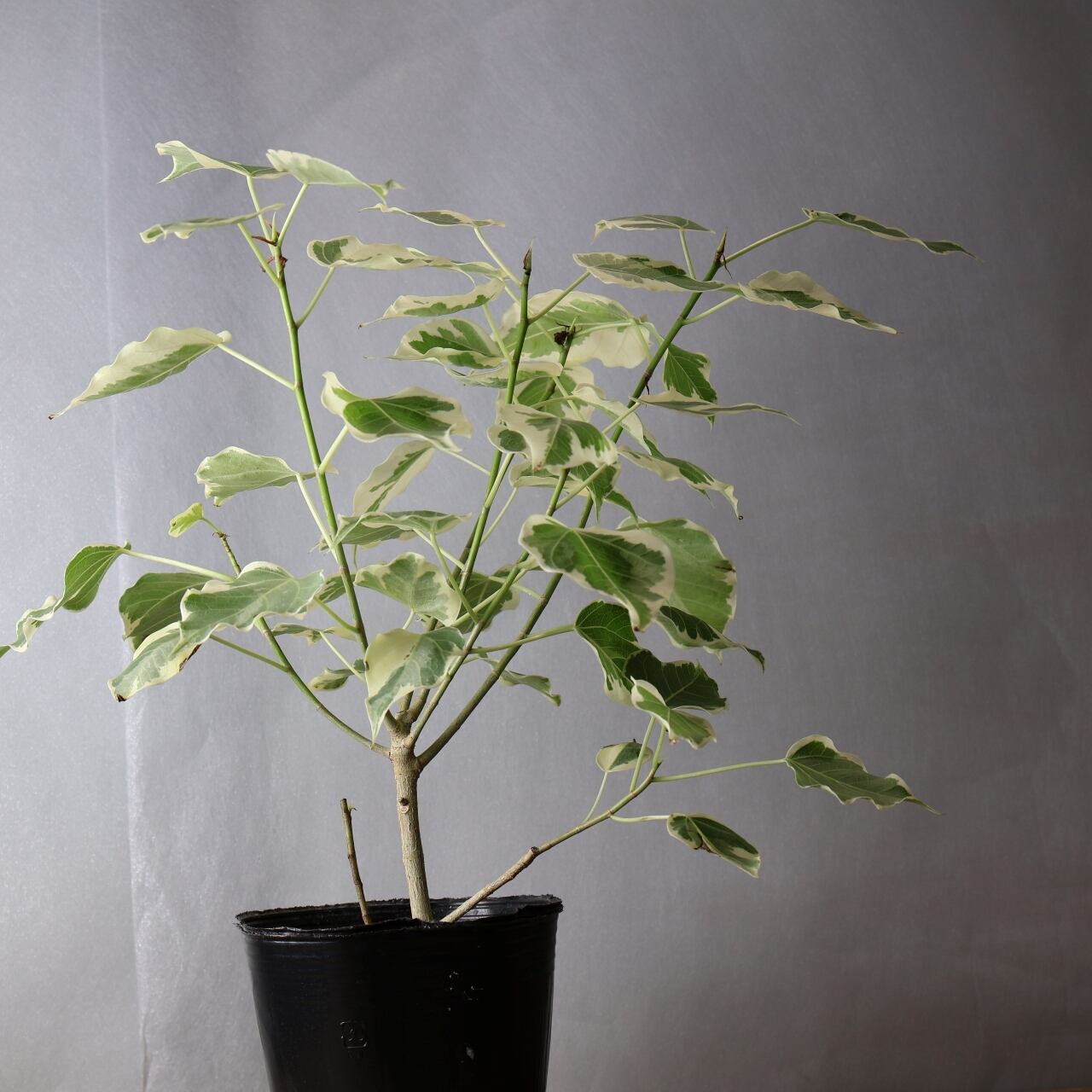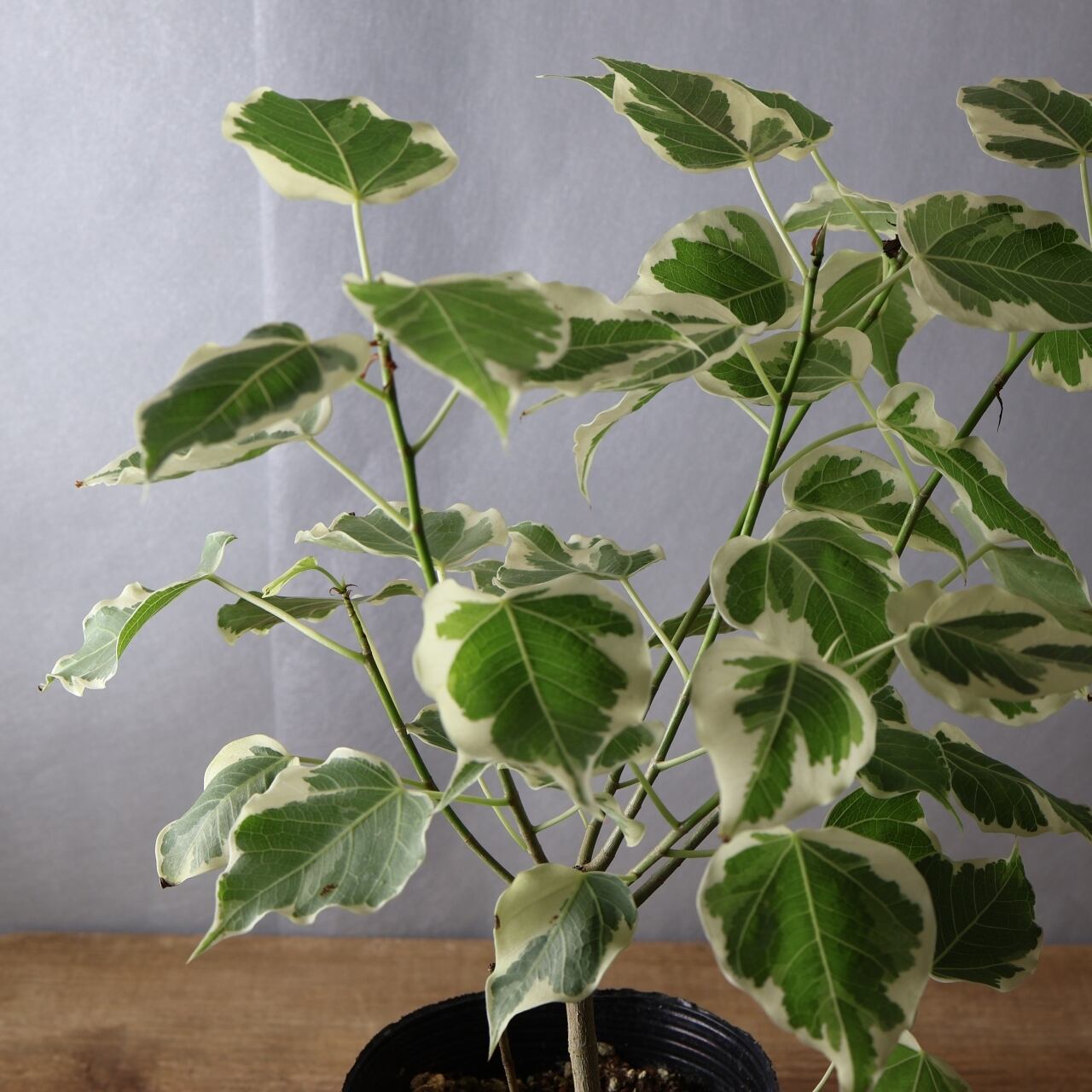 流通量の少ない希少種、ルンフィーの白斑入りです。細く尖ったような葉先はインドボダイジュに似ていますが、インドボダイジュほど長く伸びてはいません。