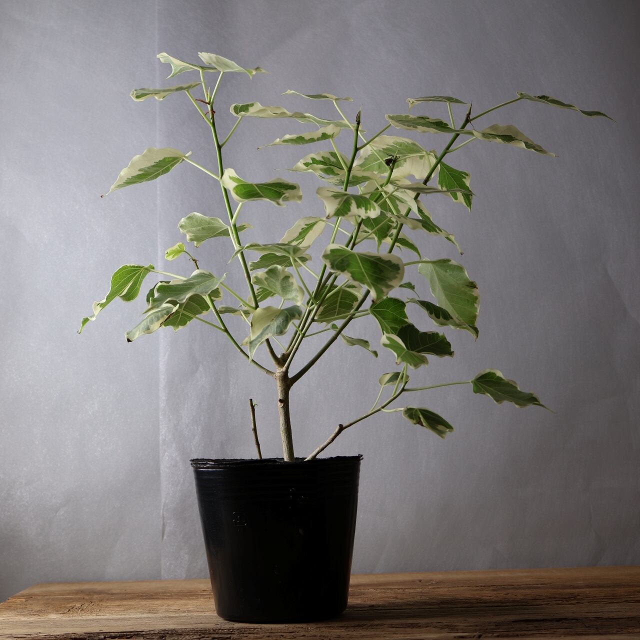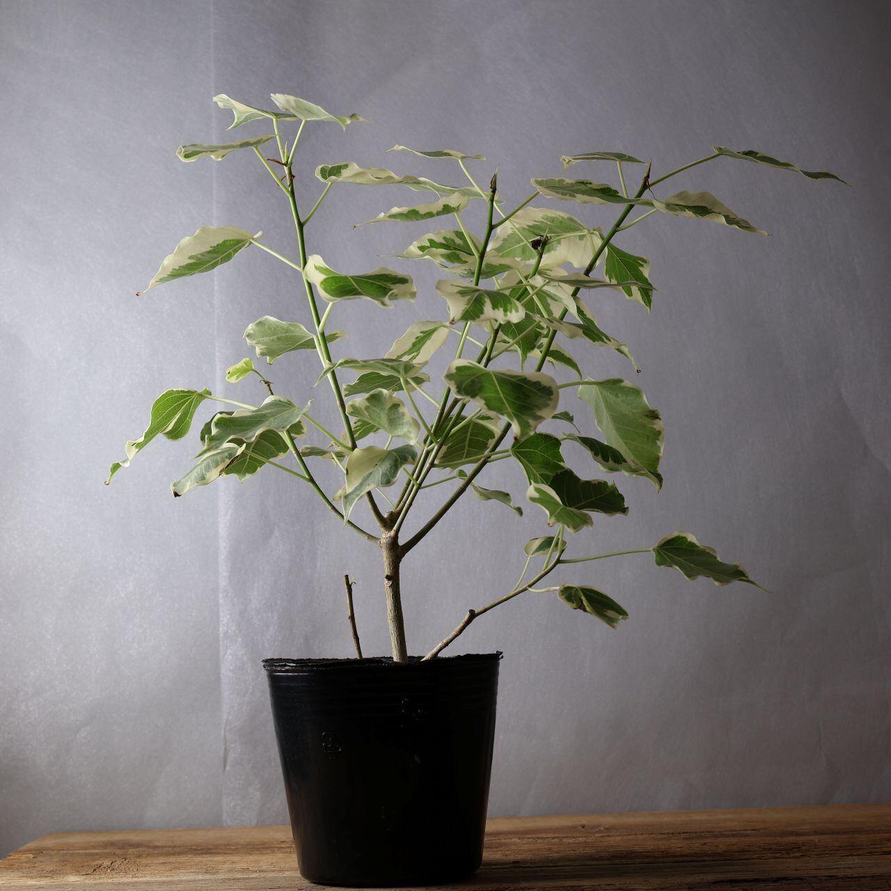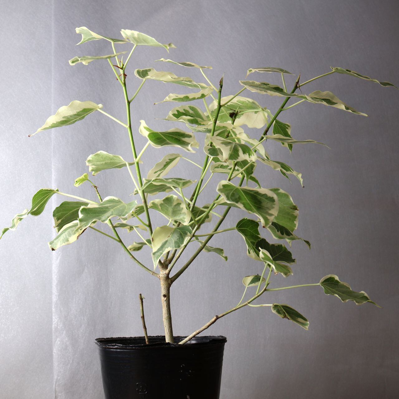 流通量の少ない希少種、ルンフィーの白斑入りです。細く尖ったような葉先はインドボダイジュに似ていますが、インドボダイジュほど長く伸びてはいません。