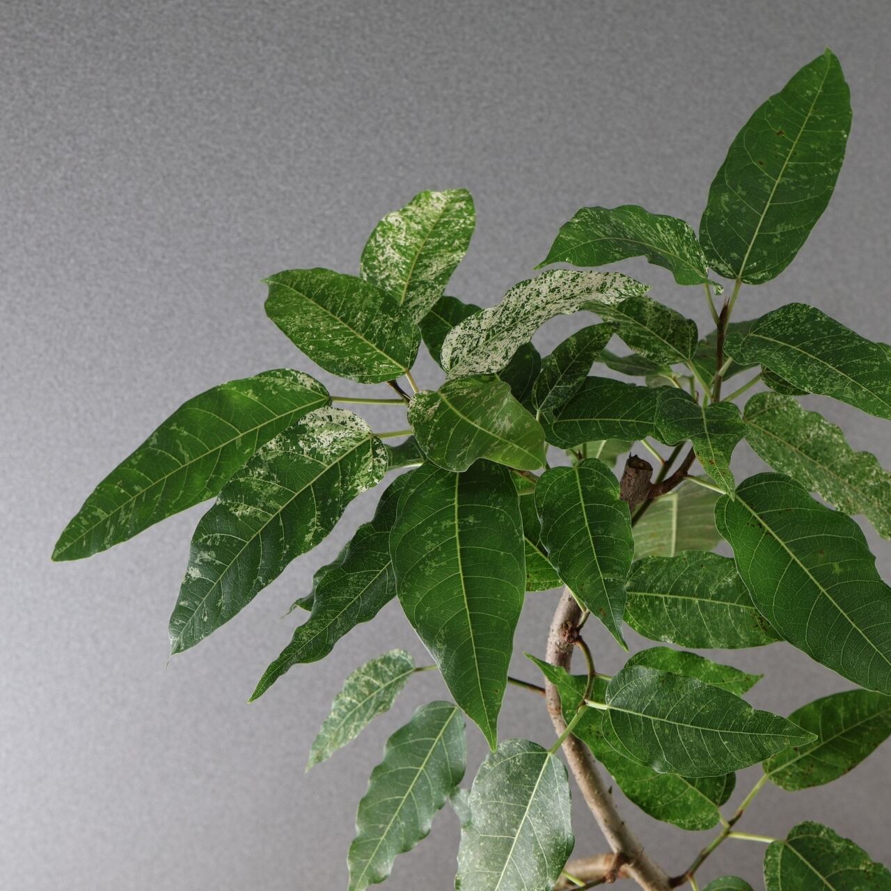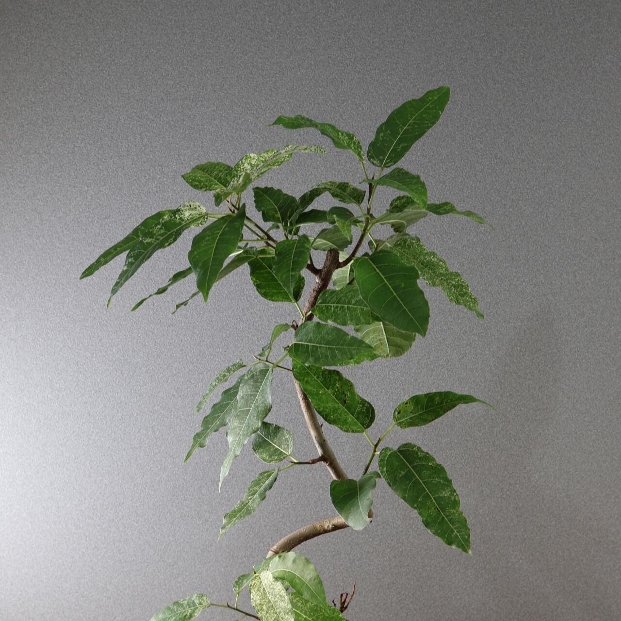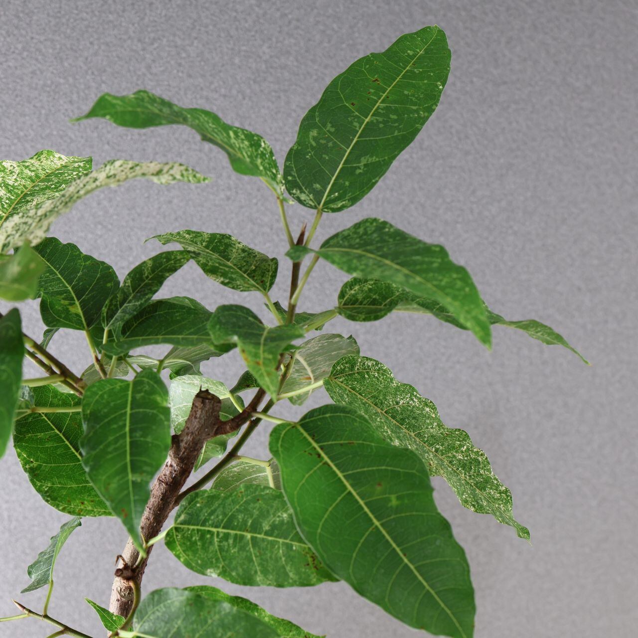 沖縄の日差しの中で育った、素敵な螺旋仕立てのフィカス。流通量の少ない品種で、散斑の葉が爽やかな印象です。比較的水が好きな品種です。