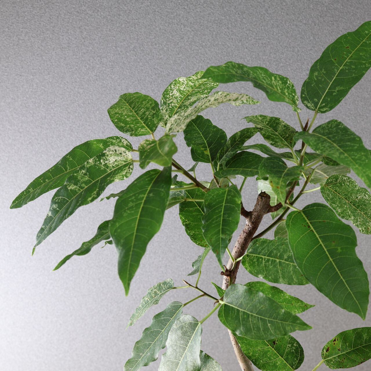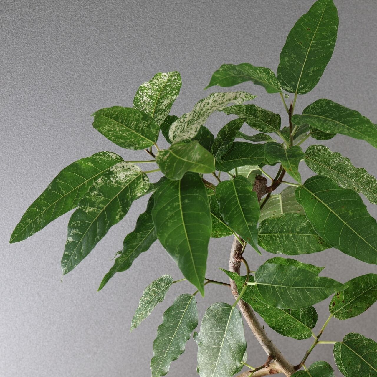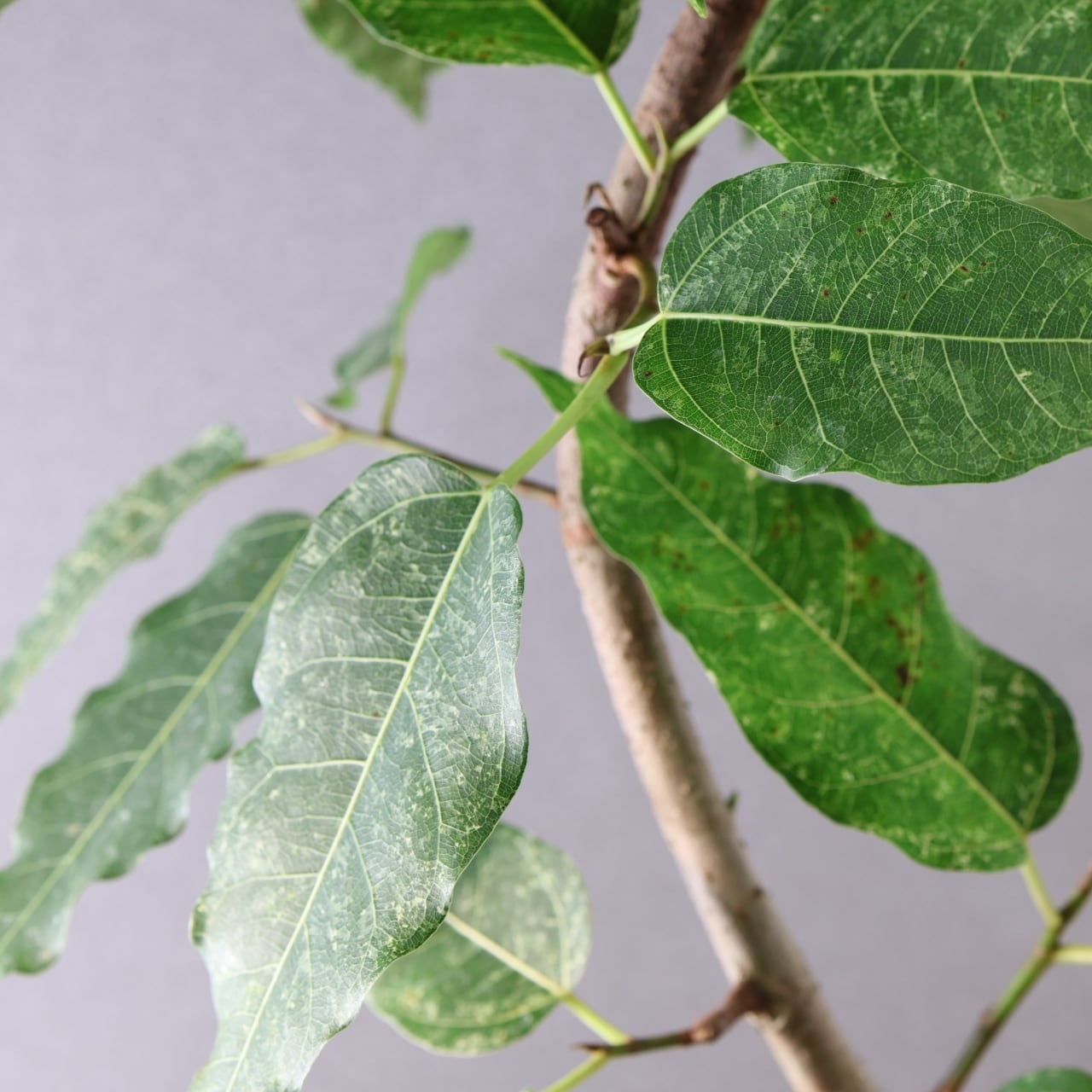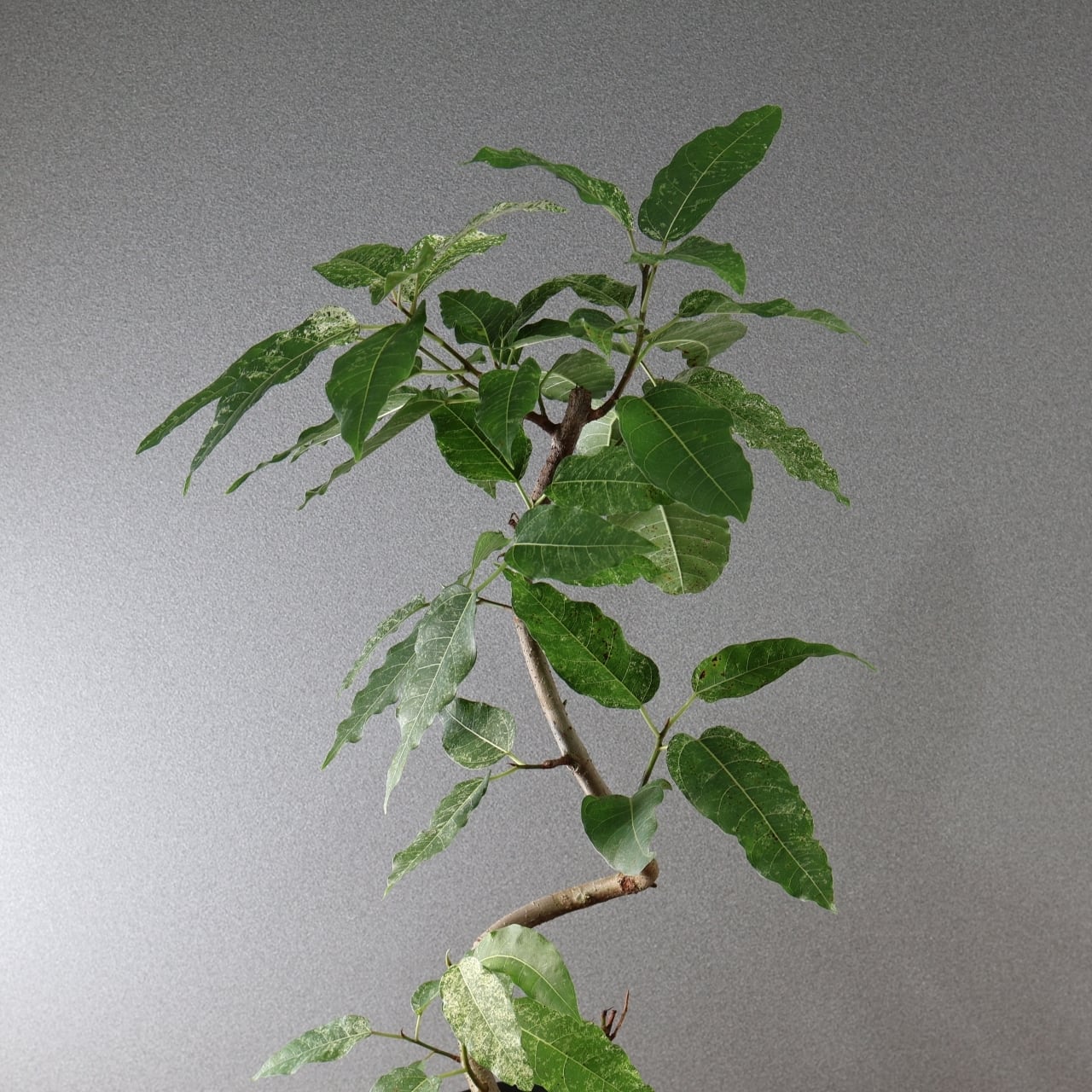 沖縄の日差しの中で育った、素敵な螺旋仕立てのフィカス。流通量の少ない品種で、散斑の葉が爽やかな印象です。比較的水が好きな品種です。