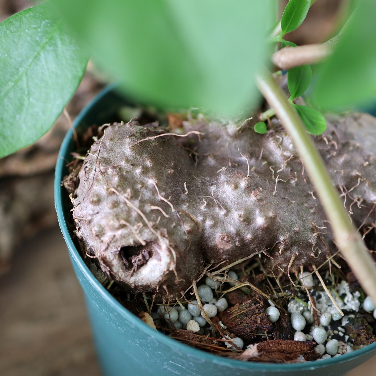 最大の特徴は、株元に形成されるごつごつとした塊茎(ドーム状の基部)。