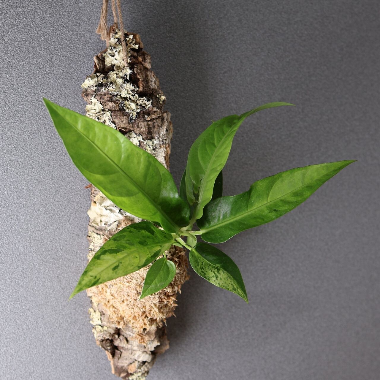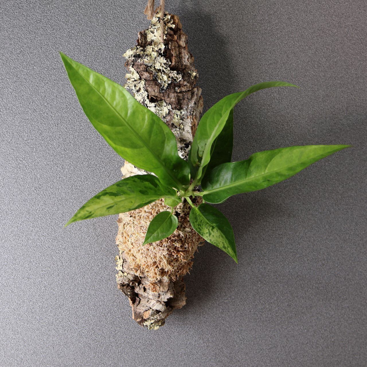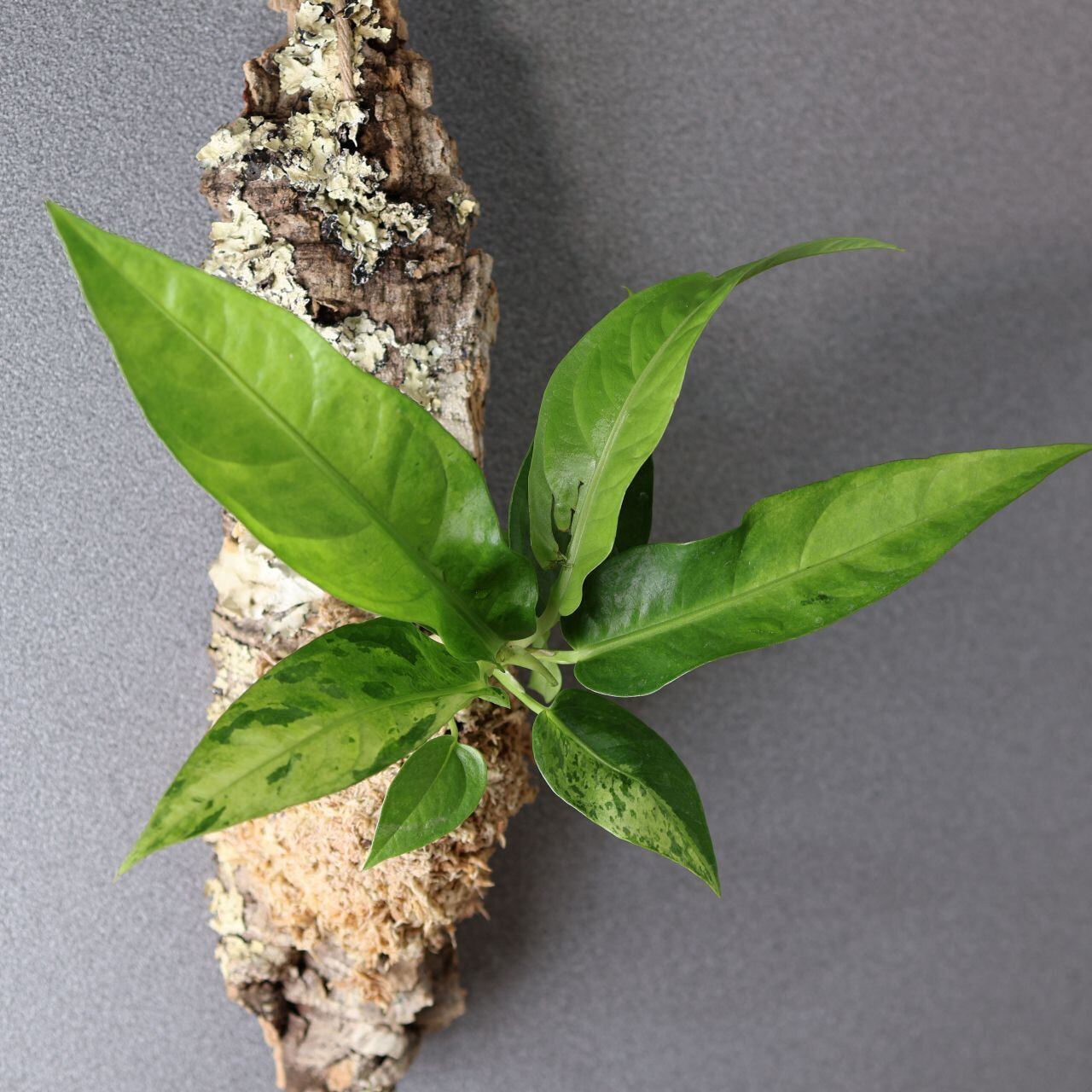 その斑入りタイプは、濃緑の葉に白やクリーム色の斑が散りばめられる希少なコレクターズプランツです。
