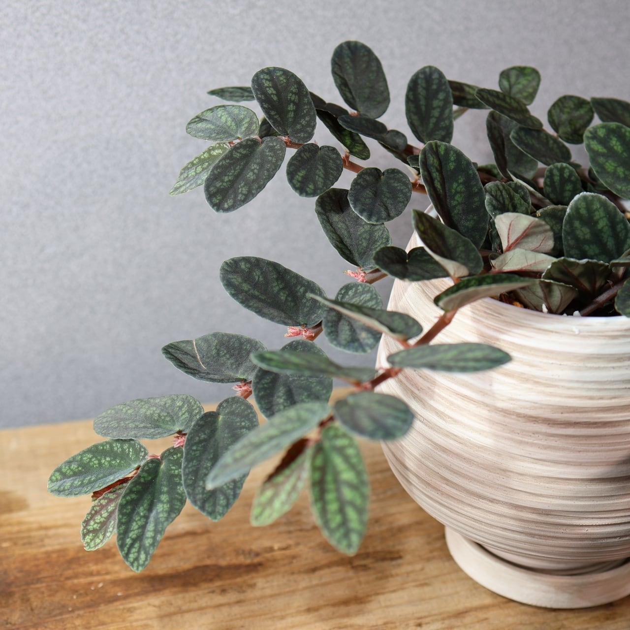 新芽は赤みを帯びることもあり、生長とともに移り変わる色合いも楽しめるのが魅力です。ツルを伸ばしながら成長するため、ハンギングで垂らすように飾ったり、テラリウムのグラウンドカバーとして用いたりと、多彩なアレンジが可能です。
