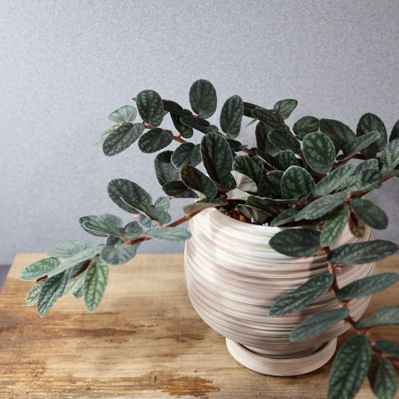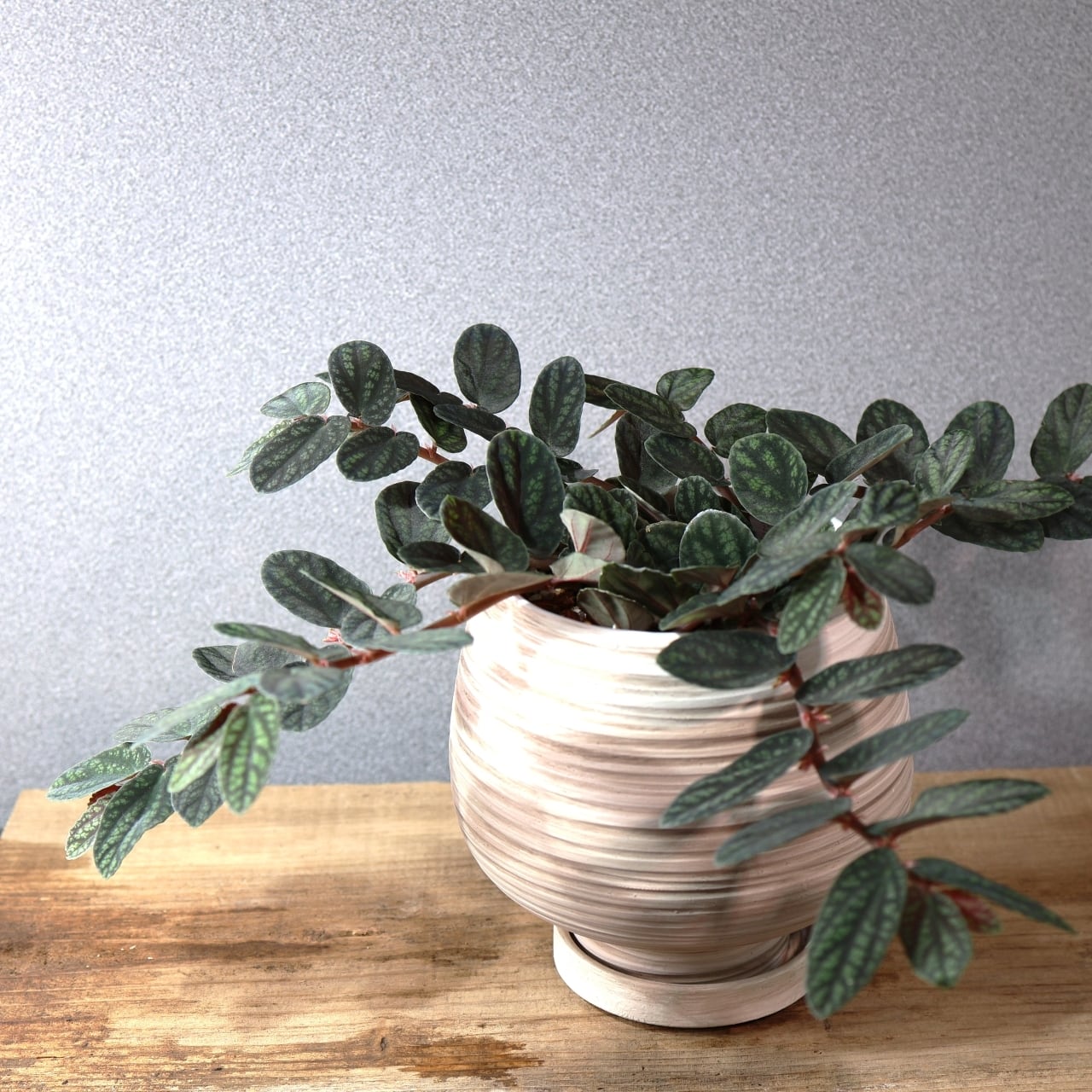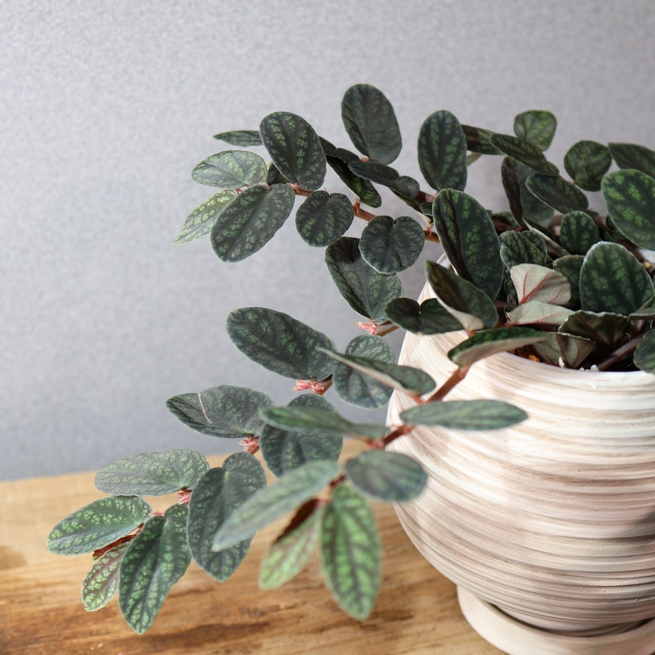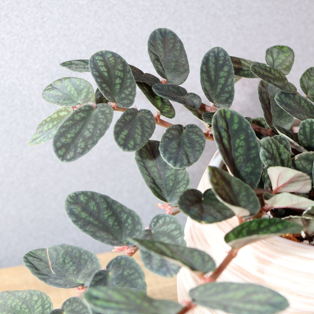 ペリオニア・プルクラは、東南アジアを原産とするツル性の観葉植物で、葉に入る独特の模様が非常に美しい品種です。