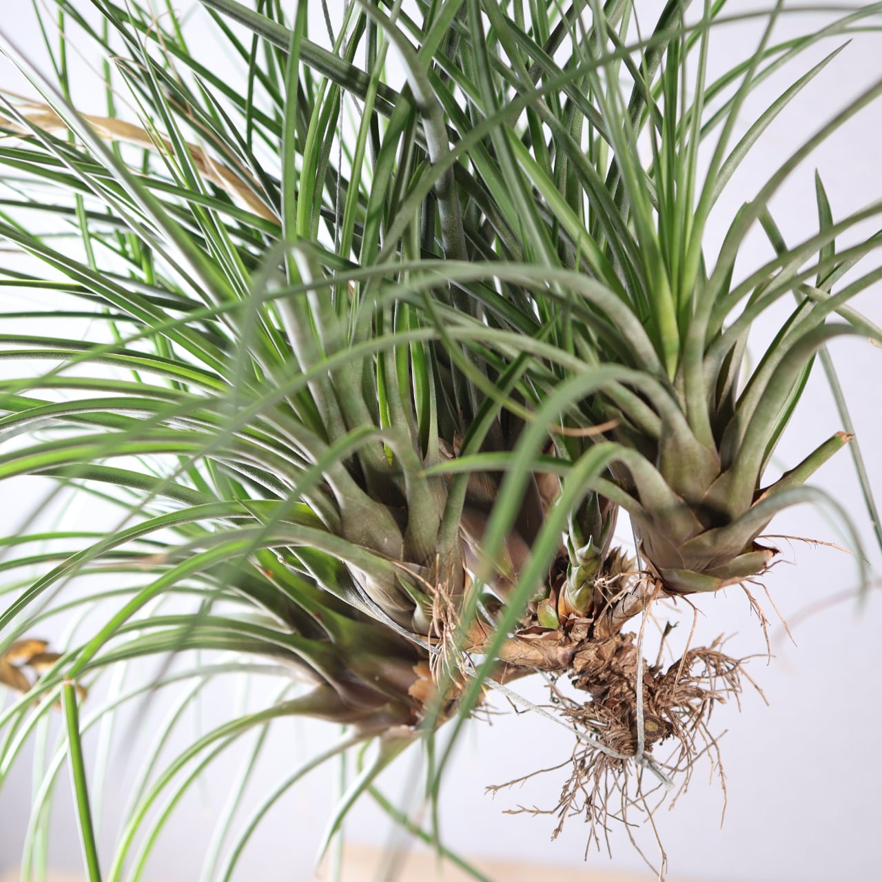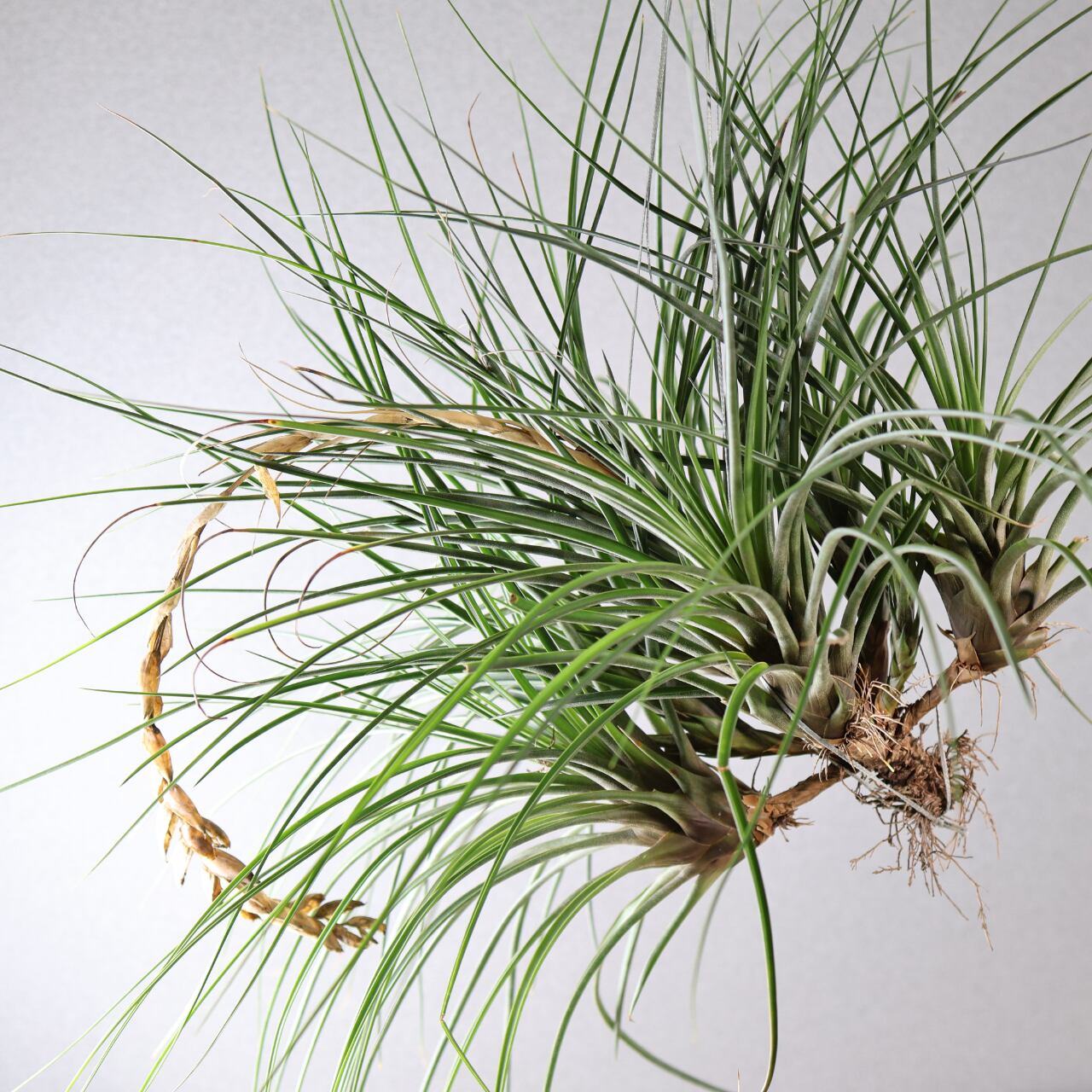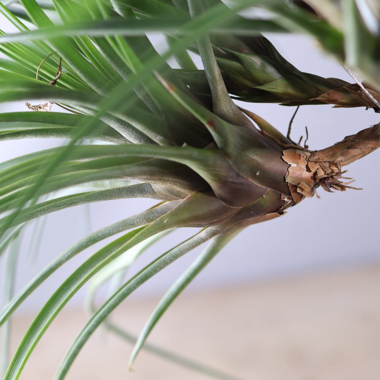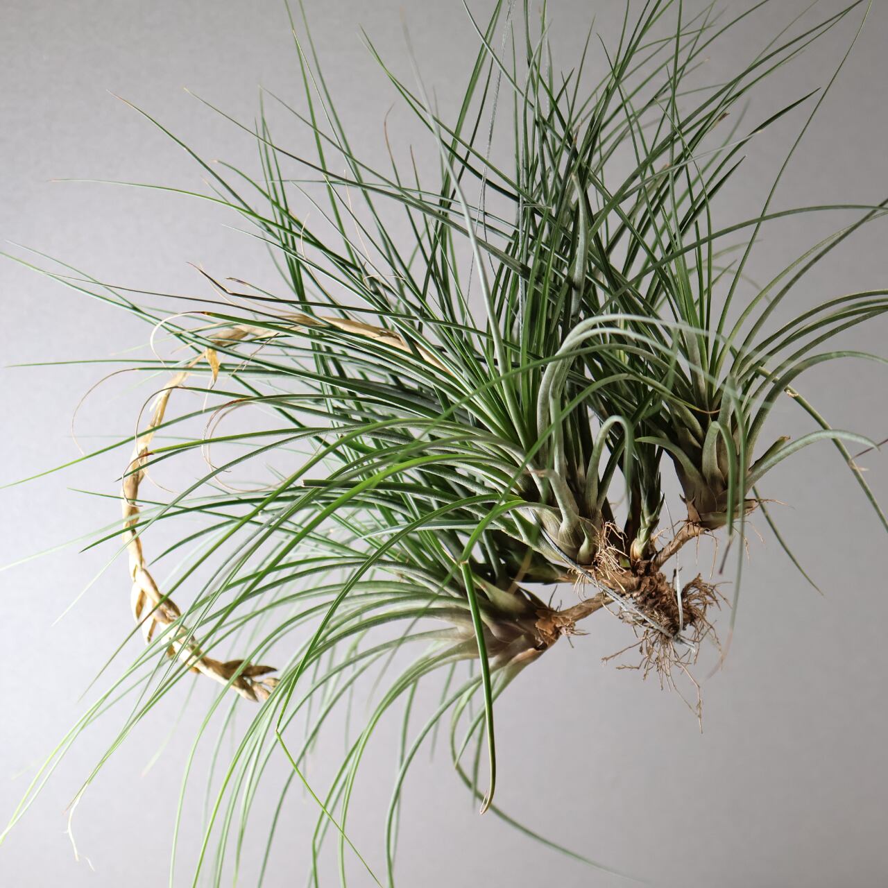 開花時には中央から力強く花序を伸ばし、赤やオレンジに色づく苞と紫色の花をつけ、その姿はとても華やか。南米や中米の乾燥地帯から亜熱帯に広く分布し、岩や樹木に着生してたくましく生きる姿から「王者の風格をもつチランジア」とも呼ばれる人気種です。観賞価値が高く、エアプランツのシンボル的存在としてコレクションの中心になることも多いです。