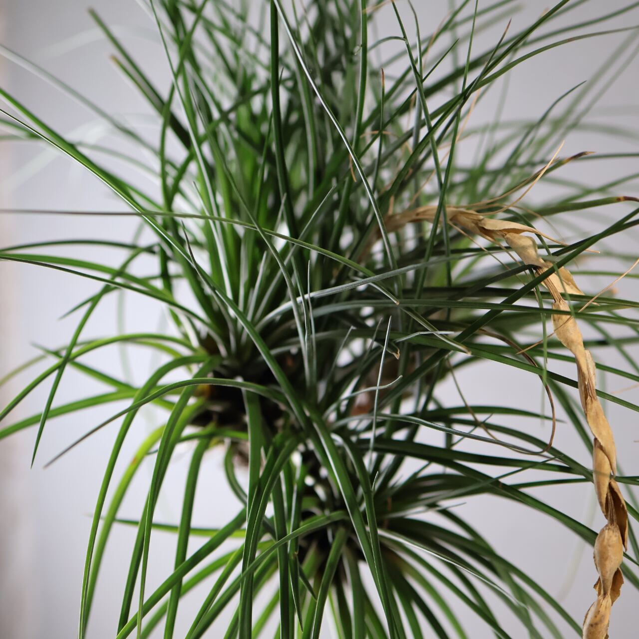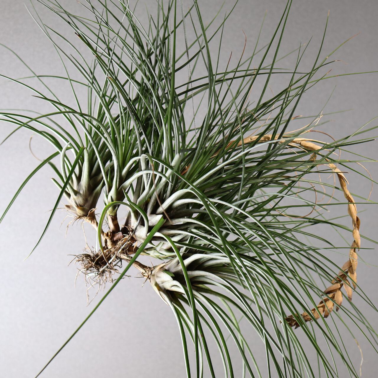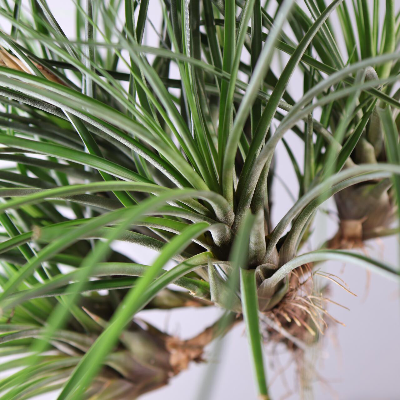 チランジア・ファシキュラータは、エアプランツの中でも存在感抜群の大型種。硬めで幅広の葉をロゼット状に広げ、しっかりとしたボリューム感があります。葉は銀緑色から灰緑色を帯び、光沢があり、乾燥に強い性質をもっています。