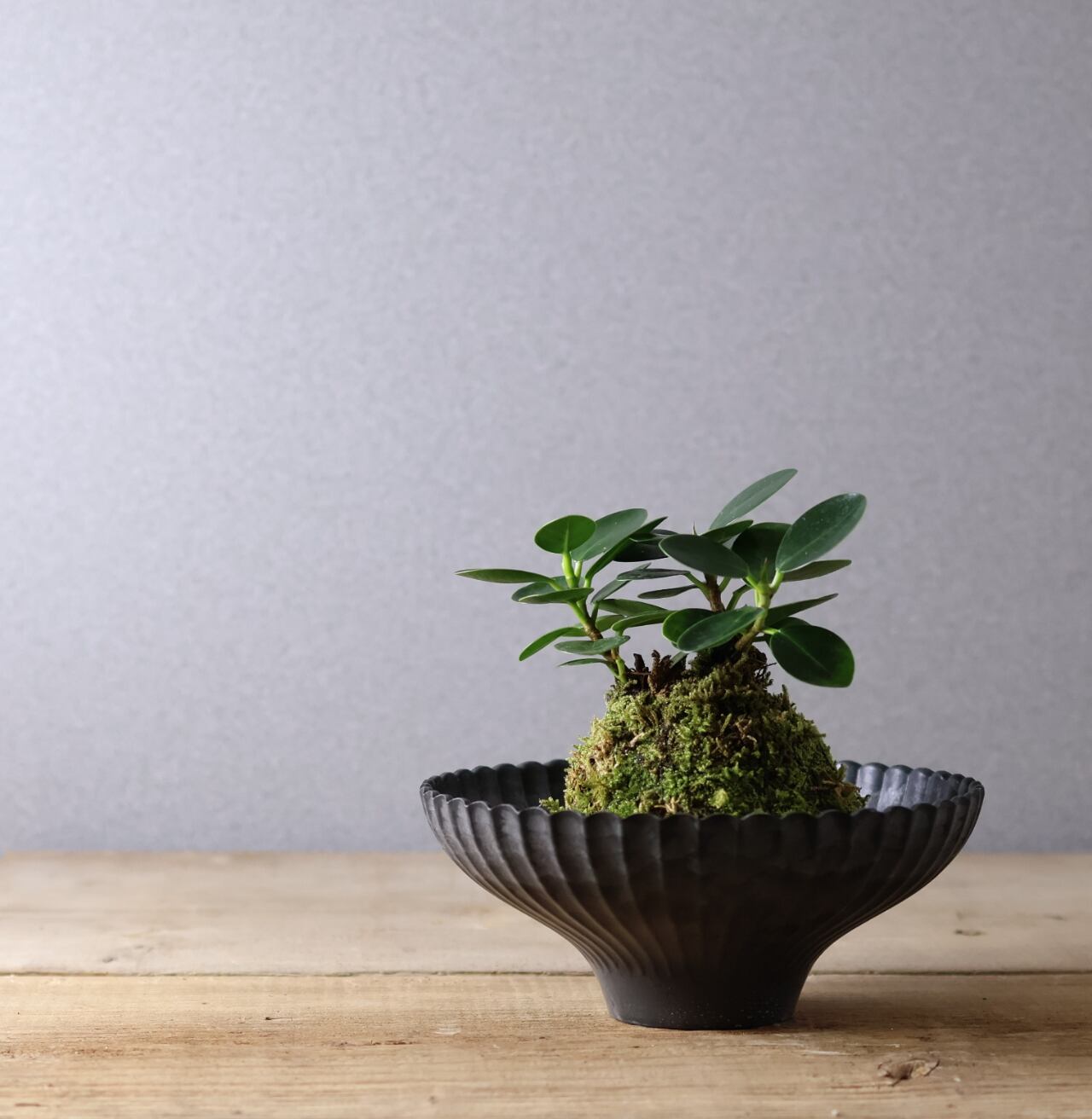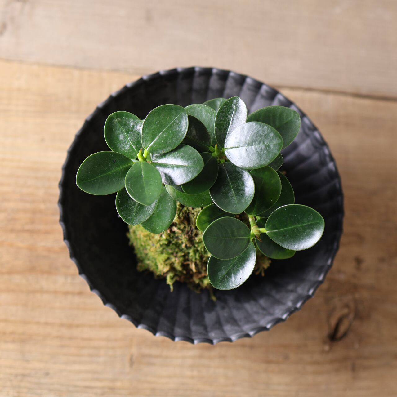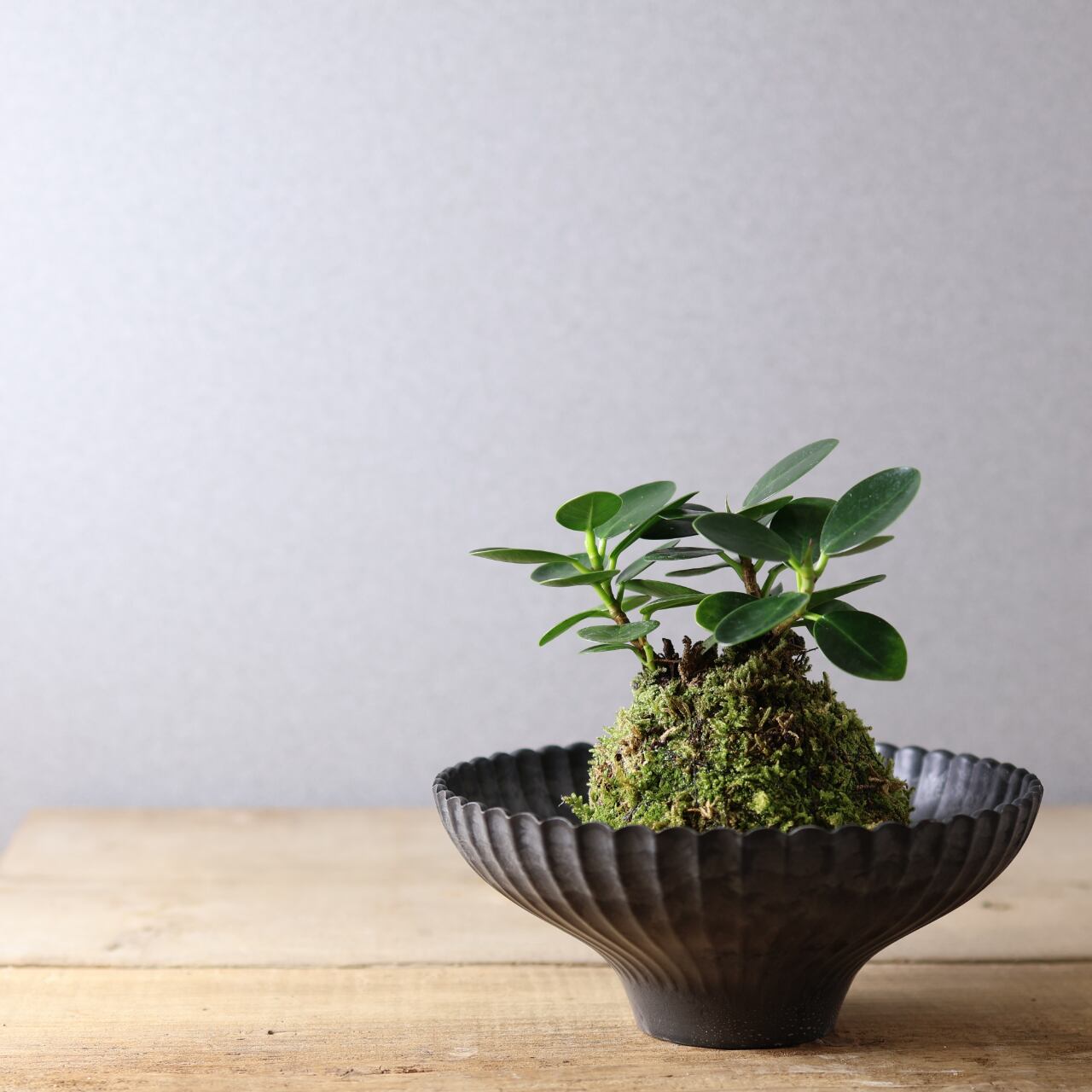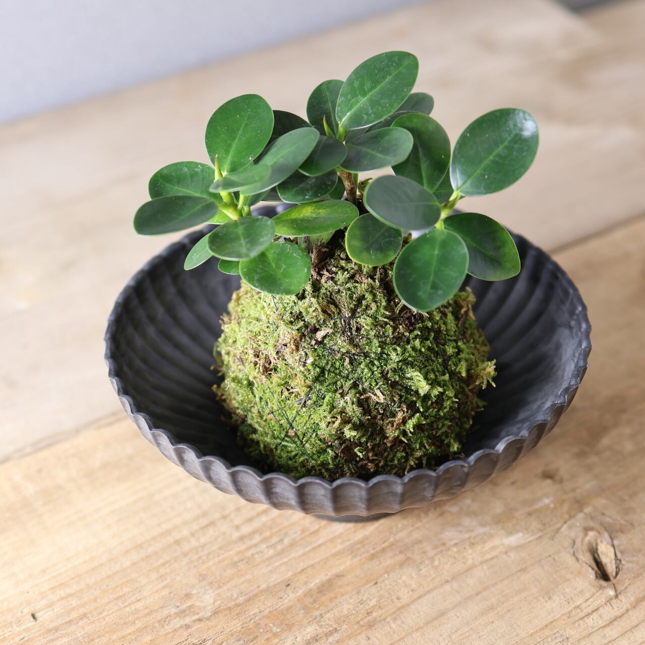 丸みを帯びた葉と、かわいらしい樹形で人気のパンダガジュマルを、苔玉仕立てにしたスタイルです。