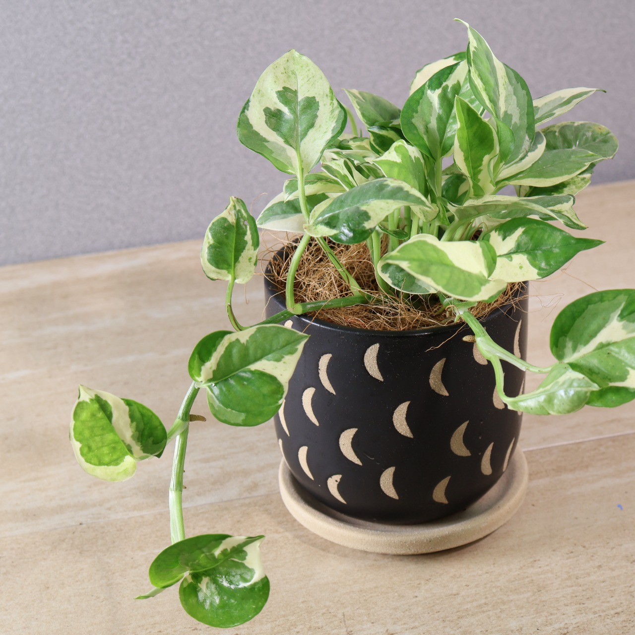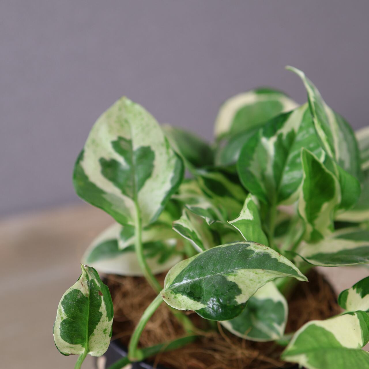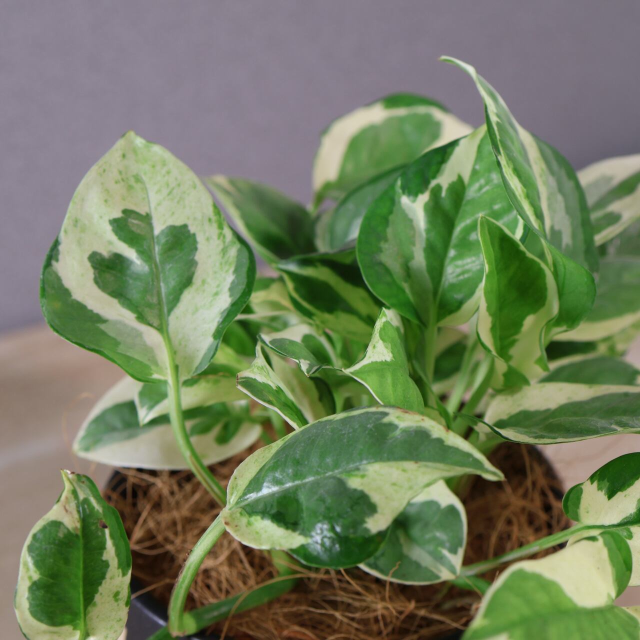 通常のポトスとは異なる、緑と白い斑のコントラストが特徴的で、個性的な葉の模様を持っています。
