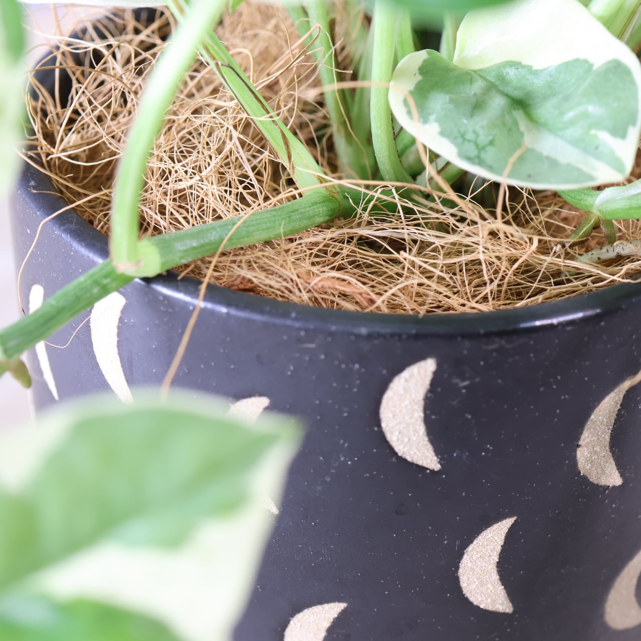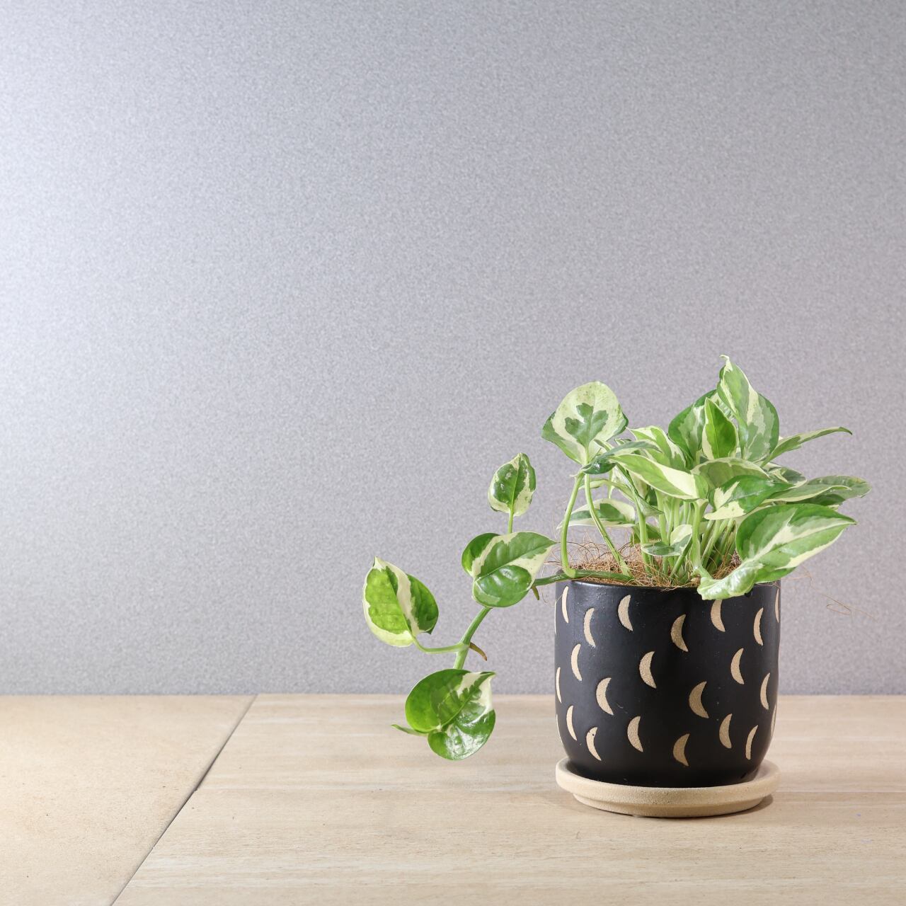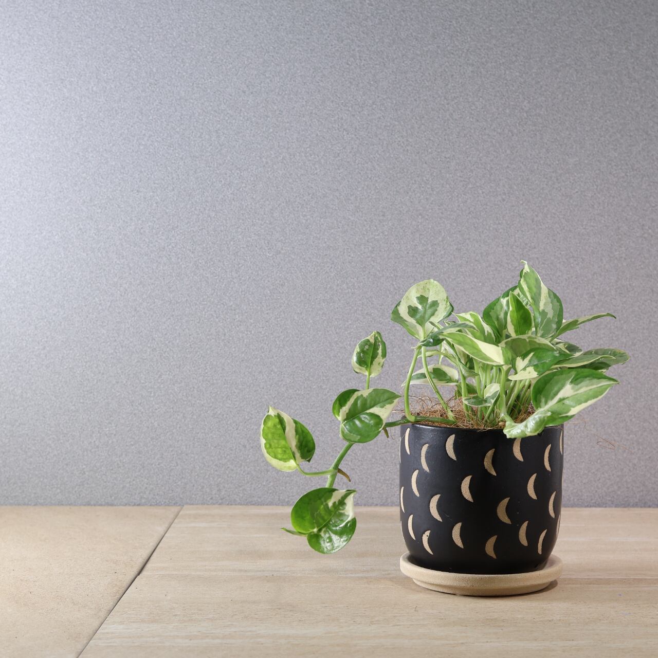 通常のポトスとは異なる、緑と白い斑のコントラストが特徴的で、個性的な葉の模様を持っています。