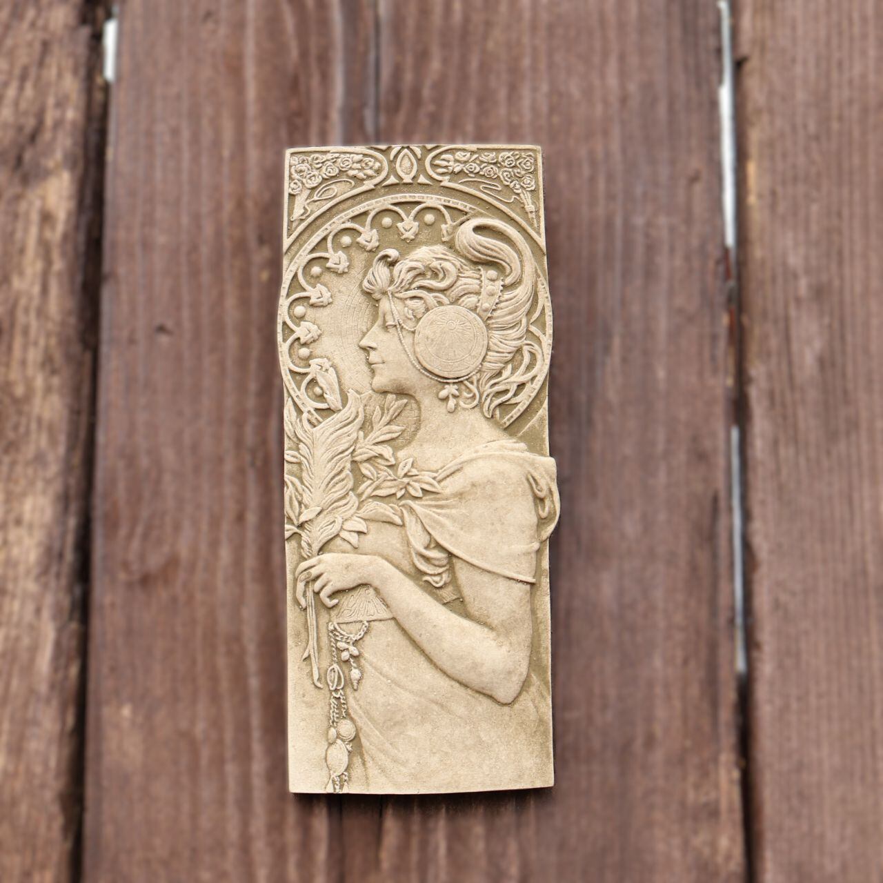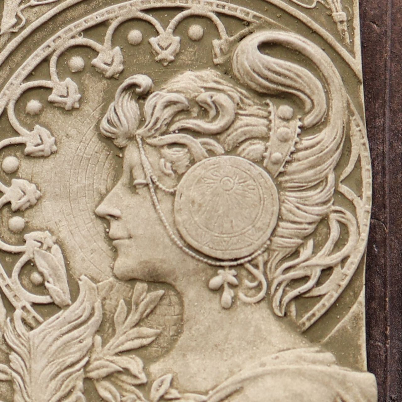 女性の横顔を中心に、優美な植物モチーフや曲線美あふれる装飾が立体的に彫り込まれ、見る角度によって表情を変える芸術的な一品。