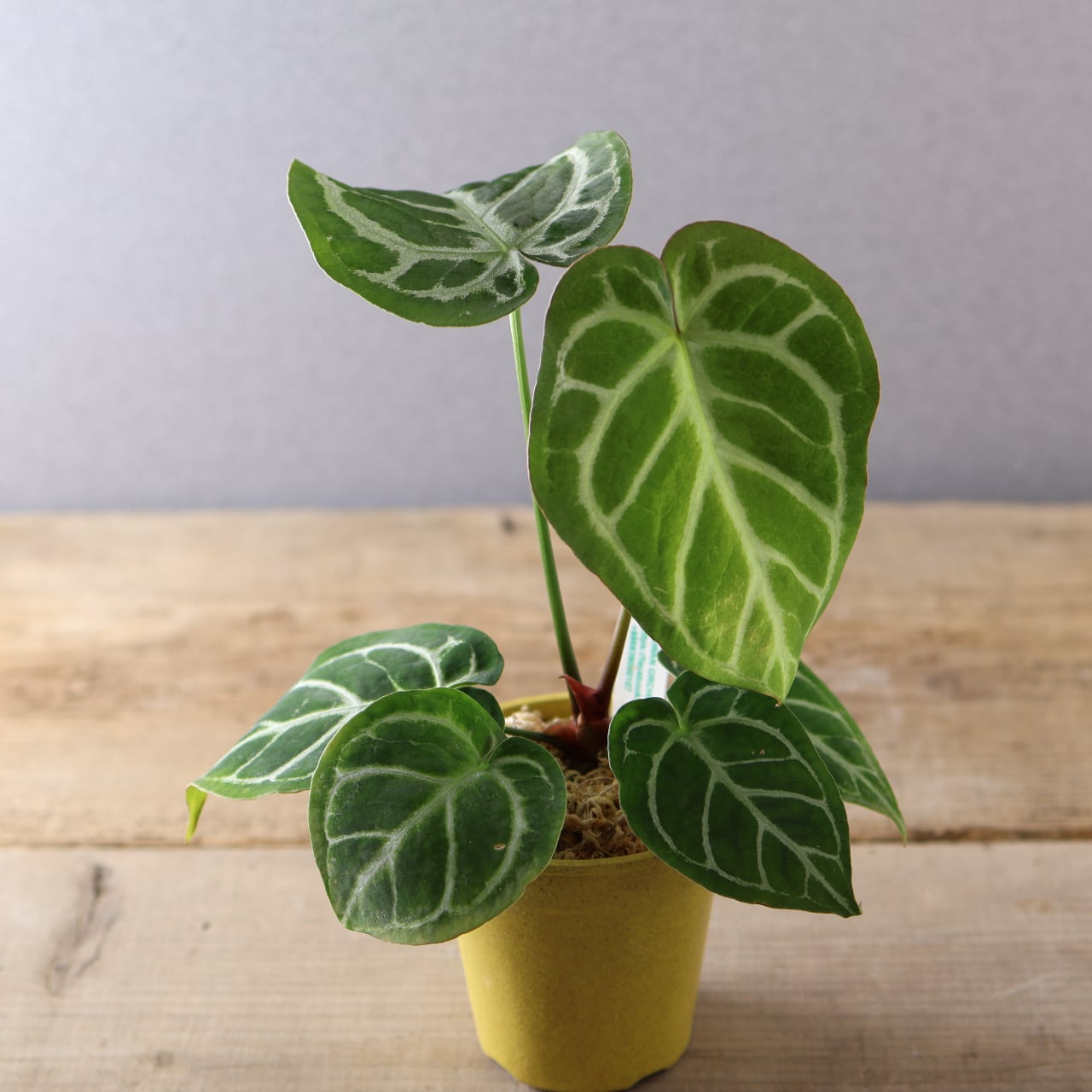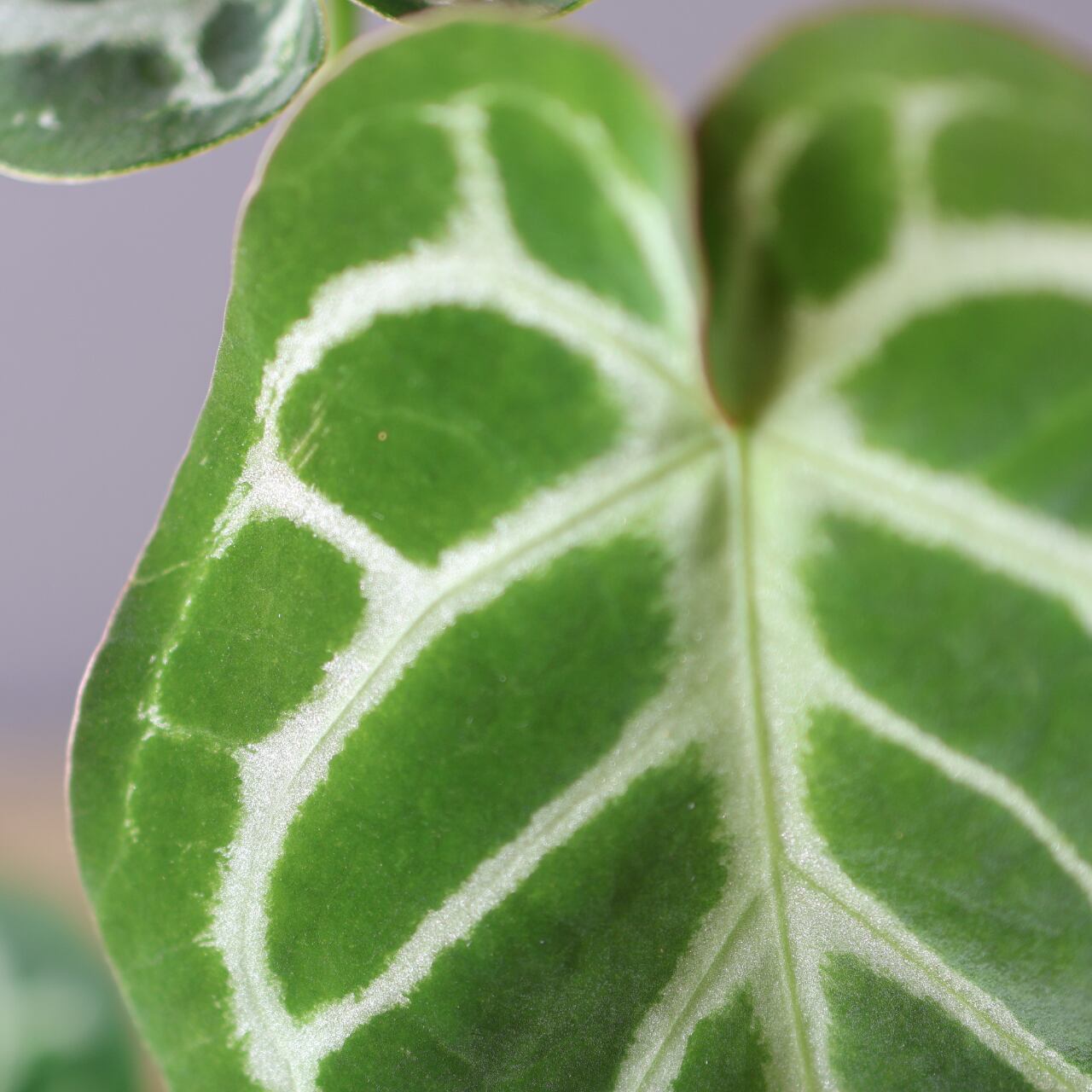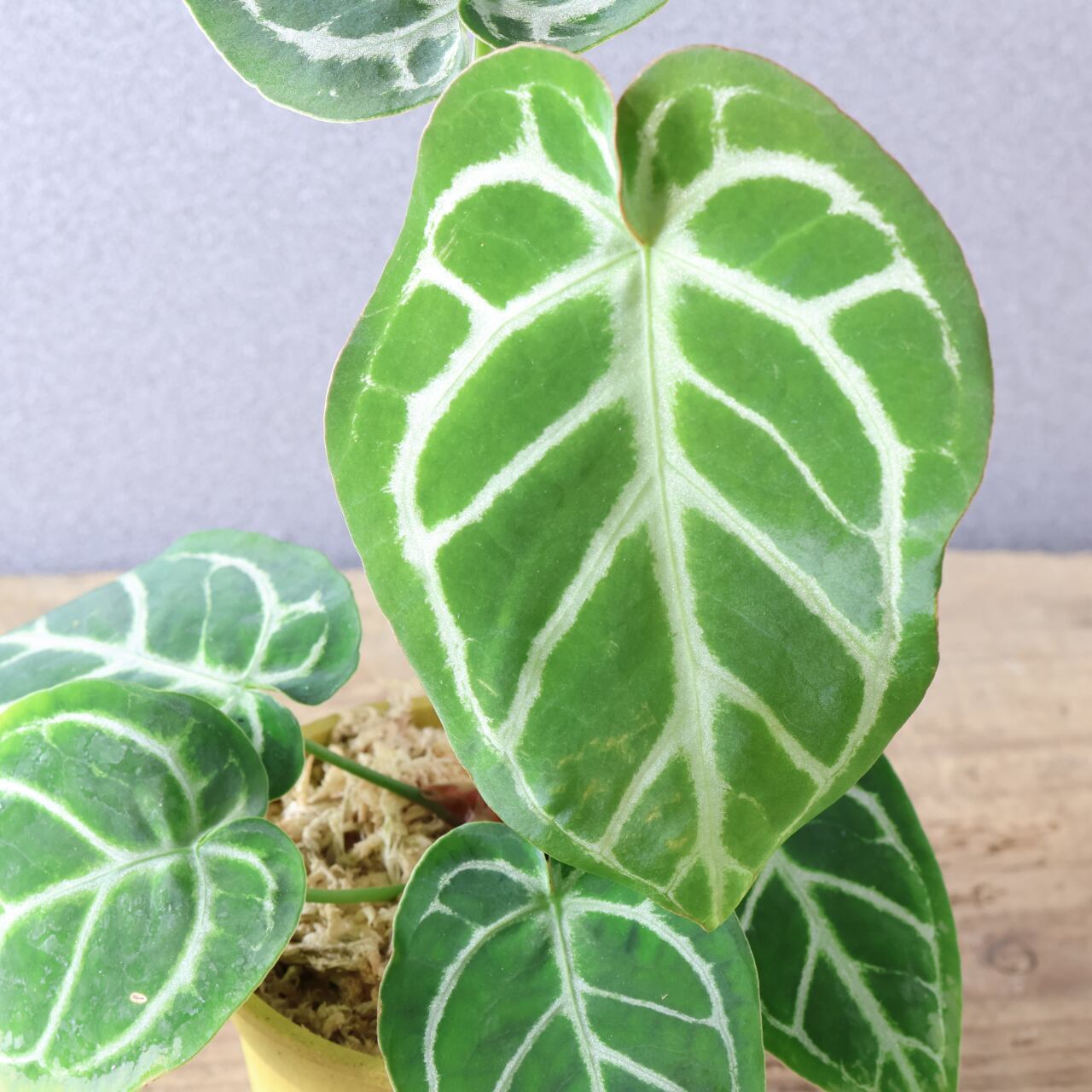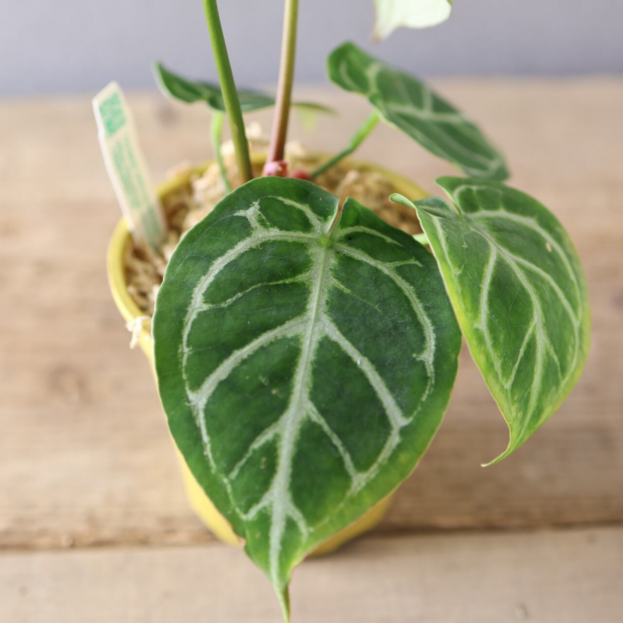 『アンスリウム ドラヤキ』は、ふっくらとした厚みのある丸い葉が特徴の、個性的な原種アンスリウムです。深いグリーンの葉に繊細に広がる葉脈が美しさを演出します。