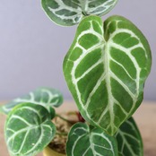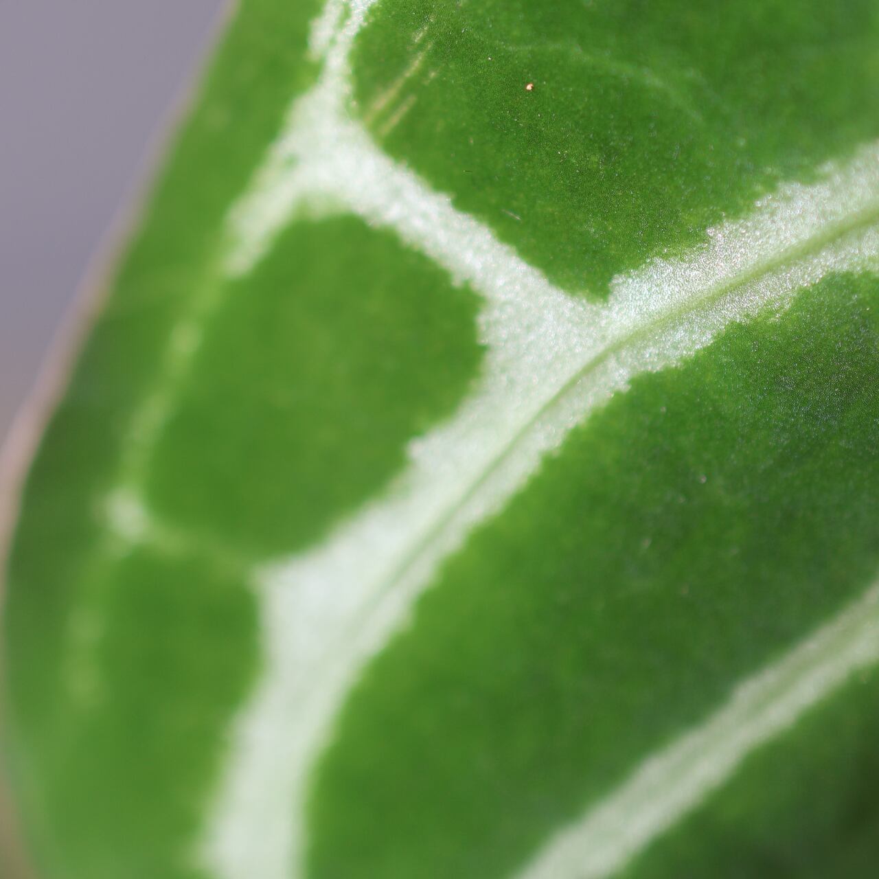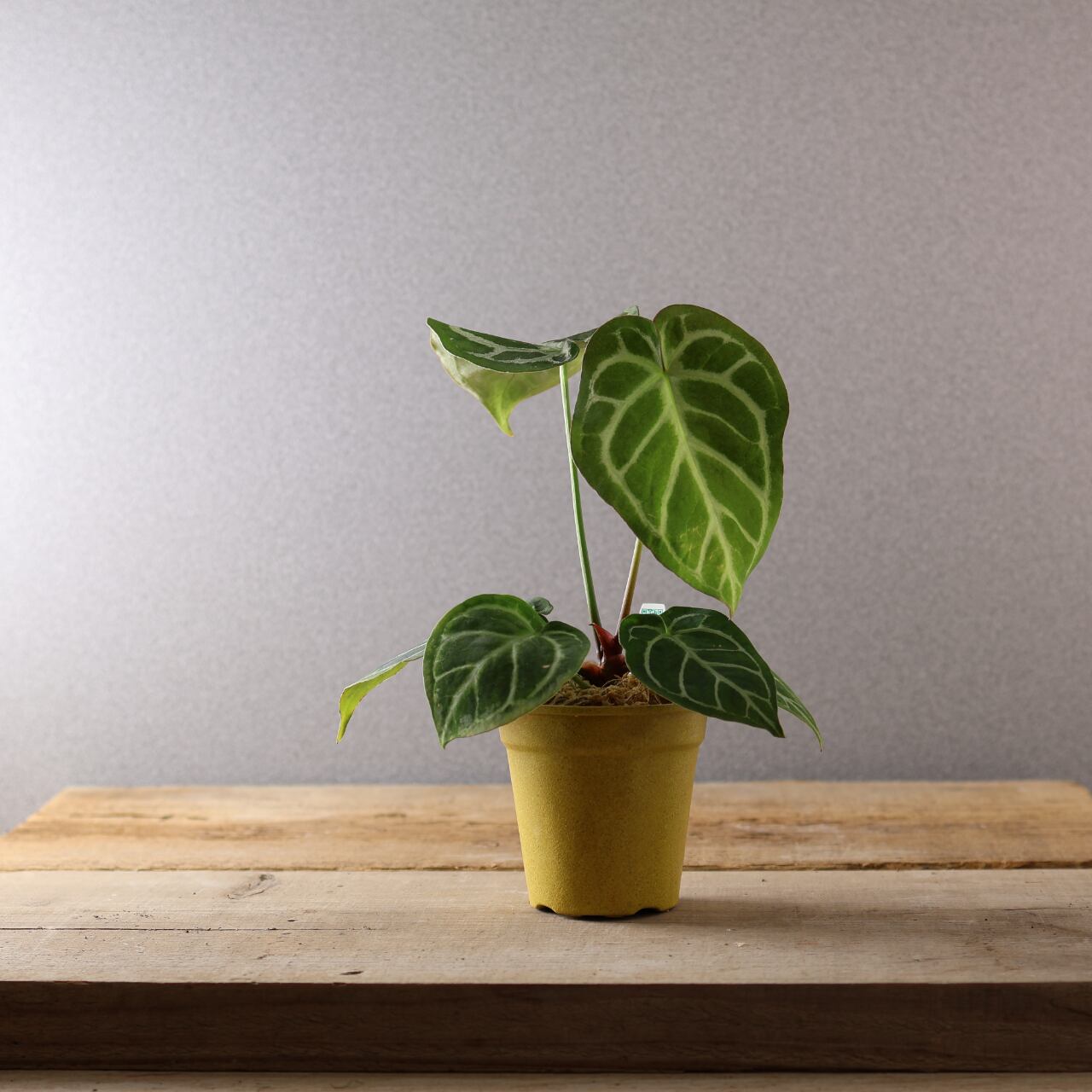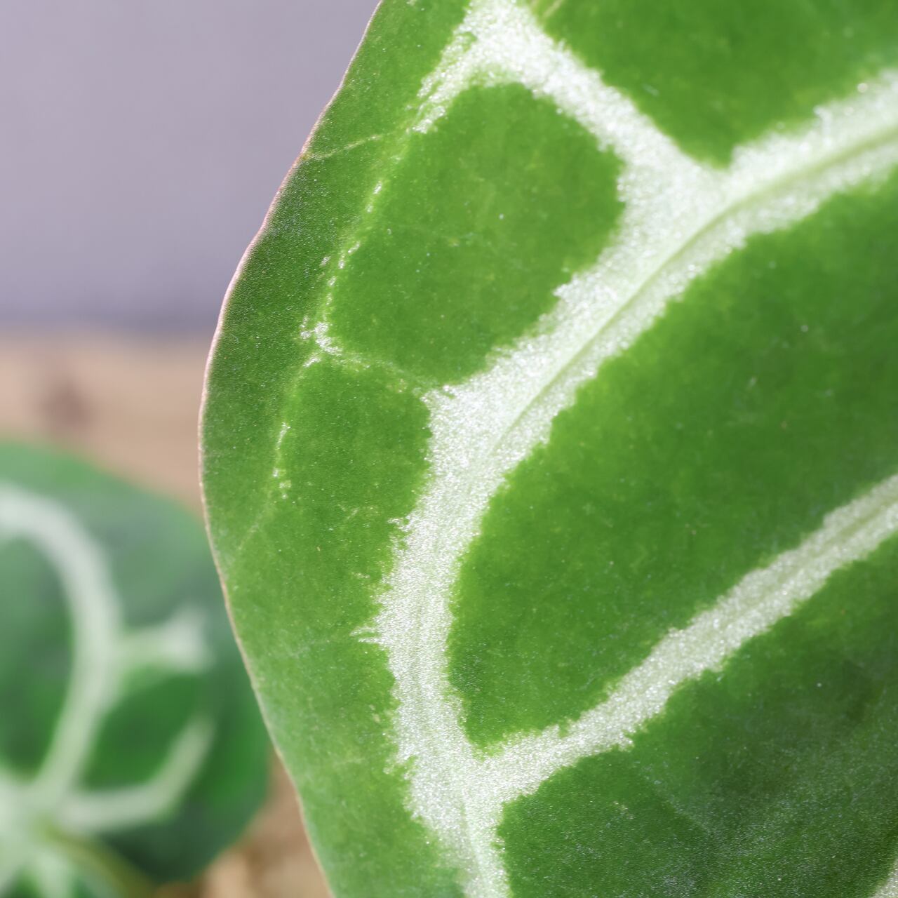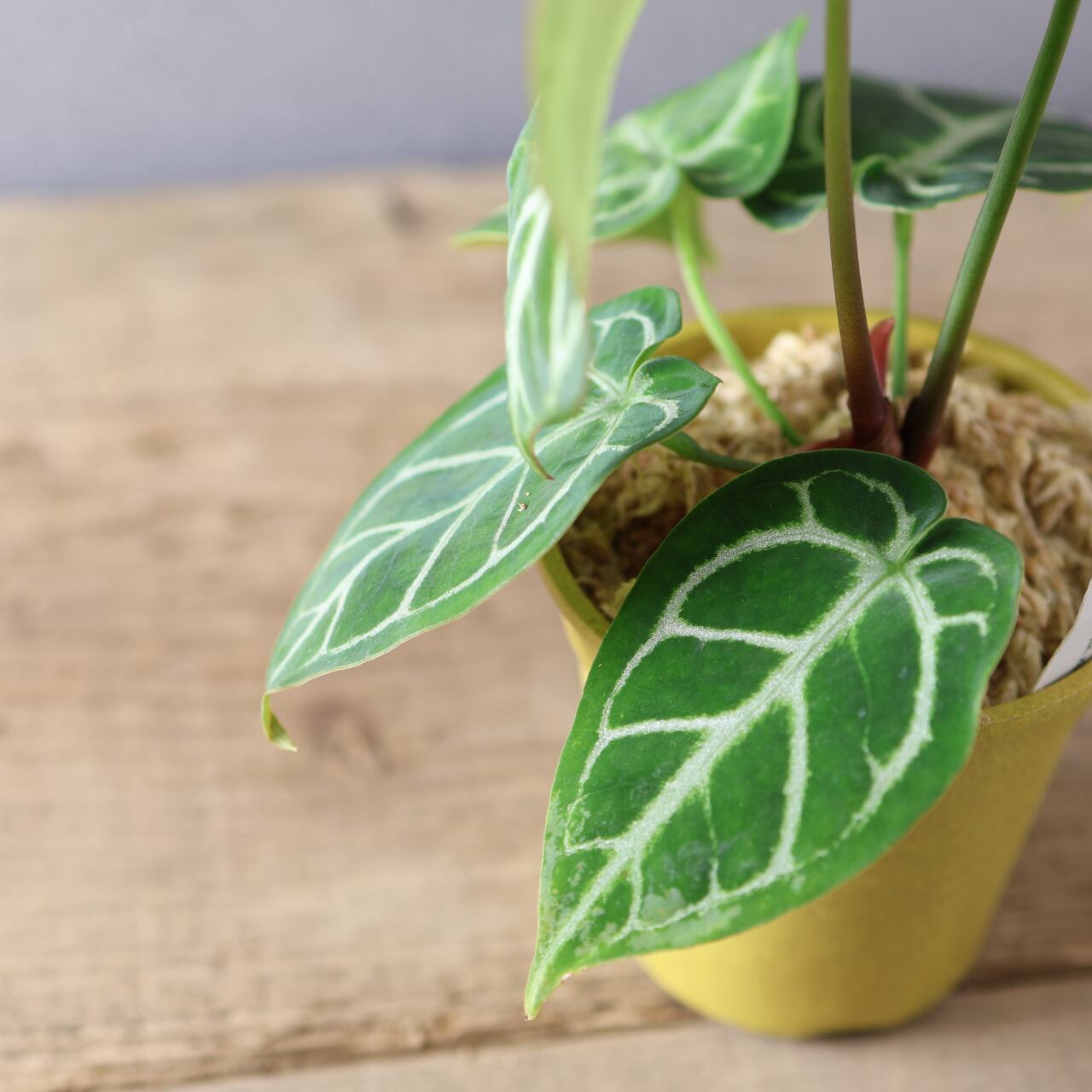 『アンスリウム ドラヤキ』は、ふっくらとした厚みのある丸い葉が特徴の、個性的な原種アンスリウムです。深いグリーンの葉に繊細に広がる葉脈が美しさを演出します。