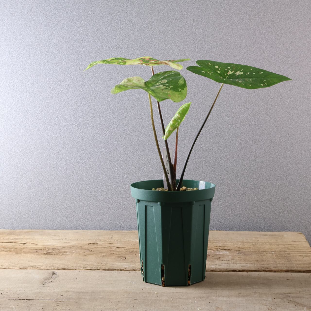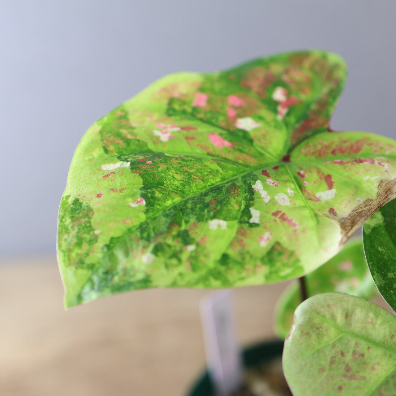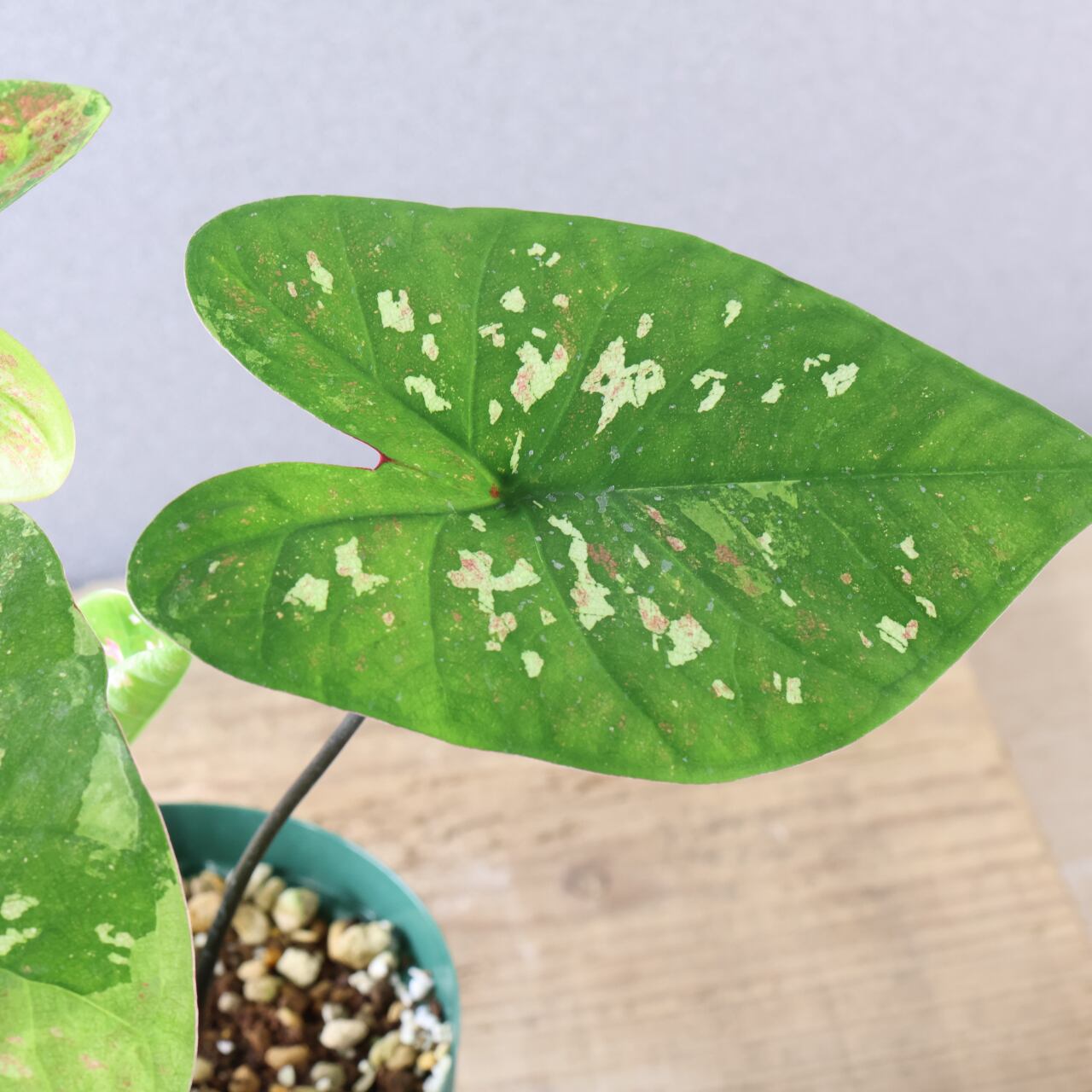 特に「タイハイブリッド」と呼ばれる品種群は、タイで盛んに育種されたもので、鮮やかなピンク、深紅、ライムグリーン、純白など、目を奪うような色彩の葉を展開するのが魅力です。葉脈と葉色のコントラストが強く、まるでアート作品のような姿は、観葉植物のコレクションに華やかなアクセントを加えてくれます。