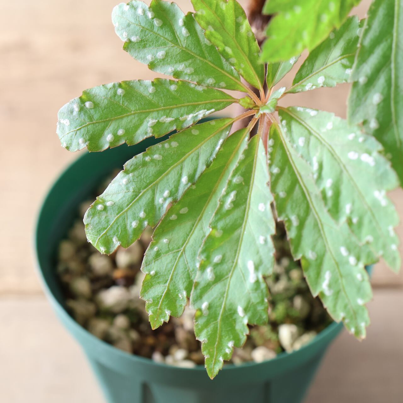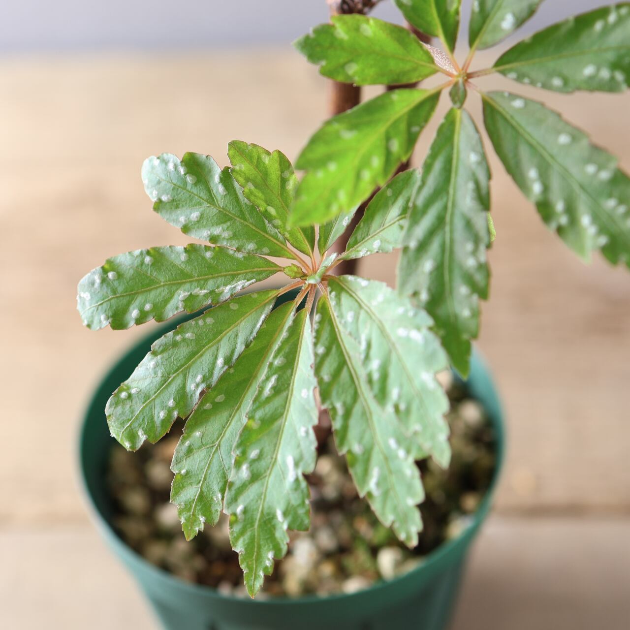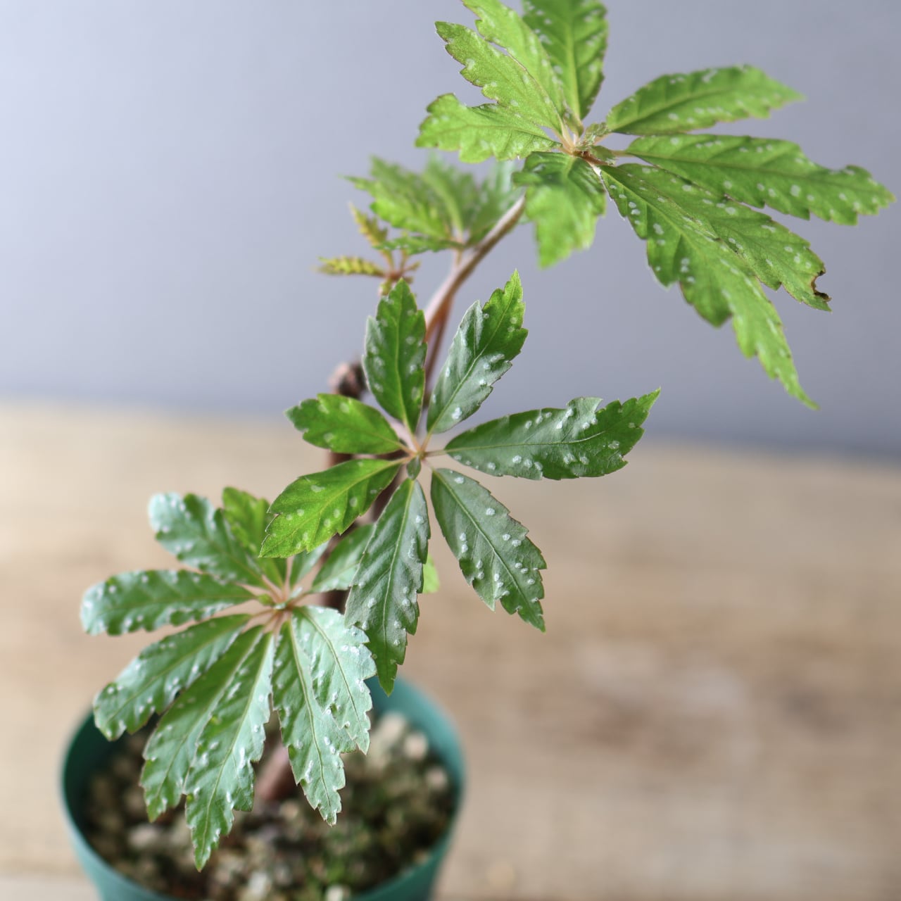 明るい日陰〜半日陰を好み、直射日光は避けた方が葉色を美しく保てます。空中湿度をやや好むため、乾燥する時期は葉水を与えると生き生きと育ちます。