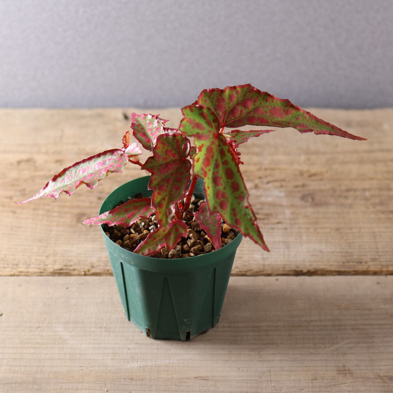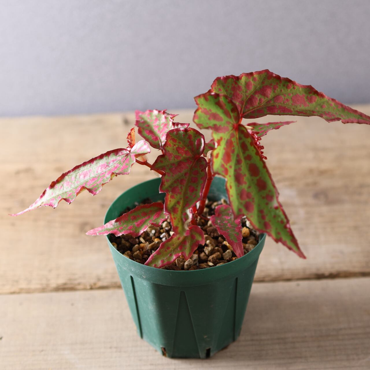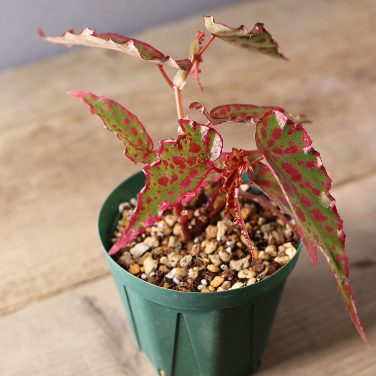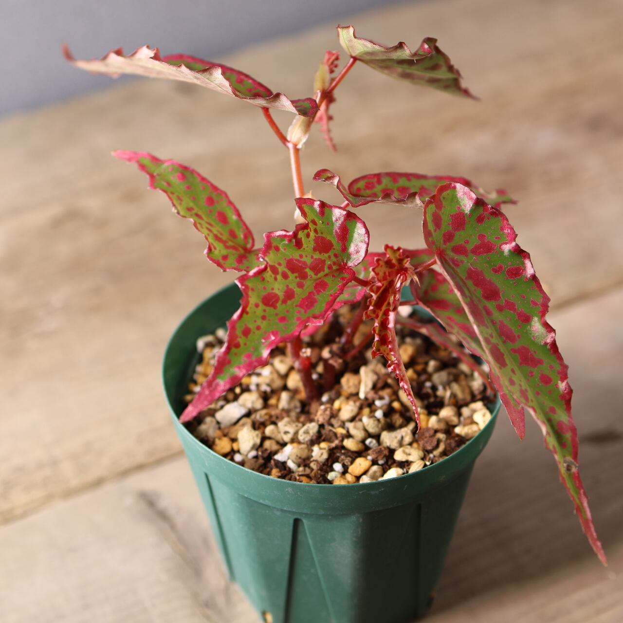 葉は細身ながら個体によって斑点の出方が異なり、赤みの強さやコントラストが楽しめるのも魅力。コレクション性が高く、まさに“一点もの”の存在感を放つベゴニアです。