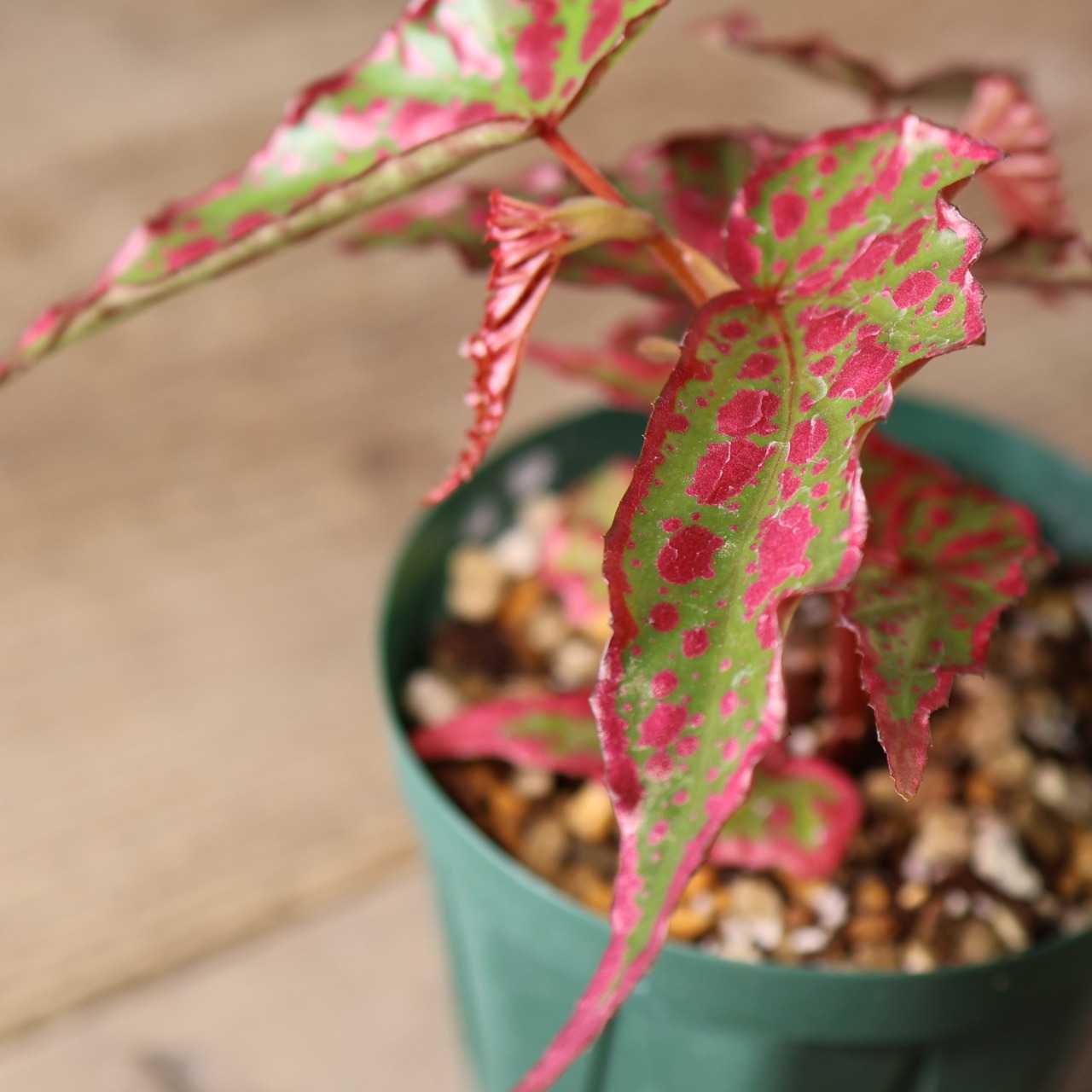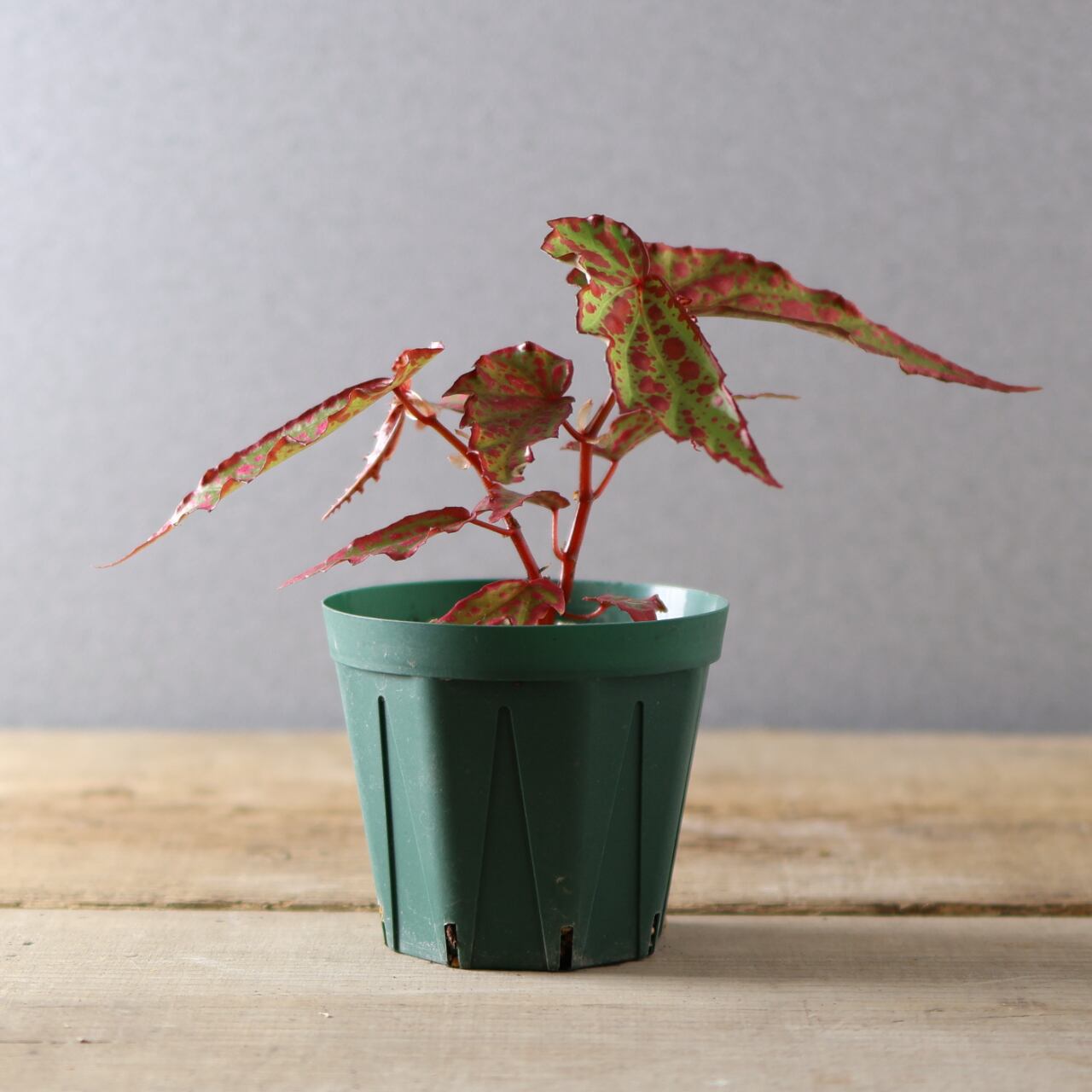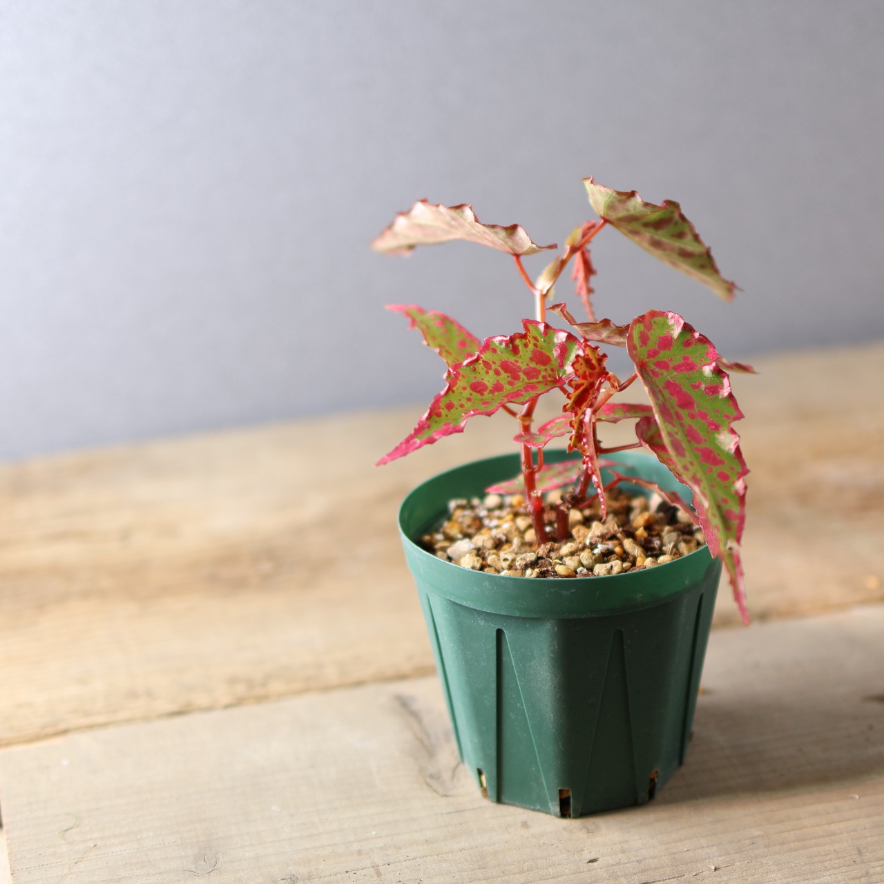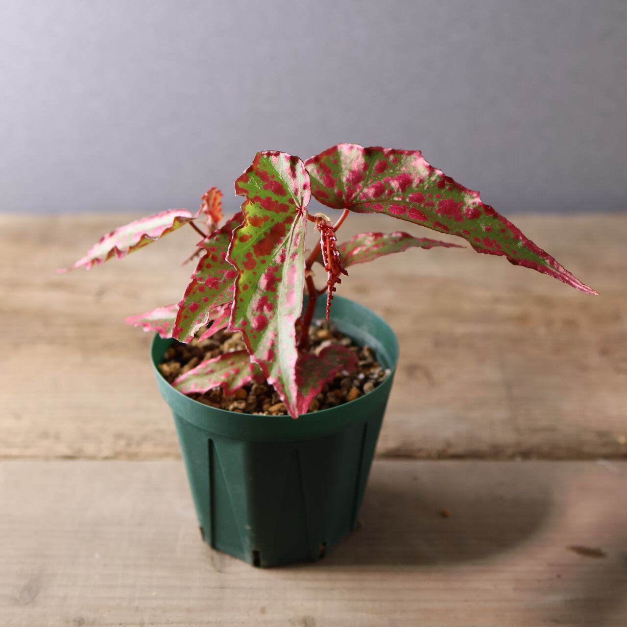葉は細身ながら個体によって斑点の出方が異なり、赤みの強さやコントラストが楽しめるのも魅力。コレクション性が高く、まさに“一点もの”の存在感を放つベゴニアです。