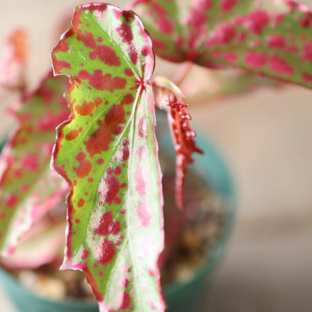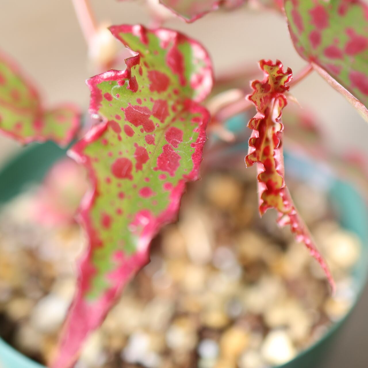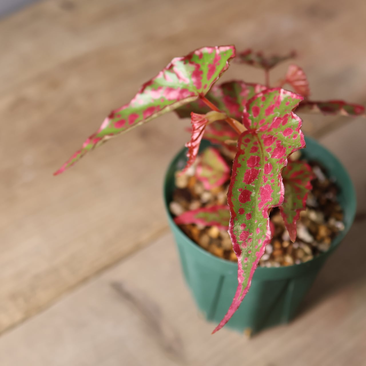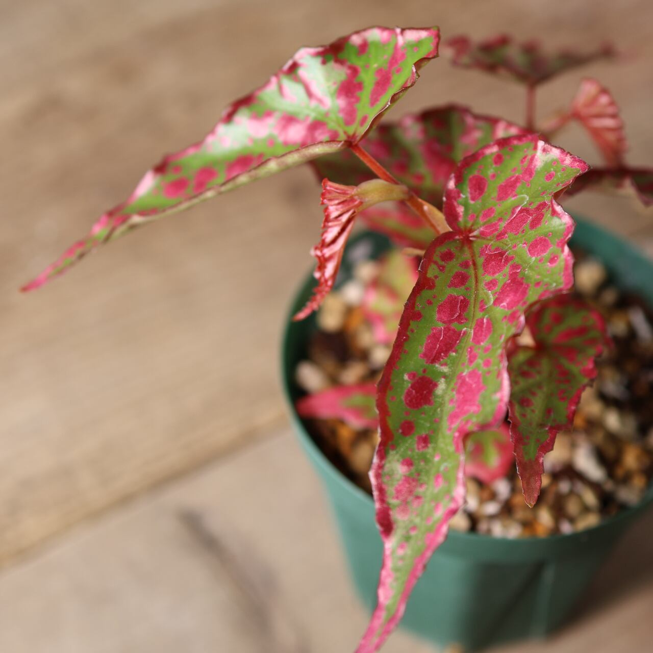 葉は細身ながら個体によって斑点の出方が異なり、赤みの強さやコントラストが楽しめるのも魅力。コレクション性が高く、まさに“一点もの”の存在感を放つベゴニアです。